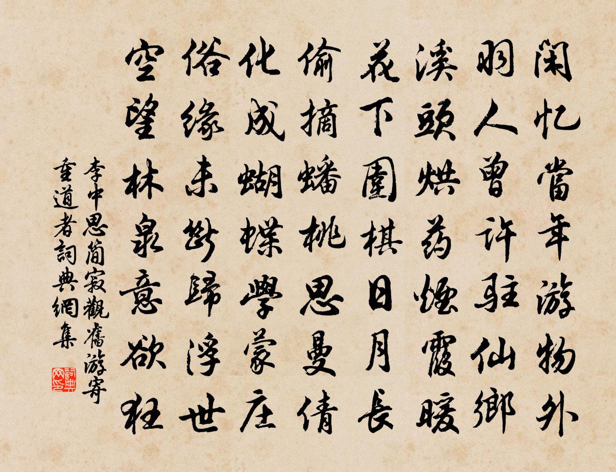 詩詞名句歷史字典書法欣賞書法字典國語詞典說文解字康熙字典古漢語字典標 題 作 者 詩 句 思簡寂觀舊遊寄重道者作者:李中 朝代:唐代思簡寂觀舊遊寄重道者原文閒憶當年游物外,羽人曾許駐仙鄉。溪頭烘藥煙霞暖,花下圍棋日月長。偷摘蟠桃思曼倩,化成蝴蝶學蒙莊。俗緣未斷歸浮世,空望林泉意欲狂。詩詞問答問:思簡寂觀舊遊寄重道者的作者是誰?答:李中問:思簡寂觀舊遊寄重道者寫於哪個朝代?答:唐代問:思簡寂觀舊遊寄重道者是什麼體裁?答:七律李中思簡寂觀舊遊寄重道者書法欣賞思簡寂觀舊遊寄重道者書法作品注釋全唐詩:卷747-57詩詞推薦為師席李上捨去智壽四首衛涇〔宋代〕屢將大手占倫魁,槐市英聲早四馳。肯與鱣魴爭尺水,鵾鵬行矣化天池。和近思二首李彌遜〔宋代〕風帆十日轉長山,為送閒身到廣寒。明月峰巒人境外,溪聲一夜響前灘。梅花張道洽〔宋代〕天下無花白到梅,風前和我不塵埃。堎贈鶴骨霜中立,偃蹇龍身雪裡來。未許瓊花為行輩,定教玉蕊作輿台。夜深減字木蘭花陳三聘〔宋代〕殷勤舉白。昨夜東風猶有雪。莫恨春遲。曾見梅花第一枝。陰晴未決。早晚清明新火活。夢繞秦樓。欲趁歸潮上客殘年陸游〔宋代〕殘年光景易駸駸,屏跡江村不厭深。新麥熟時蠶上簇,晚鶯啼處柳成陰。短檠已負觀書眼,孤劍空懷許國心。惟有三衢道士鄭自得即天慶寮舍種梅疏池小亭扁日程公許〔宋代〕高人久已悟空花,養就丹田月月華。方丈有誰來晤語,橫枝相對慮無邪。雲開衡岳重回首,雪滿柯山遲到家。乞得頌古十首釋端裕〔宋代〕久雨不晴,雲門道劄。陽烏奮羽翰,蛟龍縮鱗鬣。為是時節,為是佛法。一箭兩垛謾猜量,眼裡瞳人眉搭颯。送僧歸舊隱周弼〔宋代〕自言歸去後,只在故山邊。紗帽臨溪盥,銅瓶傍水禪。晝閒松塔雨,春盡草堂煙。何故相拋舍,沉浮逐世緣。送孫莘老移知南京曾豐〔宋代〕稚年曾未睹風標,瀚海初聞拔俊髦。國子先生曾並席,蓬萊學士看揮毫。量涵萬頃滄溟闊,氣吐千尋太華高。述性寄題吳仁傑架閣玩芳亭楊萬里〔宋代〕洞庭波上木葉脫,巫山宅前野花發。子規啼殺不見人,空令千載憶靈均。春蘭九畹百畝蕙,自榮自落誰能佩。澤國和梁守錢諸貢士林季仲〔宋代〕右文逢新地,首善自神京。延及吳中士。威稱洛下英。我邦雖僻陋,此學號專精。耆舊風流在,山川氣象新。元侯題雪峰李洪〔宋代〕象骨峰前古道場,簡庵再到愈芬芳。地平雙徑崇宮殿,名壓三山有雪霜。栗棘金圈提祖令,奎文寶墨閟宸章。海昌題落葉司空曙〔唐代〕霜景催危葉,今朝半樹空。蕭條故國異,零落旅人同。颯岸浮寒水,依階擁夜蟲。隨風偏可羨,得到洛陽宮。送楊長史赴果州王維〔唐代〕褒斜不容幰,之子去何之。鳥道一千里,猿聲十二時。官橋祭酒客,山木女郎祠。別後同明月,君應聽子規。香山老惠兩貓鄭清之〔宋代〕殺活禪機本自由,順行逆用總先籌。伽梨親抱貍奴送,管是南泉是趙州。秋懷 其二王冕〔元代〕明月下西窗,窺我席東枕。枕中夢忽破,俄然轉淒凜。美人天一方,相見猶拾瀋。何時引金樽?開懷笑歌飲。七月八日小雨王洋〔宋代〕萬匯就槁死,一涼送生意。問誰犯炎威,用事得屏翳。始自長夏來,龍骨嘔四裔。平原暴槁乾,生火 * 燧。藉令清涼寺竹羅必元〔宋代〕清涼世界竹如雲,舊日君王愛此君。時代改遷龍變化,荒山啼鳥不堪聞。題林璞經屬平寇錄劉克莊〔宋代〕倏爾蜂窩起,俄然鼠首梟。果能歌競病,不枉事票姚。瘴嶺收氛祲,朝家賞爛焦。祝君深養勇,稍北有天驕。山居貽裴十二迪儲光羲〔唐代〕落葉滿山砌,蒼煙埋竹扉。遠懷青冥士,書劍常相依。霜臥眇茲地,琴言紛已違。衡陽今萬里,南雁將何歸。出徑名句推薦天長地久有時盡,此恨綿綿無絕期。白居易《長恨歌》 邂逅淇南,歲寒獨在,故人襟抱。王惲《水龍吟·送焦和之赴西夏行省》 綠葉素榮,紛其可喜兮。屈原《九章》 萬頃風濤不記蘇。雪晴江上麥千車。蘇軾《浣溪沙·萬頃風濤不記蘇》 樹柤梨橘柚者,食之則甘,嗅之則香;樹枳棘者,成而刺人。故君子慎所樹。韓非及後人《韓非子·外儲說左下》 燕子巢方就,盆池小,新荷蔽。杜安世《鶴沖天·清明天氣》 海水夢悠悠,君愁我亦愁。佚名《西洲曲》 煙霏雲斂;其容清明,天高日晶;歐陽修《秋聲賦》 遼東小婦年十五,慣彈琵琶解歌舞。李頎《古意》 何時倚虛幌,雙照淚痕乾。杜甫《月夜》