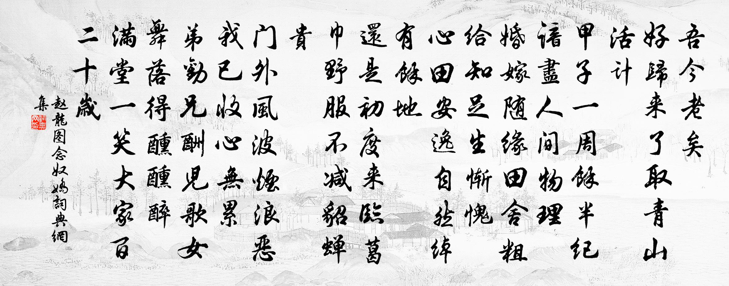 詩詞名句歷史字典書法欣賞書法字典國語詞典說文解字康熙字典古漢語字典標 題 作 者 詩 句 念奴嬌作者:趙龍圖 朝代:宋代念奴嬌原文吾今老矣。好歸來、了取青山活計。甲子一周餘半紀,諳盡人間物理。婚嫁隨緣,田舍粗給,知足生慚愧。心田安逸,自然綽有餘地。還是初度來臨,葛巾野服,不減貂蟬貴。門外風波煙浪惡,我已收心無累。弟勸兄酬,兒歌女舞,落得醺醺醉。滿堂一笑,大家百二十歲。詩詞問答問:念奴嬌的作者是誰?答:趙龍圖問:念奴嬌寫於哪個朝代?答:宋代問:念奴嬌是什麼體裁?答:詞趙龍圖念奴嬌書法欣賞念奴嬌書法作品詩詞推薦送除景說歸三衢高斯得〔宋代〕秋風吐商氣,庭樹慽以飛。美人悼時節,去意不可鞿。朋陰傲排盪,晨光弄熹微。靈修豈敢怨,浩蕩終難依。岐分次韻自序陳造〔宋代〕丁年拾芥視功名,可但紉蘭茹落英。深愧官曹無所補,向來志願幾餘成。分營伏臘耕淮壤,久絕音郵到帝京。尚有京口王同祖〔宋代〕晚風來候過淮舟,閒上南徐多景樓。落日寒城伴荒草,江南人指是瓜洲。臨江仙·暮蟬聲盡落斜陽毛文錫〔唐代〕暮蟬聲盡落斜陽,銀蟾影掛瀟湘。黃陵廟側水茫然。楚江紅樹,煙雨隔高唐。岸泊魚燈風颭碎,白萍遠散濃香。靈偈頌一百二十三首釋普度〔宋代〕一即三,三即一,達磨一曾離少室。父子雖親妙不傳,一花五葉成狼藉。海風吹起怒濤寒,截流過者腳不濕。道在玉麟堂上口占呈趙大資蘇泂〔宋代〕節旄彈壓萬旌旗,中使傳宣表睿知。重見相公官又長,宛然謙下蜀中時。小樓連苑(梅)楊樵雲〔宋代〕一枝斜墮牆腰,向人顫裊如相媚。是誰翦取,斷雲零玉,輕輕妝綴。不是幽人,如何能到,水邊沙際。又匆匆過了致政通議口號秦觀〔宋代〕秋空畫隼照新晴,符隱庵前小隊停。玉斝金醪通繾綣,鳳笙龍管入青冥。靚妝釃酒花侵席,寶獸呀香霧滿庭。太史示諸兒洪咨夔〔宋代〕道大兩儀小,身寡萬物眾,此心能砥柱,斯文即隆棟。書從羲孔來,字字濟世用。愈窮理逾邃,如探無底洞。有書臨場歌吳嘉紀〔清代〕掾豺隸狼,新例臨場;十日東淘,五日南梁。趨役少遲,場吏大怒;騎馬入草,鞭出灶戶。東家貰醪,西家割彘;約劉彥純會建安寺楊萬里〔宋代〕解後何時可?平章後月涼。前期來一夕,古寺作重陽。白酒多多載。黃花急急香。遣詩愁已遣,何況更連床。懷寄周元翁十首之賀鑄〔宋代〕周郎走王都,馬足塵翻波。賀老宦江夏,無人驚雀羅。出處躁靜間,奈此貧病何。平生解指誓,晚境忽婆娑。迫死相笑邵雍〔宋代〕白雲耕叟說方知,遙指西南舊殿基。更有笑人君不見,道傍橋是墓前碑。古鑒釋智圓〔宋代〕土蝕菱花有微竅,懸向秋堂光照耀。寫出人人妍醜姿,西施始免嫫母笑。述懷李頻〔唐代〕望月疑無得桂緣,春天又待到秋天。杏花開與槐花落,愁去愁來過幾年。京口熊遹〔宋代〕古郡如河內,雲藏鐵瓮城,禹疏渠絕峴,秦鑒塹分京。舊井朱方塞,新橋淥水橫。杏花元稹〔唐代〕常年出入右銀台,每怪春光例早回。慚愧杏園行在景,同州園裡也先開。初冬郊行范浚〔宋代〕空闊野雲疏,行行思鬱紆。露花啼晚菊,風葉舞高梧。日落牛羊下,天寒雁鶩呼。卻回南澗路,暝色擁蓬廬。次韻學士重陽雪中見招不赴前後十六首洪皓〔宋代〕憶孟懷陶亦已陳,杖藜弔影召魂神。假書豈產狸為士,帶箭寧思鶴是賓。臂上垂囊災可代,江邊錫宴食多辛。典衣送王十至褒中因寄尚書杜牧〔唐代〕闕下經年別,人間兩地情。壇場新漢將,煙月古隋城。雁去梁山遠,雲高楚岫明。君家荷藕好,緘恨寄遙程。名句推薦運籌策帷帳之中,決勝於千里之外。司馬遷《史記·高祖本紀》 光陰似箭,日月如梭吳承恩《西遊記·第八回》 三更燈火五更雞,正是男兒讀書時。顏真卿《勸學詩》 泥融飛燕子,沙暖睡鴛鴦。杜甫《絕句二首》 黃鸝驚夢破,青鳥喚春還。張弘范《臨江仙·憶舊》 願將腰下劍,直為斬樓蘭。李白《塞下曲六首》 盛年不重來,一日難再晨。陶淵明《雜詩·人生無根蒂》 積土成山,風雨興焉;荀子《勸學》 關山多雨雪,風水損毛衣。李遠《詠雁》 一言足以召大禍,故古人守口如瓶,惟恐其覆墜也王永彬《圍爐夜話·第四八則》