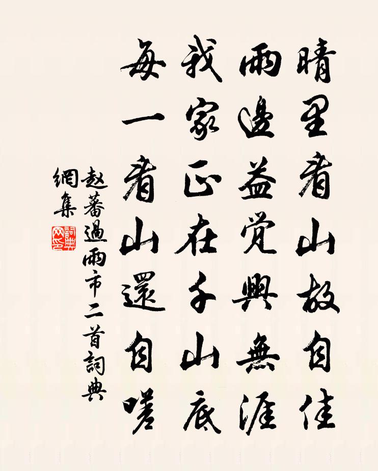 詩詞名句歷史字典書法欣賞書法字典國語詞典說文解字康熙字典古漢語字典標 題 作 者 詩 句 過雨市二首作者:趙蕃 朝代:宋代過雨市二首原文晴里看山故自佳,雨邊益覺興無涯。我家正在千山底,每一看山還自嗟。詩詞問答問:過雨市二首的作者是誰?答:趙蕃問:過雨市二首寫於哪個朝代?答:宋代趙蕃過雨市二首書法欣賞過雨市二首書法作品詩詞推薦緣對釋智愚〔宋代〕石休偃月夢魂冷,溪水寫真癯影清。平生矻矻自忘我,世外不知誰可盟。送別賈島〔唐代〕門外便伸千里別,無車不得到河梁。高樓直上百餘尺,今日為君南望長。吾廬東北皆修竹茂林羽族來棲者不可數計感而陸游〔宋代〕遶舍皆茂林,萬數棲鳥雀,詰旦輒爭鳴,未暝紛已泊。清陰交欲暗,丹實熟可啄。吾廬少人跡,媿爾肯見托。雖無次韻張提刑送行六絕洪咨夔〔宋代〕伊川去後幾多年,道在離堆沫水邊。身任茲文須著力,莫將人事屬之天。和主司王起(一作和主司酬周侍郎)蒯希逸〔唐代〕一振聲華入紫薇,三開秦鏡照春闈。龍門舊列金章貴,鶯谷新遷碧落飛。恩感風雷宜變化,詩裁錦繡借光輝。誰知蘭陵王 昨日奉候,知玉體已不恙,軒從姚燧〔元代〕之,上雪崖使君雪崖雪。玉壘浮雲變滅。蓬婆外、晴白界天,西嶺窗涵古今絕。秦山置下列。類媵姬姜娣侄。望太太常引姬翼〔元代〕幻塵擾擾夢魂飛。著腳履危機。省後自驚疑。猛跳出、樊籠制圍。草鞋藜杖,素冠蓬鬢,弱笠與蓑衣。雲水任東西訴衷情晏幾道〔宋代〕渚蓮霜曉墜殘紅。依約舊秋同。玉人團扇恩淺,一意恨西風。雲去住,月朦朧。夜寒濃。此時還是,淚墨書成,未解罷京局一首蘇籀〔宋代〕運水擔柴力分遭,挾持泥古小儒勞。浙潮屹起岷峨上,越巘遮蟠江海滔。一葉鷗湍尋婺女,半生瓢泛信魚舠。曩時奉和聖制早渡蒲津關張九齡〔唐代〕魏武中流處,軒皇問道回。長堤春樹發,高掌曙雲開。龍負王舟渡,人占仙氣來。河津會日月,天仗役風雷。東顧攜家游南山吳則禮〔宋代〕都梁山色楊柳青,天乞覉臣如許情。不嫌野褐垂垂好,故作春風踽踽行。幽花傍水有孤笑,好鳥隨人時一鳴。晚飯賦得秋日懸清光王維〔唐代〕寥廓涼天靜,晶明白日秋。圓光含萬象,碎影入閒流。迥與青冥合,遙同江甸浮。晝陰殊眾木,斜影下危樓。宋玉敖器之宅子落成劉克莊〔宋代〕臞翁卜築向東皋,小憩江湖半世勞。繞屋樹陰供杖屨,登樓山色發詩騷。客來賀廈杯行闊,市寫拋梁紙價高。 * 白鷗蘇泂〔宋代〕白鷗相見忽相猜,居士星星似我哉。習懶更無詩一句,澆愁惟有酒三杯。看梅倣雪行過去,玩月如霜弄影來。學得天童寺王應麟〔宋代〕十里青松接翠微,梵王宮殿白雲飛。鐘聲出岫客初到,月色滿庭僧未歸。偶有閒情依淨土,竟無塵慮瀆天機。明朝春日起晚蘇泂〔宋代〕春風散百物,和暖氣難清。晨衾四肢倦,欲起還不能。展轉臥成晏,起聽百鳥鳴。幸然無公事,且復寡經營。妻兒和李倅游武夷楊時〔宋代〕濃淡煙鬟半雨晴,溪光初借晚霞明。鰲頭湧出三峰秀,天漢融成一鑒清。枌社有誰藏舊牒,賓雲無處問遺聲。幔亭贈老僧顧逢〔宋代〕眾僧尊夏臘,靈岳遍曾登。渡水手中杖,行山溪畔藤。心空默是印,眉白雪為棱。自得巡方道,棲禪老未能。和江子玉二首胡宏〔宋代〕無奇試學居盤谷,誰信斷弦膠可續。湘天冷落數家村,曩時曾枉旌麾沐。潺湲階下碧溪橫,柳靜風微幽間足。知君六月十三日立秋楊萬里〔宋代〕暑中剩喜立秋初,特地西風半點無。旋汲井花澆睡眼,灑將荷葉看跳珠。名句推薦樓上黃昏欲望休,玉梯橫絕月中鉤李商隱《代贈二首》 無為在歧路,兒女共沾巾。王勃《送杜少府之任蜀州 / 送杜少府之任蜀川》 時來天地皆同力,運去英雄不自由。羅隱《籌筆驛》 莫驚鷗鷺,四橋儘是,老子經行處。蘇軾《青玉案·送伯固歸吳中》 幾時能命駕,對酒落花前。賈島《清明日園林寄友人》 昔聞洞庭水,今上岳陽樓杜甫《登岳陽樓》 破帽遮顏過鬧市,漏船載酒泛中流。魯迅《自嘲》 家童掃蘿徑,昨與故人期。錢起《谷口書齋寄楊補闕》 雨窗和淚搖湘管。意長箋短。許棐《後庭花·一春不識西湖面》 隨風潛入夜,潤物細無聲。杜甫《春夜喜雨》