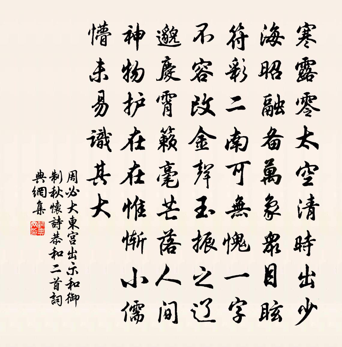 詩詞名句歷史字典書法欣賞書法字典國語詞典說文解字康熙字典古漢語字典標 題 作 者 詩 句 東宮出示和御製秋懷詩恭和二首作者:周必大 朝代:宋代原文寒露零太空,清時出少海。昭融備萬象,眾目眩符彩。二南可無愧,一字不容改。金聲玉振之,遼邈慶霄籟。毫芒落人間,神物護在在。惟慚小儒懵,未易識其大。詩詞問答問:《東宮出示和御製秋懷詩恭和二首》的作者是誰?答:周必大問:該詩寫於哪個朝代?答:宋代書法欣賞東宮出示和御製秋懷詩恭和二首書法作品詩詞推薦湘潭道中即事二首劉克莊〔宋代〕敗絮龍鍾擁病身,十分寒事在湘濱。若非野店黏官曆,不記今朝是立春。寄王正叔王令〔宋代〕形骸飫饜城市勞,思得遠去與俗逃。借來馬病行欲到,著鞭迫急翻奔跳。連綿半日走十堠,急雨隨濕衣與袍。到家寄遠其八李白〔唐代〕憶昨東園桃李紅碧枝。與君此時初別離。金瓶落井無訊息。令人行嘆復坐思。坐思行嘆成楚越。春風玉顏畏銷歇。南州行徐延壽〔唐代〕搖艇至南國,國門連大江。中洲西邊岸,數步一垂楊。金釧越溪女,羅衣胡粉香。織縑春卷幔,采蕨暝提筐。弄瑟革轍二門釋重顯〔宋代〕德雲閒古錐,幾下妙峰頂。喚他癡聖人,擔雪共填井。行香子蘇軾〔宋代〕清夜無塵,月色如銀。酒斟時,須滿十分。浮名浮利,虛苦勞神。嘆隙中駒,石中火,夢中身。雖抱文章,開口誰獨登南樓兼懷嚴聖幾俞若晦章甫〔宋代〕城外江山好,樓前市井喧。登高明遠目,直北望中原。濟世原無策,傷心不忍言。唯余憂國淚,還共水潺湲。挽孫少卿四首陳淳〔宋代〕聖主更新大化年,趨朝正預拔茅連。青華上廁郎星列,近密光陪卿月聯。垂躡從班提從橐,遽萌歸興乞歸田。至今宴清都袁去華〔宋代〕暮雨消煩暑。房櫳□、頓覺秋意如許。天高雲杳,山橫紺碧,桂華初吐。空庭靜掩桐陰,更苒苒、流螢暗度。記那南鄉子 登京口北固亭有懷辛棄疾〔宋代〕何處望神州?滿眼風光北固樓。千古興亡多少事?悠悠!不盡長江滾滾流。年少萬兜鍪,坐斷東南戰未休。天下英鷓鴣天蔡楠〔宋代〕病酒厭厭與睡宜。珠簾羅幕卷銀泥。風來綠樹花含笑,恨入西樓月斂眉。驚瘦盡,怨歸遲。休將桐葉更題詩。不知積雨二首蘇轍〔宋代〕山雨無時歇,江波上岸流。泥深未免出,橋斷更堪憂。房淺鄰糟瓮,宵寒攬絮裘。朝來勢未已,歸路恐操舟。微陽送秘省虞校書赴虞鄉丞岑參〔唐代〕花綬傍腰新,關東縣欲春。殘書厭科斗,舊閣別麒麟。虞坂臨官舍,條山映吏人。看君有知己,坦腹向平津。東關陸游〔宋代〕雲蹙魚鱗襯夕陽,放翁系纜水雲鄉。一筇疾步人驚健,斗酒高歌自笑狂。風暖市樓吹絮雪,蠶生村舍採桑黃。東阡寄題福州程進道止戈堂二首李彌遜〔宋代〕不識威名擅漢廷,雲仍今復見材卿。萬家桃李栽培盛,千里妖氛卻掃清。羽扇綸巾聊自適,風聲鶴唳已魂驚。向來臨江仙辛棄疾〔宋代〕逗曉鶯啼聲昵昵,掩關高樹冥冥。小渠春浪細無聲。井床聽夜雨,出蘚轆轤青。碧草旋荒金谷路,烏絲重記蘭亭。九日用靖節己酉歲韻趙蕃〔宋代〕宿雨曉未止,紛紛雲氣交。秋令迫悽厲,草木無多凋。去年當茲晨,採菊逾山高。晚上寶公塔,徘徊意乾霄。今年游南園次傍花隨柳句熊禾〔宋代〕憂世心衰且樂天,不妨飛詠此雲川。天高地下有千載,物換人非無百年。僮諭吳錫疇〔宋代〕小隱生涯無別事,護持蓑笠傍鷗沙。清泉頻注吟邊硯,活火隨煎飯後茶。趁早須來添鶴料,便忙也去看梅花。焚香贈孫尉姑蘇紫石銚孫有詩次韻虞儔〔宋代〕吳儂生長水與雲,不採蓮花拔蒲根。窮山鑿石出奇怪,顛坑仆谷無寒溫。宣和倖臣以佞進,橫江花石如雲屯。造化名句推薦亂則國危,治則國安。荀子《荀子·王霸》 梅子留酸軟齒牙,芭蕉分綠與窗紗。楊萬里《閒居初夏午睡起》 疏影橫斜水清淺,暗香浮動月黃昏。林逋《山園小梅·其一》 吳台直下,緗梅無限,未放野橋香度。吳文英《永遇樂·探梅次時齋韻》 少事長,賤事貴,不肖事賢,是天下之通義也。荀子《荀子·仲尼》 鳳凰台上鳳凰游,鳳去台空江自流。李白《登金陵鳳凰台》 死生驚懼不入乎其胸,是故忤物而不懾。列子及其弟子《列子·黃帝》 驚風亂颭芙蓉水,密雨斜侵薜荔牆。柳宗元《登柳州城樓寄漳汀封連四州》 君子之心事,天青日白,不可使人不知洪應明《菜根譚·概論》 去年元夜時,花市燈如晝。歐陽修《生查子·元夕》