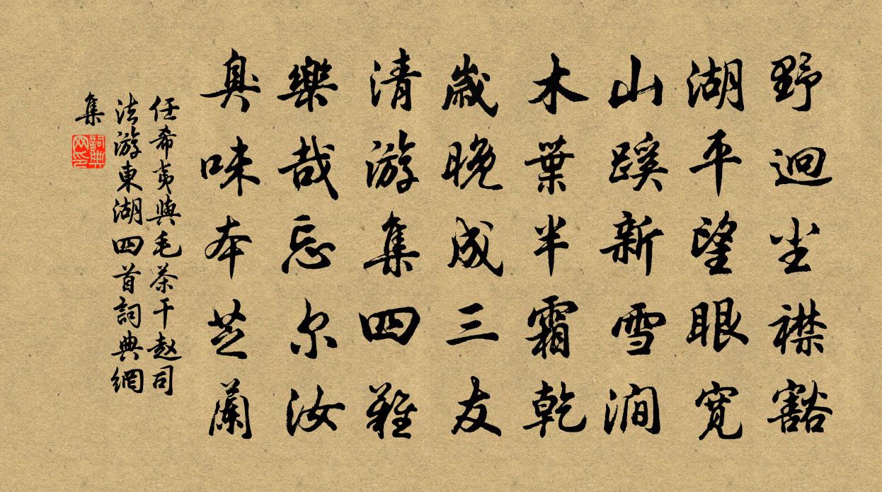 詩詞名句歷史字典書法欣賞書法字典國語詞典說文解字康熙字典古漢語字典標 題 作 者 詩 句 與毛茶乾趙司法游東湖四首作者:任希夷 朝代:宋代與毛茶乾趙司法游東湖四首原文野迥塵襟豁,湖平望眼寬。山蹊新雪澗,木葉半霜乾。歲晚成三友,清游集四難。樂哉忘爾汝,臭味本芝蘭。詩詞問答問:與毛茶乾趙司法游東湖四首的作者是誰?答:任希夷問:與毛茶乾趙司法游東湖四首寫於哪個朝代?答:宋代任希夷與毛茶乾趙司法游東湖四首書法欣賞與毛茶乾趙司法游東湖四首書法作品詩詞推薦達磨贊釋崇岳〔宋代〕鳳凰城闕,不通水泄。少室岩前,話作兩橛。賺它人家男女,開眼喚龜作鱉。次韻劉景文登鄭王台見思五首黃庭堅〔宋代〕茗花浮曾坑,酒泛酌宜城。路尋西九曲,人似漢三明。千戶非無相,五言空有聲。何時郭池晚,照影寫閒情。頌證道歌證道歌釋印肅〔宋代〕利物應機終不吝,毗耶假說眾生病。眾生了病即通光,領取舊持元本柄。自瀼西荊扉且移居東屯茅屋四首杜甫〔唐代〕白鹽危嶠北,赤甲古城東。平地一川穩,高山四面同。煙霜淒野日,粳稻熟天風。人事傷蓬轉,吾將守桂叢。東屯偈頌一百一十七首釋紹曇〔宋代〕截流機,分涇渭。清濁淺深,窮源倒底。三腳驢子弄蹄行,踏過何曾沾著水。芝峰家醜外揚,也是碓坊洿米。低聲近村民舍小飲陸游〔宋代〕秋風吹細雨,蕭然濯炎熾。老夫疾頓平,甘食仍熟寐。春物財幾何,搖落已復至。昔人喻死生,謂若屈伸臂。愚公興慶池禊宴趙濟〔宋代〕撫封占清境,禊宴協良辰。物態隨春秀,歌聲洽政淳。擷芳尋陌綺,泛棹擊波鱗。天幸陪開府,非才愧席賓。松蘇軾〔宋代〕依依古松子,鬱郁綠毛身。每長須成節,明年漸庇人。和戴解元雄飛瑞香二首吳芾〔宋代〕芳心似與春風約,絕艷還宜曉日籠。雖謝幽人持贈我,對花無奈憶山中。玉樹後庭花(般涉調)張先〔宋代〕寶床香重春眠覺。魫窗難曉。新聲麗色千人,歌后庭清妙。青驄一騎來飛鳥。靚妝難好。至今落日寒蟾,照台城秋春寒陸游〔宋代〕漁艇水流去,柴門風自開。余寒為醉地,多病作慵媒。沙草鋤還出,鷗群去復來。流年殊袞袞,殘鬢不禁催。資殿清惠陳公哀詩三首劉克莊〔宋代〕端平元祀王正月,我與公同被特招。甲午英游小元佑,庚申景運再陳橋。可憐轉枕成春夢,猶憶聯鞍趁早朝。若見渡江秋怨二首權德輿〔唐代〕秋江平,秋月明,孤舟獨夜萬里情。萬里情,相思遠,人不見兮淚滿眼。渡秋江兮渺然,望秋月兮嬋娟。色如練,湖口晁補之〔宋代〕彭蠡宮亭浸全楚,號呼噴吐出喉中。此間曠盪無窮水,何處還容地火風。漢陽即事儲光羲〔唐代〕楚國千里遠,孰知方寸違。春遊歡有客,夕寢賦無衣。江水帶冰綠,桃花隨雨飛。九歌有深意,捐佩乃言歸。題昭應王明府溪亭趙嘏〔唐代〕靖節何須彭澤逢,菊洲松島水悠溶。行人自折門前柳,高鳥不離溪畔峰。曉渭度檐帆的的,晚原含雨樹重重。軒車題余公亭強至〔宋代〕公自披榛上築城,以公題榜壯圖經。名佳應與溪山久,地勝渾疑草木靈。到喜琴樽能滿意,退嫌圭組只勞形。異時越中言事二首(鹹通八年琅琊公到任後作)方乾〔唐代〕異術閒和合聖明,湖光浩氣共澄清。郭中雲吐啼猿寺,山上花藏調角城。香起荷灣停棹飲,絲垂柳陌約鞭行。遊人贈黃藻二章許月卿〔宋代〕星邑唐詩韻一天,參軍生死別經年。君來佳句賓朋誦,我願世科昆弟傳。別語明晨繞朝策,秋風來歲祖生鞭。難兄西江月(琵琶)曹勛〔宋代〕弦泛龍香細撥,聲回花底鶯雛。低眉信手巧工夫。猶帶巫煙楚雨。人占東風秀色,花籠寶髻真珠。錦絛金鳳要人扶名句推薦河橋送人處,涼夜何其。周邦彥《夜飛鵲·河橋送人處》 豈曰無衣?與子同袍。佚名《秦風·無衣》 翻被梨花冷看,人生苦戀天涯。張炎《朝中措·清明時節》 以餌取魚,魚可殺;以祿取人,人可竭;以家取國,國可拔;以國取天下,天下可畢。姜子牙《六韜·文韜·文師》 三五年時三五月,可憐杯酒不曾消。黃景仁《綺懷》 商女不知亡國恨,隔江猶唱後庭花。杜牧《泊秦淮》 擬泛煙中片葉,但兩湖佳處,任風吹泊徐燦《念奴嬌·西湖雨感次素庵韻》 賞心樂事共誰論?花下銷魂,月下銷魂。唐寅《一剪梅·雨打梨花深閉門》 笑綠鬟鄰女,倚窗猶唱,夕陽西下。蔣捷《女冠子·元夕》 孤燈寒照雨,濕竹暗浮煙。司空曙《雲陽館與韓紳宿別》