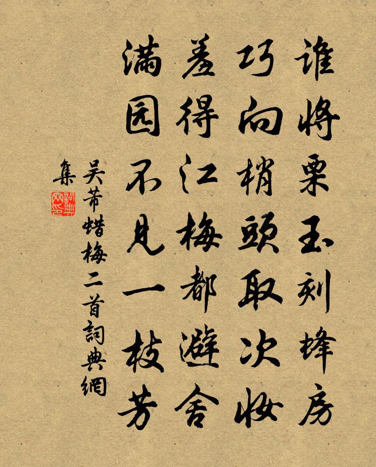 詩詞名句歷史字典書法欣賞書法字典國語詞典說文解字康熙字典古漢語字典標 題 作 者 詩 句 蠟梅二首作者:吳芾 朝代:宋代蠟梅二首原文誰將栗玉刻蜂房,巧向梢頭取次妝。羞得江梅都避舍,滿園不見一枝芳。詩詞問答問:蠟梅二首的作者是誰?答:吳芾問:蠟梅二首寫於哪個朝代?答:宋代吳芾蠟梅二首書法欣賞蠟梅二首書法作品詩詞推薦觀我四首 老張問陶〔清代〕中年歲月渺前生,變盡孩提古性情。猶剩頹光戀兒女,也循常格到公卿。飛花墮溷春難挽,瞎馬臨池夜可驚。幾個寄徐文淵徐照〔宋代〕別君一百一十日,喜聽人傳八句詩。只在鄰州難得見,卻思前任遠相隨。分名丹荔畫成軸,出處子魚糟過時。近日頌古二十八首釋道川〔宋代〕丙丁童子來求火,再問炎炎燎面門。過現未來三世佛,不離其中 * 。入藍關趙嘏〔唐代〕微煙已辨秦中樹,遠夢更依江上台。看落晚花還悵望,鯉魚時節入關來。陳湯卿致紹梅方岳〔宋代〕林下風流自一家,縱施朱亦不奢華。冷香猶帶灞橋雪,不比春風桃杏花。送從子令憲西歸魏了翁〔宋代〕自爾南來歲再周,新功培養氣揚休。且留數月須多益,歸妹愆期母所憂。八月大風大水釋居簡〔宋代〕十日溪頭鷁退飛,相逢那暇問雄雌。不如二月春風好,草木無情亦去思。禪房十事戒力釋紹曇〔宋代〕惡鉗鎚下番身,未必鋒芒發露。不惟斬得貓兒,也解煞佛煞祖。和彥達胡寅〔宋代〕扶藤有興即東西,不用花驄向月啼。閒看浮雲倚危嶠,靜臨流水瞰寒溪。過頻幸樂雞豚社,歸暮何憂虎豹蹊。肯似甘州子顧夐〔唐代〕一爐龍麝錦帷傍,屏掩映,燭熒煌。禁樓刁斗喜初長,羅薦繡鴛鴦。山琴上,私語口脂香。每逢清夜與良晨,多悵送沈先輩尉昭應張喬〔唐代〕餘才不廢詩,佐邑喜閒司。丹陛終須去,青山未可期。葉凋溫谷晚,雲出古宮遲。若草東封疏,君王到有時。和謝吏部鐵字韻三十四首呈幾叟儀曹四首鄧肅〔宋代〕嶺雲去天一握耳,取死一分山下水。不辭舟車千里來,賴有陳蕃知孺子。當堂得酒觴故人,醉倒花前夜不嗔。我來上裴大夫二首貫休〔唐代〕我有一端綺,花彩鸞鳳群。佳人金錯刀,何以裁此文。我有白雲琴,朴斫天地精。俚耳不使聞,慮同眾樂聽。指指紅梅陳景沂〔宋代〕色異味同失主張,厭寒附暖逐群芳。當知不改冰霜操,戲學陶家艷冶妝。全州呂農簿輓詩三首方回〔宋代〕先公與進時,早誦小坡詩。晚節遭多難,耆年對耄期。家貧從俗笑,國破任身危。後死元非福,前途未可知。子進示懷玉詩卷有歸途見懷恨不同游二詩次韻趙蕃〔宋代〕望壓大江東,茲峰獨著雄。潛珍伏其下,神畫隱於中。舊俗多龐說,因公得髓窮。從今逢有問,身與到山同。贈成容若陳維崧〔清代〕丹鳳城南路。看紛紛、崔盧門第,鄒枚詩賦。獨炙鵝笙潛趁拍,花下酒邊閒譜。已吟到、最銷魂處。不值一錢張三同官約賦紅梅成五十六字曹彥約〔宋代〕淡中著色似狂顛,心與梅同跡不然。奪我焉支寧免俗,豈無膏沐獨爭先。辨桃認杏何人拙,壓雪欺霜政自妍。只恐蝶戀花晏殊〔宋代〕南雁依稀回側陣。雪霽牆陰,偏覺蘭牙嫩。中夜夢余消酒困。爐香卷穗燈生暈。急景流年都一瞬。往事前歡,未免和答魏道輔寄懷十首黃庭堅〔宋代〕赤豹負文章,歲晚智剞劂。渴飲南山霧,飢食西山蕨。封狐托脂澤,眉頰頗秀髮。時時一樽酒,婆娑弄風月。名句推薦積於不涸之倉者,務五穀也管仲《管子·牧民》 人惡人怕天不怕,人善人欺天不欺。佚名《增廣賢文·上集》 萬物迎春送殘臘,一年結局在今宵。戴復古《除夜》 浮雲柳絮無根蒂,天地闊遠隨飛揚。韓愈《聽穎師彈琴》 道隱於小成,言隱於榮華。莊子《莊子·內篇·齊物論》 兒大詩書女絲麻,公但讀書煮春茶。黃庭堅《送王郎》 晝短苦夜長,何不秉燭游!佚名《生年不滿百》 辛苦遭逢起一經,干戈寥落四周星。文天祥《過零丁洋》 江漢思歸客,乾坤一腐儒。杜甫《江漢》 法莫如顯,而術不欲見韓非及後人《韓非子·難三》