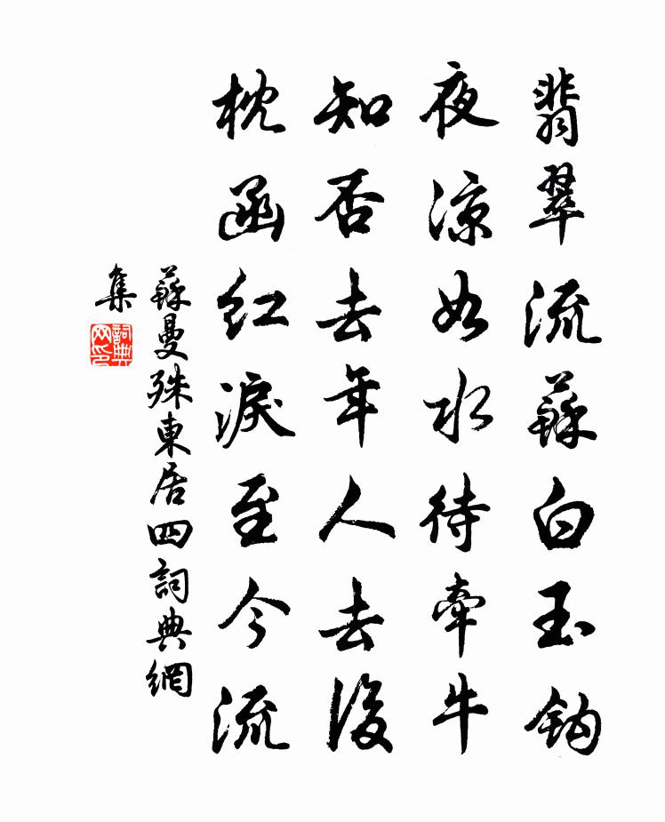 詩詞名句歷史字典書法欣賞書法字典國語詞典說文解字康熙字典古漢語字典標 題 作 者 詩 句 東居 四作者:蘇曼殊 朝代:近現代東居 四原文翡翠流蘇白玉鉤,夜涼如水待牽牛。知否去年人去後,枕函紅淚至今流。詩詞問答問:東居 四的作者是誰?答:蘇曼殊問:東居 四寫於哪個朝代?答:近現代書法欣賞東居 四書法作品詩詞推薦新霜感梅堯臣〔宋代〕前日衣上露,今日衣上霜。我母魂何之,膏火麋我腸。隔棺三寸地,如在萬里鄉。嚎呼不聞聲,飲食空置傍。昔時漁家傲歐陽玄〔元代〕八月都城新過雁。西風偏解驚遊宦。十載辭家衣線綻。清宵半。家家搗練砧聲亂。等待中秋明月玩。客中只作家中次韻送友人過山陰郡時夜別於舟中張元乾〔宋代〕草草杯盤燦燭光,故人相對水雲鄉。濤江君去訪秦望,丘壑我歸為楚狂。活國未逢三折臂,憂時空轉九回揚。絕憐與耿湋水亭詠風聯句顏真卿〔唐代〕清風何處起,拂檻復縈洲。 ——裴幼清回入飄華幕,輕來疊晚流。 ——楊憑桃竹今已展,羽翣且從收。 ——和鄭閎中仙居十一首陳襄〔宋代〕我愛仙居好,園池日退居。馴禽來鶴鶴,野水進徐徐。草樹通樵採,桑麻有老鋤。猶言民未樂,更待寢刑書。水調歌頭葛長庚〔宋代〕一個江湖客,萬里水雲身。鳥啼春去,煙光樹色正黃昏。洞口寒泉漱石,嶺外孤猿嘯月,四顧寂無人。夢魂歸碧落自述王柏〔宋代〕身坐眾香國, * 詩思新。一貧雖累我,此興未輸人。陋巷誰為侶,寒窗不染塵。五言盟四友,筆下屯生春。初與元九別後忽夢見之及寤而書適至兼寄桐花詩…此寄白居易〔唐代〕永壽寺中語,新昌坊北分。歸來數行淚,悲事不悲君。悠悠藍田路,自去無訊息。計君食宿程,已過商山北。昨夜賀新郎(次辛稼軒韻寄呈)佚名〔宋代〕邂逅非專約。紀當年、林堂對竹,艷歌春酌。一笑乘鸞明月影,餘事丹青麟閣。待宇宙、長繩穿卻。念我中原空有宣仁聖烈皇后輓辭五首蘇頌〔宋代〕六月因山葬,三年率土哀。風雲金殿暗,霧露石門開。羽衛環神岳,衣冠返帝台。悲涼九虞禮,不見大安回。送子虡吳門之行陸游〔宋代〕相送何由插羽翰,淡煙微雨暗江乾。孤懷最怯新春別,病骨難禁昨夜寒。尊酒汝寧嫌魯薄?釜羹翁自絮吳酸,此詩寒食日晨炊姜家林,初程之次日也楊萬里〔宋代〕百五佳辰匹似無,合教追節卻離居。萬家寒食初歸鷰,一老春衫政寒驢。耄柳已僧何再發,孺槐方爪可犀蔬。兒書幼嶺陳師道〔宋代〕外家英俊場,季氏不好弄。用意丘壑間,頗以石自奉。誰言拳握間,意作萬牛重。岱宗小天下,不辦一席用。漁村雜句十首薛嵎〔宋代〕白雲相顧尚依依,十載江湖負宿知。時事未容輕所學,山中依舊只吟詩。陳先輩故居皮日休〔唐代〕杉桂交陰一里余,逢人渾似洞天居。千株橘樹唯沽酒,十頃蓮塘不買魚。藜杖閒來侵徑竹,角巾端坐滿樓書。襄陽滿庭芳何夢桂〔宋代〕燕子芹乾,龍孫籜老,綠陰深鎖林塘。午風庭院,人試薄羅裳。數盡落紅飛絮,摘青梅、煮酒初嘗。重門靜,一簾齊天樂姚雲文〔宋代〕柳花引過橫塘路,縈迴曲蹊通圃。插槿編籬,挨梅砌石,次第海棠成塢。吟筇獨拄。待尋訪斜橋,水邊窺戶。已約偈公六十五首釋鹹傑〔宋代〕即心即佛也揖出,非心非佛也揖出。地轉天回豈等閒,即知此物非他物。以此顯追崇,決定當超越。次回陰隲保家送見上人歸劍州釋普度〔宋代〕見處分明得處親,直於劍刃上翻身。連雲棧閣重回首,已是昔人非昔人。四月上澣日同寮約游西湖十絕張鎡〔宋代〕自得城隅水弱居,西湖幽討句全疎。今朝掩簿抽身出,更向誰邊不一書。名句推薦紫菊氣,飄庭戶,晚煙籠細雨。李煜《謝新恩·冉冉秋光留不住》 桃花三十六陂,鮫宮睡起,嬌雷乍轉。吳文英《瑞龍吟·德清清明競渡》 日習則學不忘,自勉則身不墮徐幹《中論·上卷·治學》 壯志飢餐胡虜肉,笑談渴飲匈奴血。岳飛《滿江紅·寫懷》 萬歲山前珠翠繞,蓬壺殿里笙歌作岳飛《滿江紅·登黃鶴樓有感》 洞庭一夜無窮雁,不待天明盡北飛。李益《春夜聞笛》 無端更渡桑乾水,卻望并州是故鄉。劉皂《旅次朔方 / 渡桑乾》 輪台九月風夜吼,一川碎石大如斗,隨風滿地石亂走。岑參《走馬川行奉送出師西征 / 走馬川行奉送封大夫出師西征》 高山仰止,景行行止。佚名《車舝》 歌聲未盡處,先淚零周邦彥《綺寮怨·上馬人扶殘醉》