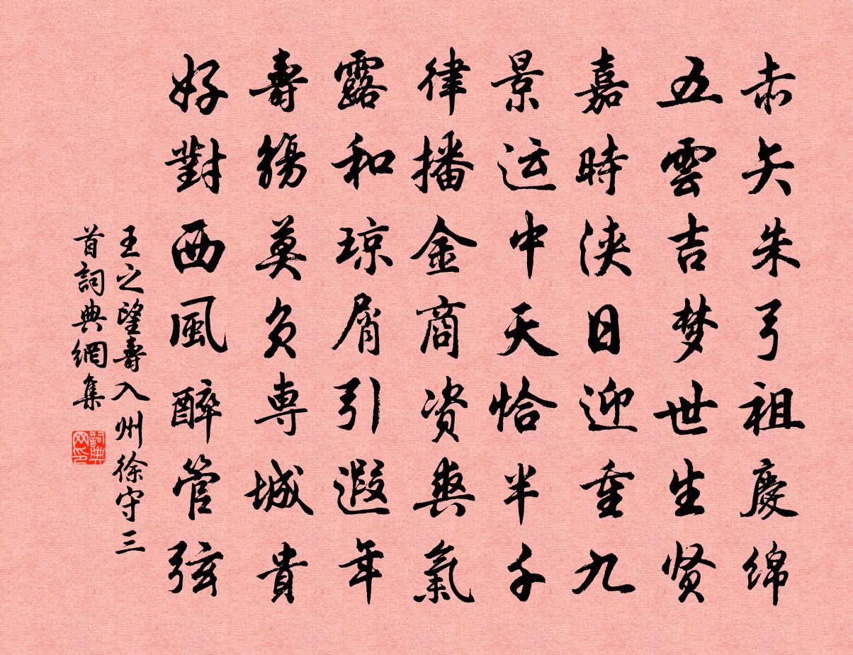 詩詞名句歷史字典書法欣賞書法字典國語詞典說文解字康熙字典古漢語字典標 題 作 者 詩 句 壽入州徐守三首作者:王之望 朝代:宋代壽入州徐守三首原文赤矢朱弓祖慶綿,五雲吉夢世生賢。嘉時浹日迎重九,景運中天恰半千。律播金商資爽氣,露和瓊屑引遐年。壽觴莫負專城貴,好對西風醉管弦。詩詞問答問:壽入州徐守三首的作者是誰?答:王之望問:壽入州徐守三首寫於哪個朝代?答:宋代王之望壽入州徐守三首書法欣賞壽入州徐守三首書法作品詩詞推薦潔牲謝回響龍廟予不及往董嗣杲〔宋代〕龍宮蘊特異,精禱通萬靈。昭著二百年,錫封專朝廷。去年偕宰公,投誠涕欲零。驅車入松扉,雨勢如建瓴。仰高一枝花·詠喜雨張養浩〔元代〕用盡我為國為民心,祈下些值金值玉雨,數年空盼望,一旦遂沾濡,喚省焦枯,喜萬象春如故,恨流民尚在途,留和潘叔治題劉道士房畫薛稷六鶴圖六首其四舞梅堯臣〔宋代〕如逢僊圃風,飄颻奮雙翅。拊節餘欲助,和歌誰爾類。但看矯然姿,固於流雪異。偈頌二十五首釋如淨〔宋代〕天童仲冬第一句,槎槎牙牙老梅樹。忽開花,一花兩花三四五花無數花。清不可夸,香不可夸。散作春容吹草木,武刃丞宅同朴翁詠牽牛姜夔〔宋代〕青花綠葉上疏籬,別有長條竹尾垂。老覺淡妝差有味,滿身秋露立多時。雨中作李覯〔宋代〕群陰侮陰德,雨陣春嘈嘈。白曉慘成夜,瓦口生飛濤。凝雲列{左韋右肖},冷氣攢衣刀。徑鬧有松竹,庭臥唯蓬燕居十六首彭龜年〔宋代〕好毀非佳士,毋輕聽彼言。如人名父母,急去不須聞。送陳尉別二首李呂〔宋代〕試吏誰雲百寮底,長材元是萬夫雄。錐刀壟斷焉能較,涇渭區分獨至公。顧我每慚天下拙,辱君見許古人風。明年挽侍講先生王夫人詩二首陳舜俞〔宋代〕蘭陔堂上此歸全,松柏山頭有舊阡。我得遐齡幾九十,人依絳帳昔三千。病時太守和湯藥,沒後諸生侍几筵。善化山中方乾〔唐代〕散拙亦自遂,粗將猿鳥同。飛泉高瀉月,獨樹迥含風。果落盤盂上,雲生篋笥中。未甘明聖日,終作釣漁翁。夢玉人引李甲〔宋代〕漸東風暖,隴梅殘,霽雲碧。嫩草柔條,又回江城春色。乍促銀簽,便篆香紋蠟有餘跡。愁夢相兼,盡日高無力。句蘇壽〔宋代〕戴笠披蓑軍十萬,飢嗔飽喜客三千。出榆關劉著〔金代〕羽檄中原滿,萍流四海間。少時過桂嶺,壯歲出榆關。奇禍心如折,羈愁鬃巳斑。楚纍千萬億,知有幾人還。登廬山唐彥謙〔唐代〕五老峰巔望,天涯在目前。湘潭浮夜雨,巴蜀暝寒煙。泰華根同峙,嵩衡脈共聯。憑虛有仙骨,日月看推遷。虛谷志歸後賦十首方回〔宋代〕樂天在知命,行止豈人能。元亮歸廬阜,延之牧始興。時才宜政柄,老我只詩朋。何日攜君手,西湖共訪僧。念奴嬌(上德安王文甫生辰)石孝友〔宋代〕麥秋天氣,正玉杓斡暑,熏弦鳴律。浴佛生朝初過也,還數佳辰三日。筮水呈祥,夢熊葉慶,寶運符千一。太平朝觀徐復州家書畫七首趙蕃〔宋代〕蘇公書法自顏行,猶謂蔡公居第一。我窮頗亦類賈胡,筆勢翩翩疑可識。和鄒思道寄詠西湖熊瑞〔宋代〕畫橋楊柳不勝愁,萬縷千條俛碧流。問著翠華霜日事,人人只道好杭州。次酬胡編校賦竹屋劉黻〔宋代〕紫氣曾臨屋有光,老僧相對說修藏。貌癯漸覺衣冠古,交淡誰知道誼常。文類錦機君獨艷,才如襪線我無長。近來偈釋可勛〔宋代〕秋江煙島晴,鷗鷺行行立。不貪觀世音,爭知普門入。名句推薦晨興好擁向陽坐,晚出宜披踏雪行。白居易《新制綾襖成感而有詠》 大江流日夜,客心悲未央。謝朓《暫使下都夜發新林至京邑贈西府同僚》 荊江日落陣雲低,橫戈躍馬今何時。納蘭性德《送蓀友》 獨抱濃愁無好夢,夜闌猶剪燈花弄。李清照《蝶戀花·暖雨晴風初破凍》 幸遇三杯酒好,況逢一朵花新。朱敦儒《西江月·世事短如春夢》 素娥惟與月,青女不饒霜。李商隱《十一月中旬至扶風界見梅花》 槲葉落山路,枳花明驛牆。溫庭筠《商山早行》 雨里雞鳴一兩家,竹溪村路板橋斜。王建《雨過山村》 無人解,樹轉午陰涼舒頔《小重山·端午》 靖安宅里當窗柳,望驛台前撲地花。白居易《望驛台》