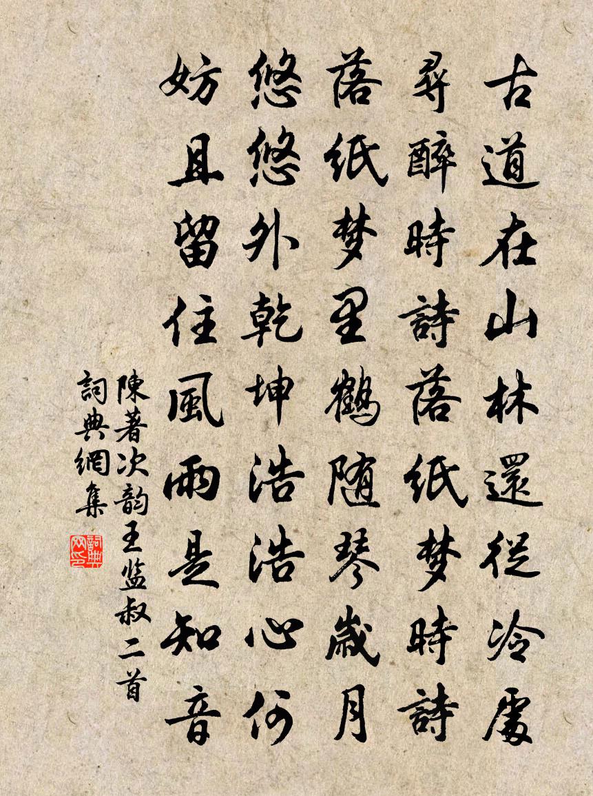 詩詞名句歷史字典書法欣賞書法字典國語詞典說文解字康熙字典古漢語字典標 題 作 者 詩 句 次韻王監叔二首作者:陳著 朝代:宋代次韻王監叔二首原文古道在山林,還從冷處尋。醉時詩落紙,夢時詩落紙,夢裡鶴隨琴。歲月悠悠外,乾坤浩浩心。何妨且留住,風雨是知音。詩詞問答問:次韻王監叔二首的作者是誰?答:陳著問:次韻王監叔二首寫於哪個朝代?答:宋代陳著次韻王監叔二首書法欣賞次韻王監叔二首書法作品詩詞推薦宿漁家劉威〔唐代〕竹屋清江上,風煙四五家。水園分芰葉,鄰界認蘆花。雨到魚翻浪,洲回鳥傍沙。月明何處去,片片席帆斜。悟南柯 本名南柯子 和常顯之王丹桂〔元代〕宴坐心恆適,幽居興可嘉。靜鳴天鼓漱雲芽。吐納綿綿,隨分保生涯。但解安時運,奚憂換物華。三山瓊路信非賒寄題廣州田諫議頤堂余靖〔宋代〕退食公堂暇,應無俗慮侵。簾開雙燕外,吏散百花陰。海域逍遙境,榮途淡泊心。政成先養正,惠愛及民深。布袋和尚頌岳珂〔宋代〕行也布袋,坐也布袋。放下布袋,多少自在。尋李逸人舊居於鵠〔唐代〕舊隱松林下,沖泉入兩涯。琴書隨弟子,雞犬在鄰家。茅屋長黃菌,槿籬生白花。幽墳無處訪,恐是入煙霞。渭陽佚名〔先秦〕我送舅氏,曰至渭陽。何以贈之?路車乘黃。我送舅氏,悠悠我思。何以贈之?瓊瑰玉佩。滕王閣朱復之〔宋代〕傑甚滕王閣,登臨思渺然。宿雲開北牖,秋水盡南天。帝子今何處,王童記獨傳。客懷無住著,浩蕩白鷗前。石頭答庾郎丹詩何遜〔南北朝〕高樹蔭樓密。細草綠成被。黃鸝隱葉飛。蛺蝶縈空戲。陰岑自爾悅。寂寥予罕寄。相如阻禁闈。何由從簡易。答吳伯固鄭獬〔宋代〕伯固讀我詩,掉頭吟不休。明日踵我門,作詩還相投。初讀頗怪駭,如錄萬鬼囚。筆墨又勁絕,涌紙花光流。想其溪行蔡襄〔宋代〕秋色已寥落,清溪才此行。船移酒杯側,魚得鱠刀鳴,日色浮兼動,風痕滅又生。從知隱者趣,不獨傲榮名。題大庾新樓呈鄭仲遠年契張九成〔宋代〕憶昔衡門不勝愁,忽驚甍棟半空浮。朝披爽氣山圍坐,夜發清吟月滿樓。公事早休簾迥晝,圜扉常靜草連溝。已聞東湖夜坐松間陳杰〔宋代〕夜深仍露坐,湖貢小迷藏。松月半身影,藕花三面香。雖忘入城府,終擬卜林塘。何日清逋賊,妖星漸不芒。古鏡詞艾性夫〔宋代〕人生兩瞳子,爛爛岩下電。見盡天下人,不見自己面。古哉容成侯,作我眼外眼。我老得君照,君老還我見。蘚花采芝趙文〔宋代〕晨登屋後山,采采山上芝。可憐松上雨,滴滴沾我衣。盈筐頗磊落,滿意持之歸。童子見我來,拍手共笑之。薄者雜詠八首上禮部李侍郎古劍劉長卿〔唐代〕龍泉閒古匣,苔蘚淪此地。何意久藏鋒,翻令世人棄。鐵衣今正澀,寶刃猶可試。倘遇拂拭恩,應知剸犀利。自渭南晚次華州司馬扎〔唐代〕前樓仙鼎原,西經赤水渡。火雲入村巷,余雨依驛樹。我行傷去國,疲馬屢回顧。有如無窠鳥,觸熱不得住。峨峨昨幸甚得見子玉教授丈得一論其說出於訂頑克度正〔宋代〕廣文人物世間無,兩眼晶熒照乘珠。拈出便應人嘆服,粹然議論到先儒。北山登高喻良能〔宋代〕九日紅茱紫菊催,相攜緩步上飛來。酒酣便有龍山趣,不用重尋戲馬台。寄報恩長老恭率翁戴復古〔宋代〕報恩千楹歸一炬,佛也不能逃劫數。寶坊化作瓦礫場,堪笑月庭來壘駢。率翁修造鳳樓手,第一能將無作有。神工領客賞梅吳芾〔宋代〕只擬花開把酒杯,南枝忽遞暗香來。徑須領客同清賞,莫待城頭吹落梅。名句推薦時靸雙鴛響,廊葉秋聲。吳文英《八聲甘州·靈岩陪庾幕諸公游》 今古長如白練飛,一條界破青山色。徐凝《廬山瀑布》 春水別來應到海,小松生命合禁霜李覯《秋晚悲懷》 知過必改,得能莫忘。周興嗣《千字文·全文》 愛之不以道,適所以害之也。司馬光《資治通鑑·晉紀十八》 不須更上新亭望,大不如前灑淚時。虞集《挽文丞相》 客自長安來,還歸長安去。李白《金鄉送韋八之西京》 守職而不廢,處義而不回。黃石公《素書·正道》 禍褔無不自己求之者。孟子《孟子·公孫丑章句上·第四節》 昔年多病厭芳尊,今日芳尊惟恐淺。錢惟演《木蘭花·城上風光鶯語亂》
