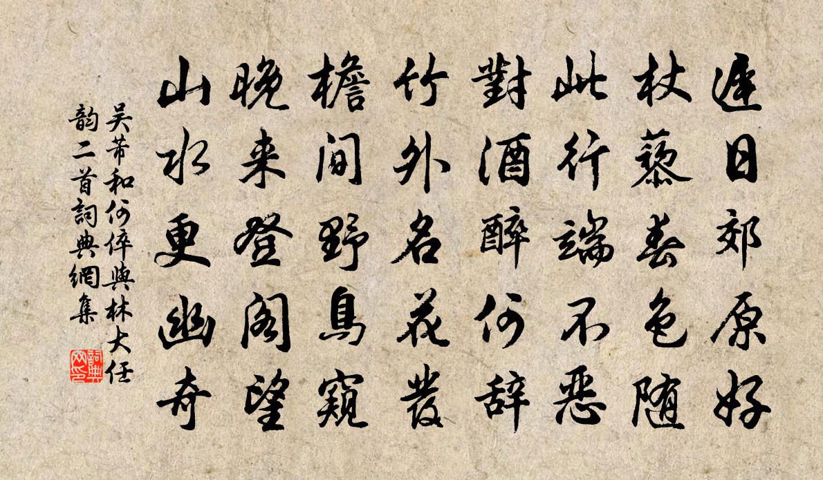 詩詞名句歷史字典書法欣賞書法字典國語詞典說文解字康熙字典古漢語字典標 題 作 者 詩 句 和何倅與林大任韻二首作者:吳芾 朝代:宋代和何倅與林大任韻二首原文遲日郊原好,杖藜春色隨。此行端不惡,對酒醉何辭。竹外名花發,檐間野鳥窺。晚來登閣望,山水更幽奇。詩詞問答問:和何倅與林大任韻二首的作者是誰?答:吳芾問:和何倅與林大任韻二首寫於哪個朝代?答:宋代吳芾和何倅與林大任韻二首書法欣賞和何倅與林大任韻二首書法作品詩詞推薦對雪高駢〔唐代〕六出飛花入戶時,坐看青竹變瓊枝。如今好上高樓望,蓋盡人間惡路岐。橫吹曲辭。折楊柳劉憲〔唐代〕沙塞三河道,金閨二月春。碧煙楊柳色,紅粉綺羅人。露葉憐啼臉,風花思舞巾。攀持君不見,為聽曲中新。休洗紅潘葛民〔宋代〕休洗紅,洗多紅色淺。不似妾挼藍,挼藍手先染。藍深如妾心,郎心紅不禁。去去趁春華,封侯早還家。願作兔絲寄題成都張宰壓雲樓二絕洪咨夔〔宋代〕氣如軻也生於義,道似參乎任以仁。乾蓋坤輿猶塞破,何難壓倒玉嶙峋。遺老齋絕句十二首蘇轍〔宋代〕避事已謝客,養性不看書。書中多感遇,掩卷輒長吁。和鮑守次韻林德祖十四首傅察〔宋代〕九萬鵬程舉翮輕,蚤年高譽滿江亭。曾分蘭省趨墀赤,行從荷囊拜瑣青。雅度最宜鏘玉佩,精忠不用綠沈屏。欲令和袁起岩郎中投贈七字二首楊萬里〔宋代〕故人一別兩相思,不但平生痛飲師。胸次五三真事業,筆端四六更歌詩。閉門覓句今無已,刻意傷春古牧之。臥雪題王岩起樂齋三首劉子翬〔宋代〕怪底愁端生不已,勞心逐事事無窮。陶然一點沖融趣,只在清虛淡泊中。擬古黃庚〔宋代〕山中怪物變,草木自四時,秋水照短髮,血氣日已衰。寒藤不知枯,青表上疏籬。繁陰縱有托,已迫風霜期。餘生金殿樂慢佚名〔宋代〕駕紫鸞軿。乘風縹緲遊仙。紅霓蘸影,近瑤池、鶴戲芝田。臨蕙圃、飲瓊泉。上蕭台、遙瞻九天。對真人蕊書親授板子磯張養重〔清代〕荻港東邊板子磯,秋高日見雨霏霏。荒城草長埋金鏃,廢壘沙深臥鐵衣。山上群鴉迎客舞,江邊孤雁背人飛。晚來送秘省虞校書赴虞鄉丞岑參〔唐代〕花綬傍腰新,關東縣欲春。殘書厭科斗,舊閣別麒麟。虞坂臨官舍,條山映吏人。看君有知己,坦腹向平津。涵空閣葉茵〔宋代〕浪說涵空未是空,一闌羅列幾巃嵷。世人若問空中景,此景從來是夢中。踏莎行 燒庵王哲〔元代〕數載辛勤,謾居劉蔣。庵中日日塵勞長。豁然真火瞥然開,便教燒了歸無上。奉勸諸公,莫生悒怏。我咱別有深深華亭百詠白龍潭許尚〔宋代〕神物幽潛地,滄滄水接空。不緣嘗應禱,誰識有殊功。早春尋李校書元稹〔唐代〕款款春風澹澹雲,柳枝低作翠櫳裙。梅含雞舌兼紅氣,江弄瓊花散綠紋。帶霧山鶯啼尚小,穿沙蘆筍葉才分。今朝井泉李呂〔宋代〕山溜碧泓澄,清甘歸色味。儻逢張又新,應不落第二。舟過黃田,謁龍母護應廟二首楊萬里〔宋代〕遠山相別忽相尋,水到黃田漸欲深。見說前頭山更好,且留好句未須吟。採桑子佚名〔宋代〕熔金脫得花鈿小,點綴瓊枝。月淡風微。露浥香肌自是奇。玉人呵手昂頭翦,纖鬢邊垂。似簇蜂兒。春入芳容不肯伏中熱不可過中夜起坐作詩寄五郎陸游〔宋代〕眾星若銀礫,老桂臥海底。中夜熱不解,病叟推枕起。悲蟲號草根,孤螢照野水。樹頭風急生,喘汗真一洗。追憶名句推薦殷勤花下同攜手。更盡杯中酒。美人不用斂蛾眉。葉夢得《虞美人·雨後同乾譽才卿置酒來禽花下作》 人情反覆,世路崎嶇。洪應明《菜根譚·概論》 何處寄想思,南風搖五兩。王維《送宇文太守赴宣城》 疏懶意何長,春風花草香。黃庭堅《菩薩蠻·半煙半雨溪橋畔》 矮紙斜行閒作草,晴窗細乳戲分茶。陸游《臨安春雨初霽》 獨舞紛如雪,孤飛曖似雲。陳子昂《詠主人壁上畫鶴寄喬主簿崔著作》 脫鞍暫入酒家壚,送君萬里西擊胡岑參《送李副使赴磧西官軍》 日暖泥融雪半消,行人芳草馬聲驕。杜牧《宣州送裴坦判官往舒州時牧欲赴官歸京》 誠知此恨人人有,貧賤夫妻百事哀。元稹《遣悲懷三首·其二》 阿香秋夢起嬌啼,玉女傳幽素。吳文英《燭影搖紅·越上霖雨應禱》