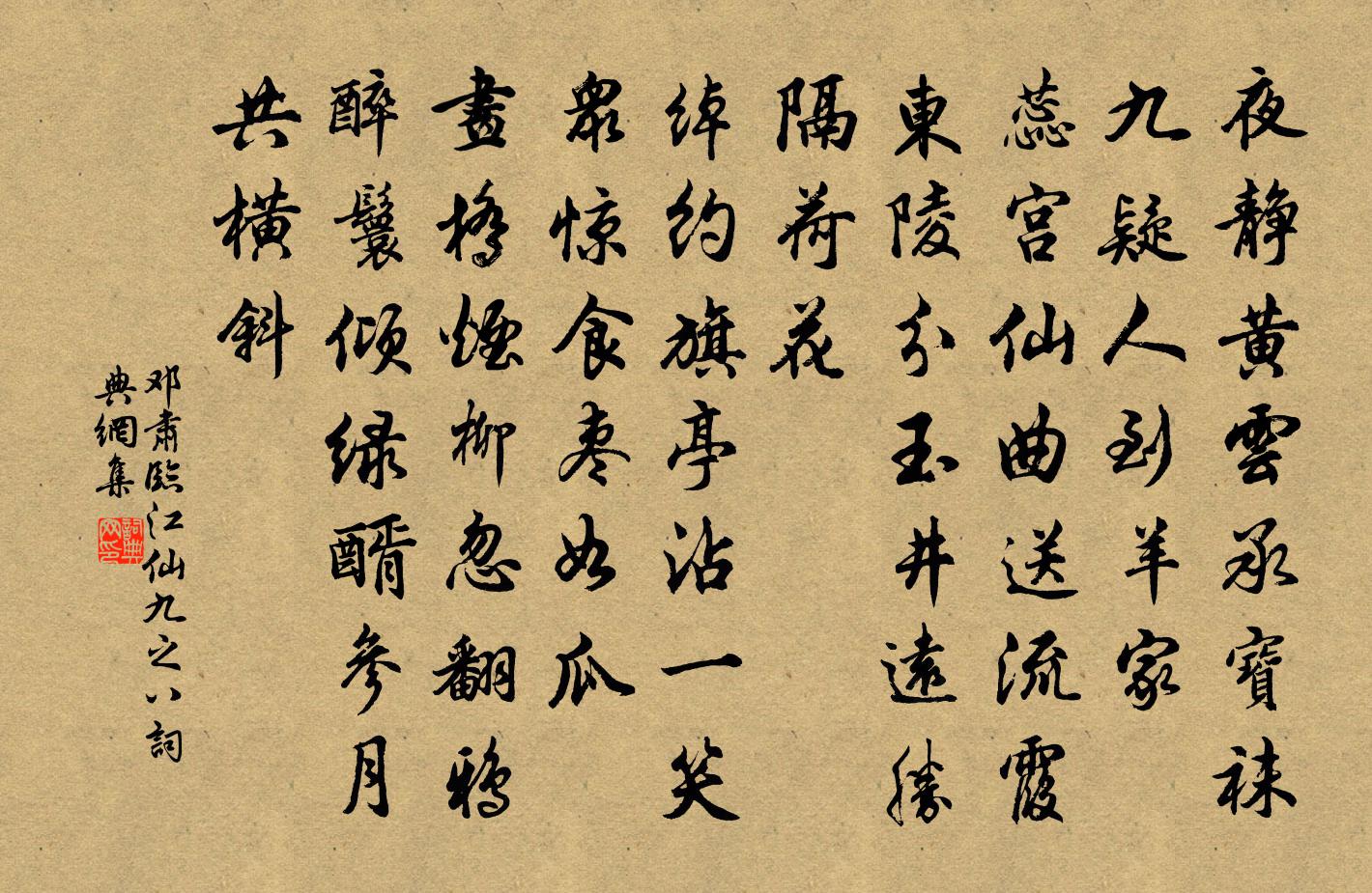 詩詞名句歷史字典書法欣賞書法字典國語詞典說文解字康熙字典古漢語字典標 題 作 者 詩 句 臨江仙(九之八)作者:鄧肅 朝代:宋代臨江仙(九之八)原文夜靜黃雲承寶襪,九疑人到羊家。蕊宮仙曲送流霞。東陵分玉井,遠勝隔荷花。綽約旗亭沾一笑,眾驚食棗如瓜。畫橋煙柳忽翻鴉。醉鬟傾綠醑,參月共橫斜。詩詞問答問:臨江仙(九之八)的作者是誰?答:鄧肅問:臨江仙(九之八)寫於哪個朝代?答:宋代問:臨江仙(九之八)是什麼體裁?答:詞鄧肅臨江仙(九之八)書法欣賞臨江仙(九之八)書法作品詩詞推薦江上逢史館李學士韋莊〔唐代〕前年分袂陝城西,醉憑征軒日欲低。去浪指期魚必變,出門回首馬空嘶。關河自此為征壘,城闕於今陷戰鼙。誰謂句周邦彥〔宋代〕化行禹貢山川外,人在周公禮樂中。次韻僧自文見贈四首方回〔宋代〕空庭風卷葉,壞廡雨淋碑。起廢須成廈,占孚預擊蓍。紅樓追曩集,碧落待誰詩。非有鉤牽□,□□亦未知。夏日納涼嚴維〔唐代〕山陰過野客,鏡里接仙郎。盥漱臨寒水,褰闈入夏堂。杉松交日影,枕簟上湖光。袞袞承嘉話,清風納晚涼。守歲應制沈佺期〔唐代〕南渡輕冰解渭橋,東方樹色起招搖。天子迎春取今夜,王公獻壽用明朝。殿上燈人爭烈火,宮中侲子亂驅妖。宜將孟子食色性也陳普〔宋代〕食色雖然人固有,原於形氣所由根。苟徒即此名為性,太極之真已弗存。農舍陸游〔宋代〕神農之學未為非,日夜勤勞備歲饖。雨畏禾頭蒸耳出,潤憂麥粒化蛾飛。漁家傲歐陽修〔宋代〕三月芳菲看欲暮。胭脂淚灑梨花雨。寶馬繡軒南陌路。笙歌舉。踏青鬥草人無數。強欲留春春不住。東皇肯信韶容記客語方岳〔宋代〕奶婆關節入書館,政可倨坐令庭參。吾曹致身苟如此,九淵驪頷令誰探。華嚴寺范成大〔宋代〕眾峰攢壁立,中有路一線。攀援白雲梯,食頃已天半。我本紫芝曲,誤落青芻棧。向來脫新羈,恍已還舊觀。花煙聞西兵復至又為逃隱計二首陳著〔宋代〕軍屯多似撒星沙,夜月猶聞奏月笳。尚有空囊隨杜甫,幸無複壁累王涯。草根木實逃生飯,石室泥龕到處家。天下海客行楊維楨〔元代〕海客朱雀航,下有五鳳房。三月髮長乾,六月下淮揚。青絲牽白日,羅幕西風涼。大姬勸金露,小姬彈空桑。中姬答無願上人書齊己〔唐代〕鄭生驅蹇峴山回,傳得安公好信來。千里阻修俱老骨,八行重疊慰寒灰。春殘桃李猶開戶,雪滿松杉始上台。必有相和歌辭。銅雀妓劉商〔唐代〕魏主矜蛾眉,美人美於玉。高台無晝夜,歌舞竟未足。盛色如轉圜,夕陽落深谷。仍令身歿後,尚縱平生欲。紅粉賦宣妙院古柏衛宗武〔宋代〕飽經三百載風霜,幾見林間古木僵。修骨蛻龍鱗甲長,繁何擎鳳羽毛蒼。孤高獨與風雲會,蔥蒨深藏雨露香。寄語晚行舍北陸游〔宋代〕逆旅將歸客,扶衰取次行。霜濃木葉盡,水落岸痕生。鳧雁浮寒浦,牛羊滿晚晴。東村隔煙寺,杳杳送鐘聲。詠史上漢高帝八首陳普〔宋代〕欲來不解自操持,白日明庭抱愛姬。世降的從何處起,醉眠王母二家時。為牡丹去草楊萬里〔宋代〕手種名花夢亦隨,一年年望好花枝。為花去草優饒處,兩袖青苔十指泥。和陶貧士七首蘇軾〔宋代〕誰謂淵明貧,尚有一素琴。心閒手自適,寄此無窮音。佳辰愛重九,芳菊起自尋。疏巾嘆虛漉,塵爵笑空斟。忽餉宮詞王仲修〔宋代〕玉簫聲裹酌玻璃,風獵旍旗卷絳霓。星渚月斜珠露重,銀河流水亦東西。名句推薦故人何處。帶我離愁江外去。呂本中《減字木蘭花·去年今夜》 易求無價寶,難得有心郎。魚玄機《贈鄰女 / 寄李億員外》 騷屑西風弄晚寒,翠袖倚闌乾。納蘭性德《眼兒媚·詠紅姑娘》 歲寒,然後知松柏之後凋也。孔子弟子《論語·子罕篇》 鷦鷯尚存一枝,狡兔猶藏三窟羅貫中《三國演義·第六十回》 十分不耐煩,乃為人大病王永彬《圍爐夜話·第五四則》 暗塵隨馬去,明月逐人來。蘇味道《正月十五夜》 荷花嬌欲語,愁殺蕩舟人。李白《淥水曲》 憑君莫話封侯事,一將功成萬骨枯。曹松《己亥歲感事》 羈鳥戀舊林,池魚思故淵。陶淵明《歸園田居·其一》