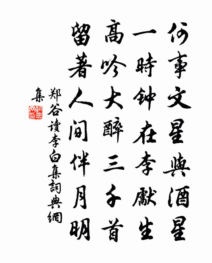 詩詞名句歷史字典書法欣賞書法字典國語詞典說文解字康熙字典古漢語字典標 題 作 者 詩 句 讀李白集作者:鄭谷 朝代:唐代讀李白集原文何事文星與酒星,一時鐘在李先生。高吟大醉三千首,留著人間伴月明。詩詞問答問:讀李白集的作者是誰?答:鄭谷問:讀李白集寫於哪個朝代?答:唐代問:讀李白集是什麼體裁?答:七絕問:鄭谷的名句有哪些?答:鄭谷名句大全鄭谷讀李白集書法欣賞讀李白集書法作品注釋全唐詩:卷675-72詩詞推薦西山淨土庵奉寄具足孤松老師釋紹曇〔宋代〕聞道虛空曾解講,信疑往決西山亮。煙雨溟濛蘚石溫,六藏影跡難尋訪。小徑披榛扣竹扉,道人一見掀眉。布衲橫別後寄題漢嘉月榭范成大〔宋代〕隱吏詩情卜築幽,同年惜別勸淹留。試傾萬景湖亭酒,來看半輪江月秋。川路雖長猶共此,夜船空載且歸休。丘岩回自青龍呈謝師直梅堯臣〔宋代〕共君相別三四年,岩岩瘦骨還依然。唯髭比舊多且黑,學術久已不可肩。嗟余老大無所用,白髮冉冉將侵顛。文章元夜嘆仇遠〔宋代〕虎林城中正月半,十萬人家燈燦爛。溧陽風景方放燈,通宵不禁人游翫。大雪深寒萬木僵,家家冷坐無薪炭。典錢有駜佚名〔先秦〕有駜有駜,駜彼乘黃。夙夜在公,在公明明。振振鷺,鷺於下。鼓咽咽,醉言舞。於胥樂兮!有駜有駜,駜彼乘牡台城路朱彝尊〔清代〕晨紅才射南窗影,犀帷被誰驚起。啅雀爭枝,寒梅吐萼,攪得雪花都墜。暗香簪未。早濕了當風畫羅衣袂。簡點熏頌古三十八首釋從瑾〔宋代〕頓超見色聞聲句,不涉明心悟道言。花落鳥啼岩下寺,月明人喚渡頭船。夏日花萼樓(酉甫)宴應制王昌齡〔唐代〕土德三元正,堯心萬國同。汾陰備冬禮,長樂應和風。賜慶垂天澤,流歡舊諸宮。樓台生海上,簫鼓出天中。霧曉次韻知縣兄夏夜古調蘇泂〔宋代〕非禽胡能飛,羽翰上青霄。非木胡能花,開謝隨驚飈。始予眷所生,於世免塵囂。頗知師寧蘧,貧樂富無驕。異哉紫騮馬李白〔唐代〕紫騮行且嘶,雙翻碧玉蹄。臨流不肯渡,似惜錦障泥。白雪關山遠,黃雲海戍迷。揮鞭萬里去,安得念春閨。吳張紘孫元晏〔唐代〕東部張公與眾殊,共施經略贊全吳。陳琳漫自稱雄伯,神氣應須怯大巫。懷舊用昔人蜀道詩韻陸游〔宋代〕曩自白帝城,一馬獨入蜀,晝行多水湄,夜宿必山麓。時聞木客嘯,常憂射工毒,蜿蜓蛇兩頭,踸踔夔一足;豈惟念奴嬌(重九前二日登西塔觀縣治,用前韻)姚述堯〔宋代〕江山清絕,正簫台花縣,霜秋時候。尋勝登高環望處,碧瓦參差鋪繡。五岫藏雲,兩溪吞月,古市漁鹽湊。青簾斜浣溪沙陳三聘〔宋代〕越浦潮來信息通。吳山不見暮雲重。人生何事各西東。煙外好花紅淺淡,雨餘芳草綠蔥蘢。苦無歡意敵春濃。寄題張正國斗齋陳文蔚〔宋代〕數年約我過溫溪,好趁雞黃秋黍炊。添子江湖千頃意,勸於窗外作盆池。鐫者任廷釋智愚〔宋代〕入石入木知分數,古篆今篆攻豈難。祗因雕巧失真體,不見全文在世間。南鄉子蘇軾〔宋代〕繡鞅玉環遊。燈晃簾疏笑卻收。久立香車催欲上,還留。更且檀唇點杏油。花遍六么球。面旋迴風帶雪流。春入腰逢王泌自東京至李端〔唐代〕逢君自鄉至,雪涕問田園。幾處生喬木,誰家在舊村。山峰橫二室,水色映千門。愁見游從處,如今花正繁。到常清寺予哲師三絕王炎〔宋代〕扣關解後老支郎,見我丁寧問故鄉。自說病身歸不得,花開葉落幾淒涼。【雙調】折桂令 留京城作梁寅〔元代〕龍樓鳳閣重重,海上篷萊,天上瑤宮。錦繡人才,風雲奇士,袞袞相逢。幾人侍黃金殿上,幾人在紫陌塵中。運有名句推薦杏樹壇邊漁父,桃花源里人家。王維《田園樂七首·其三》 游女昔解佩,傳聞於此山孟浩然《萬山潭作》 材愨者常安利,盪悍者常危害荀子《荀子·榮辱》 翻空白鳥時時見,照水紅蕖細細香。蘇軾《鷓鴣天·林斷山明竹隱牆》 晴風初破凍,柳眼梅腮,已覺春心動。李清照《蝶戀花·暖雨晴風初破凍》 行到水窮處,坐看雲起時。王維《終南別業 / 初至山中 / 入山寄城中故人》 棲鴉流水點秋光,愛此蕭疏樹幾行。紀映淮《詠秋柳》 自重者然後人重,人輕者便是自輕。佚名《增廣賢文·下集》 心斷新豐酒,銷愁斗幾千。李商隱《風雨》 一春魚雁無訊息,則見雙燕斗銜泥。關漢卿《大德歌·春》
