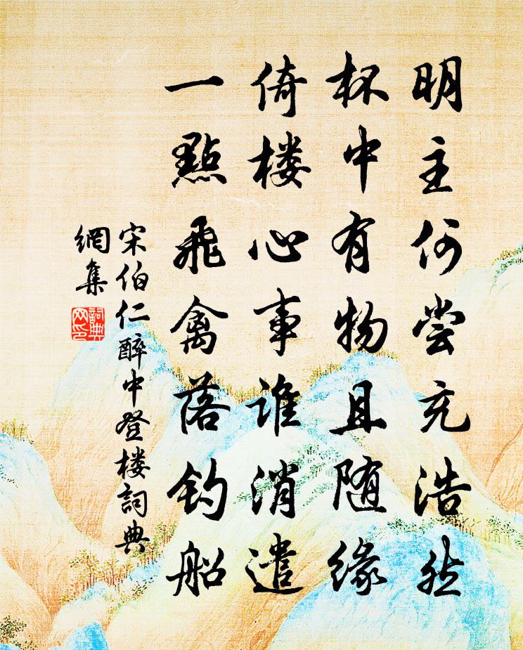 詩詞名句歷史字典書法欣賞書法字典國語詞典說文解字康熙字典古漢語字典標 題 作 者 詩 句 醉中登樓作者:宋伯仁 朝代:宋代醉中登樓原文明主何嘗充浩然,杯中有物且隨緣。倚樓心事誰消遣,一點飛禽落釣船。詩詞問答問:醉中登樓的作者是誰?答:宋伯仁問:醉中登樓寫於哪個朝代?答:宋代宋伯仁醉中登樓書法欣賞醉中登樓書法作品詩詞推薦雜曲歌辭古別離僧皎然〔唐代〕太湖三山口,吳王在時道。寂寞千載心,無人見春草。誰堪緘怨者,持此傷懷抱。孤舟畏狂風,一點宿煙島。望所禪人並化主寫真求贊釋正覺〔宋代〕眼橫鼻直,氣清骨寒。手眼外應金篦快,身心內照玉壺寬。機絲交織兮春華蔟蔟,與物齊平兮夢蝶團團。董宣徐鈞〔宋代〕彈擊京畿已五期,一廉始嘆蓋棺時。君王萬里猶明見,近有斯人卻未知。斷雁文天祥〔宋代〕斷雁西江遠,無家寄萬金。乾坤風月老,沙漠歲年深。白日去如夢,青天知此心。素琴弦已絕,不絕是南音。思江南筍蕨姚勉〔宋代〕先生亟去理山齋,筍蕨春甜味正佳。一夜東風催變綠,筍吹成竹蕨成柴。酬王木叔判院喜雨韻蘇泂〔宋代〕雨在琴書溽更蒸,雨餘衣袂潤猶清。良苗日起有佳色,聖澤天同無靳情。得句餉耘聊誌喜,欲歌擊缶不容聲。居然東皋十首晁補之〔宋代〕小閣高原最上頭,下床莫遣許公羞。如今老罷欄邊意,不是元龍百尺樓。明妃曲四首儲光羲〔唐代〕西行隴上泣胡天,南向雲中指渭川。毳幕夜來時宛轉,何由得似漢王邊。胡王知妾不勝悲,樂府皆傳漢國辭。朝來秦樓月 即事張可久〔元代〕山童說。清霜一夜芭蕉折。芭蕉折。梅花開也,滿湖風雪。墨痕碎碎題詩葉。玉英棵棵丁香結。丁香結。忍教孤負早發於濆〔唐代〕綠野含曙光,東北雲如茜。棲鴉林際起,落月水中見。此身何自苦,日日凌霜霰。流蘇帳里人,猶在陽台畔。出自薊北門行徐陵〔南北朝〕薊北聊長望。黃昏心獨愁。燕山對古剎。代郡隱城樓。屢戰橋恆斷。長冰塹不流。天雲如地陣。漢月帶胡秋。漬土送倪道士之廬山趙師秀〔宋代〕近方辭地肺,本自住天台。有鶴相同出,無雲作伴回。道房隨處借,詩板逐時開。又說廬山去,閒看瀑布來。吳王郎中時從梁陳作詩陸機〔魏晉〕在昔蒙嘉運。矯跡入崇賢。假翼鳴鳳條。濯足升龍淵。玄冕無醜士。冶服使我妍。輕劍拂鞶厲。長纓麗且鮮。誰謂江州德化縣漪嵐堂盡得廬山之勝醉中作此呈趙戴復古〔宋代〕不羨君為花縣宰,羨君日坐漪嵐堂。有時酒興兼詩興,無限山光與水光。百姓熙熙知教化,群胥凜凜對風霜。公餘與趙冬曦君懋子均登南樓張說〔唐代〕危樓瀉洞湖,積水照城隅。命駕邀漁火,通家引鳳雛。山晴紅蕊匝,洲曉綠苗鋪。舉目思鄉縣,春光定不殊。鳥夜啼 含暉亭芍藥謝劉敏中〔元代〕含暉亭下春風。錦雲叢。臨到開時別去,苦匆匆。人乍到。花已老。酒瓶空。惟有一溪流水,照詩翁。句歐陽鈇〔宋代〕更闌待月華,風露寒欲僵。高士詠廣成子吳筠〔唐代〕廣成臥雲岫,緬邈逾千齡。軒轅來順風,問道修神形。至言發玄理,告以從杳冥。三光入無窮,寂默返太寧。鳳棲梧 和碧虛坦詞尹志平〔元代〕至道幽微何處究。妄想邪思,便是魔 * 。欲要三田苗長秀。真常真靜真無朽。五氣朝元真一湊。萬語千言,須候梅雨五絕范成大〔宋代〕乙酉甲申雷雨驚,乘除卻賀芒種晴。插秧先插蚤秈稻,少忍數旬蒸米成。名句推薦若似月輪終皎潔,不辭冰雪為卿熱。納蘭性德《蝶戀花·辛苦最憐天上月》 荒戍落黃葉,浩然離故關。溫庭筠《送人東遊》 寒眼亂空闊,客意不勝秋。楊炎正《水調歌頭·登多景樓》 時雨降矣,而猶浸灌,其於澤也,不亦勞乎!莊子《莊子·內篇·逍遙遊》 穠艷一枝細看取,芳心千重似束。蘇軾《賀新郎·夏景》 自笑好山如好色,只今懷樹更懷人。閒愁閒恨一番新。辛棄疾《浣溪沙·偕叔高子似宿山寺戲作》 普天皆滅焰,匝地盡藏煙。沈佺期《寒食》 邯鄲驛里逢冬至,抱膝燈前影伴身。白居易《邯鄲冬至夜思家》 一身報國有萬死,雙鬢向人無再青。陸游《夜泊水村》 蕭條亭障遠,悽慘風塵多庾信《擬詠懷二十七首·其二十六》