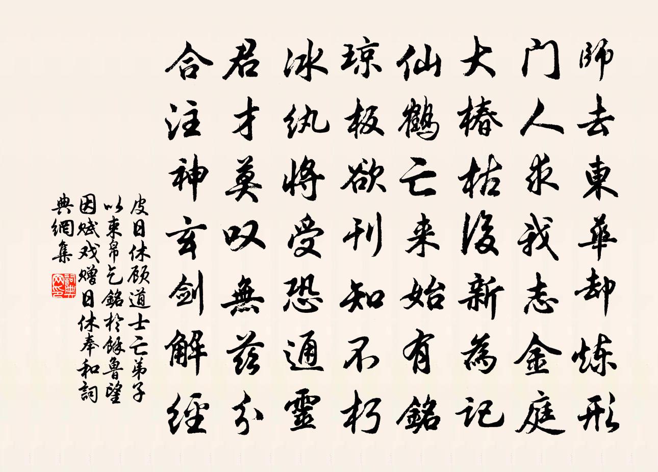 詩詞名句歷史字典書法欣賞書法字典國語詞典說文解字康熙字典古漢語字典標 題 作 者 詩 句 顧道士亡弟子以束帛乞銘於余魯望因賦戲贈日休奉和作者:皮日休 朝代:唐代原文師去東華卻鍊形,門人求我志金庭。大椿枯後新為記,仙鶴亡來始有銘。瓊板欲刊知不朽,冰紈將受恐通靈。君才莫嘆無茲分,合注神玄劍解經。詩詞問答問:《顧道士亡弟子以束帛乞銘於余魯望因賦戲贈日休奉和》的作者是誰?答:皮日休問:該詩寫於哪個朝代?答:唐代書法欣賞顧道士亡弟子以束帛乞銘於余魯望因賦戲贈日休奉和書法作品注釋全唐詩:卷614-25詩詞推薦冬夜讀書甚樂偶作短歌陸游〔宋代〕衰病作書祟,常恨無新功。兔甌供茗粥,睡思一洗空。郊居近城闉,漏鼓傳冬冬。緗帙開爛漫,牙籤紛疊重。朱黃秋浦見陸次川會其有廣德之役同游齊山而別既王淹〔宋代〕我車疾驅無停輈,君馬既秣猶少留。客懷那更見行色,勝地不能成縱游。君去我愁歸路遠,黃葉霜風山意晚。幾時淳于髠酒諫邵雍〔宋代〕賜酒於君,飲不知味。執法在前,鞏懼無既。當此之時,一斗而醉。宗族滿堂,既孝且悌。尊卑以親,少長有齒。酬張進彥見寄王之道〔宋代〕皇華應記去年曾,六轡馳驅問固陵。道路向來荒枳棘,堤封從昔錯溝塍。煙銷列嶂秋光遠,木落長淮霽色澄。自笑贊程宗古承務釋曇華〔宋代〕龐居士悟心於馬駒下,裴相國得大用於黃櫱棒頭。雖相去數百年間,其金聲玉振聯環不斷。彼時有此二大老光明烜與趙伯藏信叟游天衣寺孫應時〔宋代〕渺渺湖風引桂舟,竹輿沙徑晚山稠。千峰影底鳴雙澗,三伏日中含九秋。邂逅襟期俱灑落,等間歸計少遲留。何時城傍曲王昌齡〔唐代〕秋風鳴桑條,草白狐兔驕。邯鄲飲來酒未消,城北原平掣皂雕。射殺空營兩騰虎,回身卻月佩弓弰。山中別李處士王績〔唐代〕為向東溪道,人來路漸賒。山中春酒熟,何處得停家。送張道從上行起復帥夔二首郭印〔宋代〕白帝層城統十連,肘聯荊屬阻山川。翠華久睠舟車會,紫詔先收柱石賢。雪淨已通梁閣道,浪平空艤漢樓船。不妨蒲橋寓舍劇暑楊萬里〔宋代〕三歲都城寓遠坊,今年一熱古無雙。夜來何處山村雨,涼到蒲橋橋北窗。大中祥符封禪十首真宗〔宋代〕因高定位,禮修物備。薦鬯卜牲,虔恭寅畏。八音克諧,天神鹹暨。降福穰穰,永錫爾類。春日衛宗武〔宋代〕天公軌與物為春,人事紛紛藹若雲。錦繡山川誰管領,只應魚鳥得平分。酬劉書記見贈李山甫〔唐代〕獨在西峰末,憐君和氣多。勞生同朽索,急景似傾波。禪者行擔錫,樵師語隔坡。旱□生赤蘚,古木架青蘿。石澗長樂少年行(一作古意)崔國輔〔唐代〕遺卻珊瑚鞭,白馬驕不行。章台折楊柳,春日路傍情。秋望李夢陽〔明代〕黃河水繞漢邊牆,河上秋風雁幾行。客子過濠追野馬,將軍弢[1]箭射天狼。黃塵古渡迷飛輓[2],白日橫空冬至雪二首蘇轍〔宋代〕佳節蕭條陋巷中,雪穿窗戶有顏風。出迎過客知非病,歸對先師喜屢空。黍醞盈瓢終寡味,石薪烘灶信奇功。頗嫌寄劉尚書魚玄機〔唐代〕八座鎮雄軍,歌謠滿路新。汾川三月雨,晉水百花春。囹圄長空鎖,干戈久覆塵。儒僧觀子夜,羈客醉紅茵。筆硯剪彩宋之問〔唐代〕駐想持金錯,居然作管灰。綺羅縴手制,桃李向春開。拾藻蜂初泊,銜花鳥未回。不言將巧笑,翻逐美人來。二月二十四日至魏塘七首張嵲〔宋代〕雨罷青枝猶裊裊,風余紫燕故翩翩。垂簾竟日無餘事,庭草雖長不用鞭。送人出使吳芾〔宋代〕天心軫念國西陲,妙選廷臣下赤墀。要布寬仁慰雕瘵,用資根本濟艱危。九重眷遇風雲會,萬里威名草木知。此去名句推薦憶昔霍將軍,連年此征討。高適《登百丈峰二首》 跨馬出郊時極目,不堪人事日蕭條杜甫《野望》 其餘七匹亦殊絕,迥若寒空動煙雪。杜甫《韋諷錄事宅觀曹將軍畫馬圖》 亭皋木葉下,隴首秋雲飛柳惲《搗衣詩》 探其懷,奪之威。主上用之,若電若雷。韓非及後人《韓非子·揚權》 簌簌衣巾落棗花,村南村北響繅車,牛衣古柳賣黃瓜。蘇軾《浣溪沙·簌簌衣巾落棗花》 孝子之事親也,居則致其敬,養則致其樂,病則致其憂,喪則致其 哀,祭則致其嚴。孔子及其弟子《孝經·紀孝行》 山城過雨百花盡,榕葉滿庭鶯亂啼。柳宗元《柳州二月榕葉落盡偶題》 龍魚失水難為用,龜玉蒙塵未見珍牟融《春日山亭》 雁啼紅葉天,人醉黃花地,芭蕉雨聲秋夢裡。張可久《清江引·秋懷》