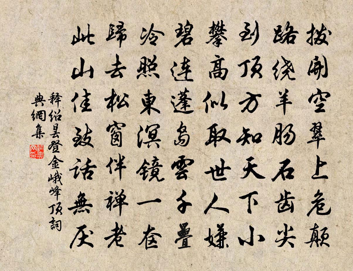 詩詞名句歷史字典書法欣賞書法字典國語詞典說文解字康熙字典古漢語字典標 題 作 者 詩 句 登金峨峰頂作者:釋紹曇 朝代:宋代登金峨峰頂原文撥開空翠上危顛,路繞羊腸石齒尖。到頂方知天下小,攀高似取世人嫌。碧連蓬島雲千疊,冷照東溟鏡一奩。歸去松窗伴禪老,此山佳致話無厭。詩詞問答問:登金峨峰頂的作者是誰?答:釋紹曇問:登金峨峰頂寫於哪個朝代?答:宋代釋紹曇登金峨峰頂書法欣賞登金峨峰頂書法作品詩詞推薦和希深避暑香山寺梅堯臣〔宋代〕有客乘新霽,雲林共扣扃。輕舟過下渡,遠水漲前汀。原隰含幽藹,岑嵐入杳冥。誰知得深趣,履齒石苔青。次邢兄韻簡李簡夫蘇泂〔宋代〕幽花契幽禪,夷下難為情。想見獅子床,天女問淨名。至味有不釀,大音本希聲。相逢寸紙間,公案今見成。送武廣叔游浙東二首李洪〔宋代〕嬴相去千載,規摹筆勢難。空興黃絹語,誰把翠珉刊。並海歲雲暮,耶溪春更寒。知君四方誌,無璧薦盤餐。東峰亭各賦一物得臨軒桂郭澹〔唐代〕青青芳桂樹,幽陰在庭軒。向日陰還合,從風葉乍翻。共看霜雪後,終不變涼暄。早春寄王漢陽李白〔唐代〕聞道春還未相識,走傍寒梅訪訊息。昨夜東風入武陽,陌頭楊柳黃金色。碧水浩浩雲茫茫,美人不來空斷腸。預拂江城子 前作五月十二日壽萬拙齊詞,意有未謝應芳〔元代〕去年今日訪龐公。也匆匆。去城中。回首青山,帶雨汗顏同。茅屋破來風轉急,愁殺我,浣花翁。今年一笑喜相逢雪晴曾幾〔宋代〕衾裯一夜冷於冰,雪事心知作得成。自起穴窗看不見,卻來欹枕聽無聲。下床走報童心喜,開戶驚呼老眼明。晴日寄五郎兼示十五郎陸游〔宋代〕八十九十老可驚,白髮森然憎鏡明。身當游岱尚少駐,書欲藏山殊未成。大兒為國戍絕塞,季子伴翁親短檠。古人淳熙四年二月既望靜江守臣張某奉詔勸農於郊張栻〔宋代〕保爾家室,撫樂幼樨。既迄有年,復思嗣歲。句王曾〔宋代〕百靈扶繡戶,不假艾為人。膠山寺蘇紳〔宋代〕驅馬款禪扉,松風冷拂衣。紅塵不到處,青嶂此忘歸。鳥望生台下,雲侵講座飛,楞伽味真趣,轉覺俗緣稀。綠頭鴨王吉昌〔元代〕道風清。武簾互動經營。聚三天、合和兩地,斡元宮、真氣流行。變剛柔、游龍牝馬,應七十、十候生成。走玉飛四安道中所見牟巘五〔宋代〕姑溪小隊帶薰風,笳鼓歡迎鶴髮翁。三十九年成一夢,幾多陳跡淚痕中。范令人生日晁公溯〔宋代〕文正垂芳久,風流八葉蕭。名傳慶曆頌,功冠寶元朝。人物追三代,儀刑正百僚。後來登玉筍,故自有霜條。配德病起枕上口占三絕句奉呈公實嶠之賢伯仲一笑張元乾〔宋代〕素馨茉莉及玫瑰,清馥渾同雪裡梅。六入不分初病起,眼前欠此共徘徊。自龍隱岩泛舟至雉山章峴〔宋代〕晴溪幾曲度澄灣,朝涉龍巖晚雉山。林叟野僧休笑我,平生所得是官閒。金仙道中徒步郭印〔宋代〕欲稅肩輿未得休,且憑竹杖到山頭。疏林向晚投歸翼,滿目寒煙醞客愁。湖南蘭若示大乘諸公皎然〔唐代〕未到無為岸,空憐不繫舟。東山白雲意,歲晚尚悠悠。真陽峽楊萬里〔宋代〕清遠雖佳未足觀,真陽佳絕冠南蠻。一泉嶺背懸崖出,亂灑江邊怪石間。來岸對排雙玉筍,此峰外面萬青山。險艱湖上寓居雜詠姜夔〔宋代〕微波沖得綠萍開,數點青青粘石階。綠葑自來不自去,來時須載白鷗來。名句推薦郎騎竹馬來,繞床弄青梅。李白《長干行二首》 春城無處不飛花,寒食東風御柳斜。韓翃《寒食 / 寒食日即事》 行人莫便消魂去,漢渚星橋尚有期。晏幾道《鷓鴣天·梅蕊新妝桂葉眉》 況故人新擁,漢壇旌節。辛棄疾《滿江紅·漢水東流》 人歸落雁後,思發在花前。薛道衡《人日思歸》 花氣襲人知驟暖,鵲聲穿樹喜新晴。陸游《村居書喜》 敏而好學,不恥下問,是以謂之文也。孔子弟子《論語·公冶長篇》 自與東君作別,剗地無聊。納蘭性德《風流子·秋郊即事》 黃花本是無情物,也共先生晚節香。于謙《過菊江亭》 兼聽之明,而無矜奮之容;有兼覆之厚,而無伐德之色。荀子《荀子·正名》