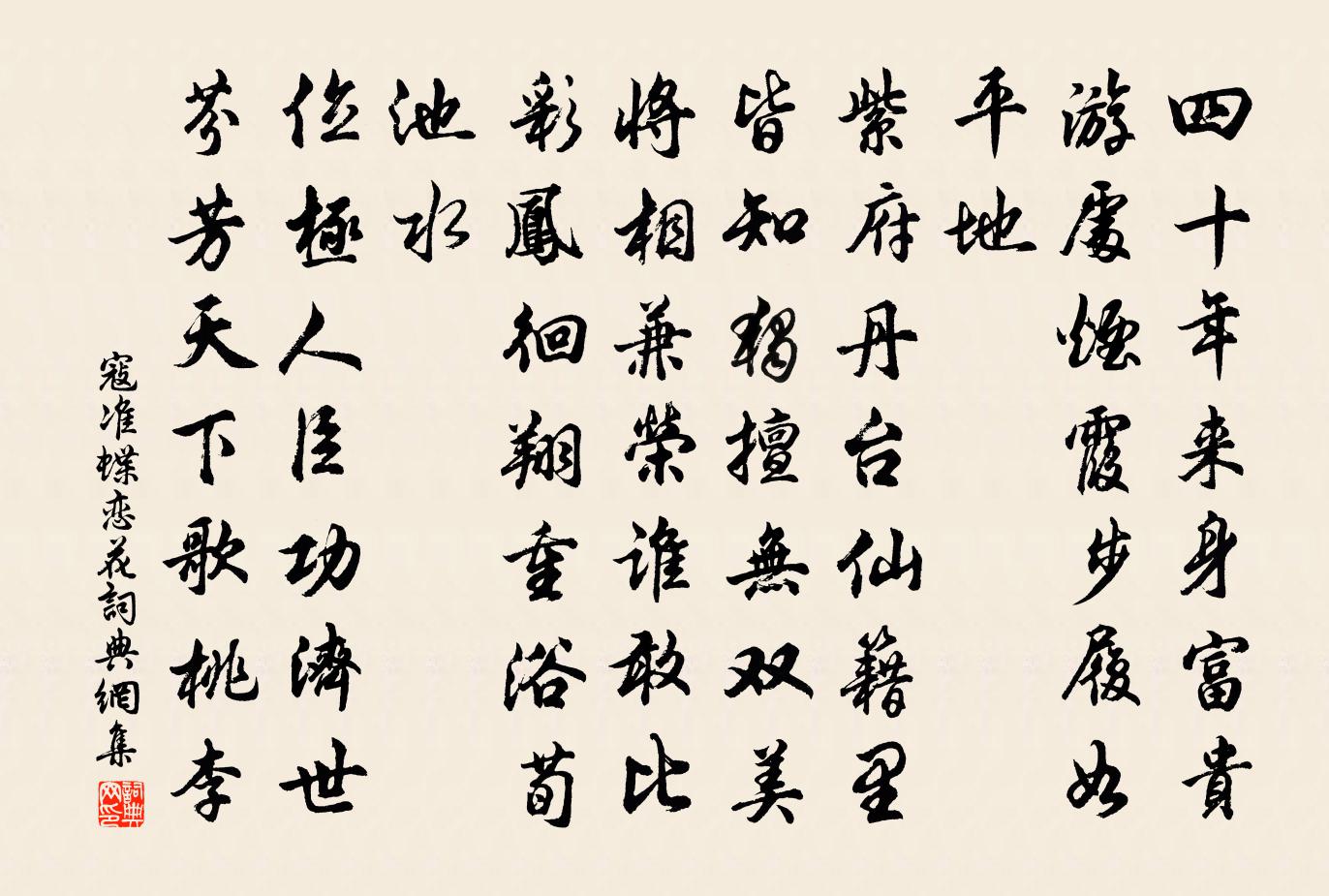 詩詞名句歷史字典書法欣賞書法字典國語詞典說文解字康熙字典古漢語字典標 題 作 者 詩 句 蝶戀花作者:寇準 朝代:宋代蝶戀花原文四十年來身富貴。游處煙霞,步履如平地。紫府丹台仙籍里,皆知獨擅無雙美。將相兼榮誰敢比。彩鳳徊翔,重浴荀池水。位極人臣功濟世,芬芳天下歌桃李。詩詞問答問:蝶戀花的作者是誰?答:寇準問:蝶戀花寫於哪個朝代?答:宋代問:蝶戀花是什麼體裁?答:詞問:寇準的名句有哪些?答:寇準名句大全寇準蝶戀花書法欣賞蝶戀花書法作品詩詞推薦并州王諫議楊億〔宋代〕鎖闈聊輟皂囊封,晝錦還鄉意氣雄。別墅揮金延父老,近郊騎竹見兒童。蒲盧善化終成政,蟋蟀深思未變風。更待垂虹亭祝乂〔宋代〕冷浸三江碧,青圍四面山。帆歸煙浪杪,人住水雲間。風颭波聲碎,虹垂雨意間。無端動歸興,一棹喜輕還。觀吳興俞君新之作畫於瑞竹俞君索詩漫興四絕趙蕃〔宋代〕作畫與作詩,妙處元同科。苟無自得處,當復奈渠何。過東坡墳田錫〔元代〕富貴一場春夜夢,文章萬斛冷雲泉。英魂返卻眉山秀,依舊春風草木天。送友人江行之廬山肄業唐求〔唐代〕蜀國初開棹,廬峰擬拾螢。獸皮裁褥暖,蓮葉製衣馨。楚水秋來碧,巫山雨後青。莫教銜鳳詔,三度到中庭。定海四首陳造〔宋代〕縣境拖修直,人家住土塗。三方鯨浪涌,一島虎頭孤。風物猶佳處,弦歌付老夫。平生蟲篆意,或許間憂虞。崇化寺三首張耒〔宋代〕樓殿沉沉鎖夜煙,秋燈一點佛龕前。梧桐葉上三更雨,亦有愁人獨自眠。即事六絕王炎〔宋代〕焚香清坐對韋編,妙處懸知不可傳。三畫分明寄玄旨,誰將修綆汲深泉。游李少師園十題茅庵范祖禹〔宋代〕結茅深林下,開戶流水邊。曉聽松風坐,夜枕雲濤眠。釣雪舟中霜夜望月楊萬里〔宋代〕溪邊小立苦待月,月知人意偏遲出。歸來閉戶悶不看,忽然飛上千峰端。卻登釣雪聊一望,冰輪正掛松梢上。詩人即事十絕劉克莊〔宋代〕荊益俱危急,風濤共一舟。未知策應使,兵已至何州。王氏昆仲歸寧梅堯臣〔宋代〕昨夜雪霏霏,梁山吟未歸。關河誰道遠,鴻雁自相依。落日人煙少,寒雲驛路微。共將彭澤酒,稱壽向庭闈。送程建用蘇軾〔宋代〕先生本舌耕,文字浩千頃。空倉付公子,坐待發苕穎。十年困新說,兒女爭捕影。鑿垣種蒿蓬,嘉穀誰復省。空餘四月五日醉書慈雲閣陳著〔宋代〕峰開荷葉東南傾,梵宮截斷西來青。參差樓閣半空起,撞鐘椎魚撼林坰。奔走簦笠數百里,隨事來乞山中靈。大眾回心院蕭觀音〔遼代〕拂象床,憑夢借高唐。敲壞半邊知妾臥,恰當天處少輝光。拂象床,待君王。句施肩吾〔唐代〕年來如拋梭,不老應不得。花眼綻紅斟酒看,藥心抽綠帶煙鋤。顛狂楚客歌成雪,媚賴吳娘笑是鹽。荷翻紫蓋搖波黃櫱歸途以碧潭清皎潔為韻分得碧字真歇泛舟李彌遜〔宋代〕苦為捫蘿行,正坐愛山癖。振衣雲中樹,洗耳泉上石。稍尋優缽林,偶旁瞿曇宅。溪橫走羊腸,山轉回龍脊。兩難移樹詩庾信〔南北朝〕酒泉移赤柰。河陽徙石榴。雖言有千樹。何處似封侯。偈頌一百零二首釋慧遠〔宋代〕梅陽老囑付此衣,遮護得山僧一半。借問搭來何所宜,恰似當年賣柴漢。醬裹墮,雪中炭,留與叢林斫額看。君不快活白居易〔唐代〕可惜鶯啼花落處,一壺濁酒送殘春。可憐月好風涼夜,一部清商伴老身。飽食安眠消日月,閒談冷笑接交親。誰知名句推薦不求見面惟通謁,名紙朝來滿敝廬。文徵明《拜年》 風嗥雨嘯,昏見晨趨。鮑照《蕪城賦》 為惜故人去,復憐嘶馬愁。高適《送魏八》 吳洲如見月,千里幸相思。李白《送張舍人之江東》 歡笑情如舊,蕭疏鬢已斑。韋應物《淮上喜會梁川故人 / 淮上喜會梁州故人》 一上高城萬里愁,蒹葭楊柳似汀洲。許渾《鹹陽城東樓 / 鹹陽城西樓晚眺 / 西門》 自從明宰投巫後,直至如今鬼不神汪遵《西河》 今逢四海為家日,故壘蕭蕭蘆荻秋。劉禹錫《西塞山懷古》 除腹心之疾,而置諸股肱,何益?左丘明《左傳·哀公·哀公六年》 天意憐幽草,人間重晚晴。李商隱《晚晴》