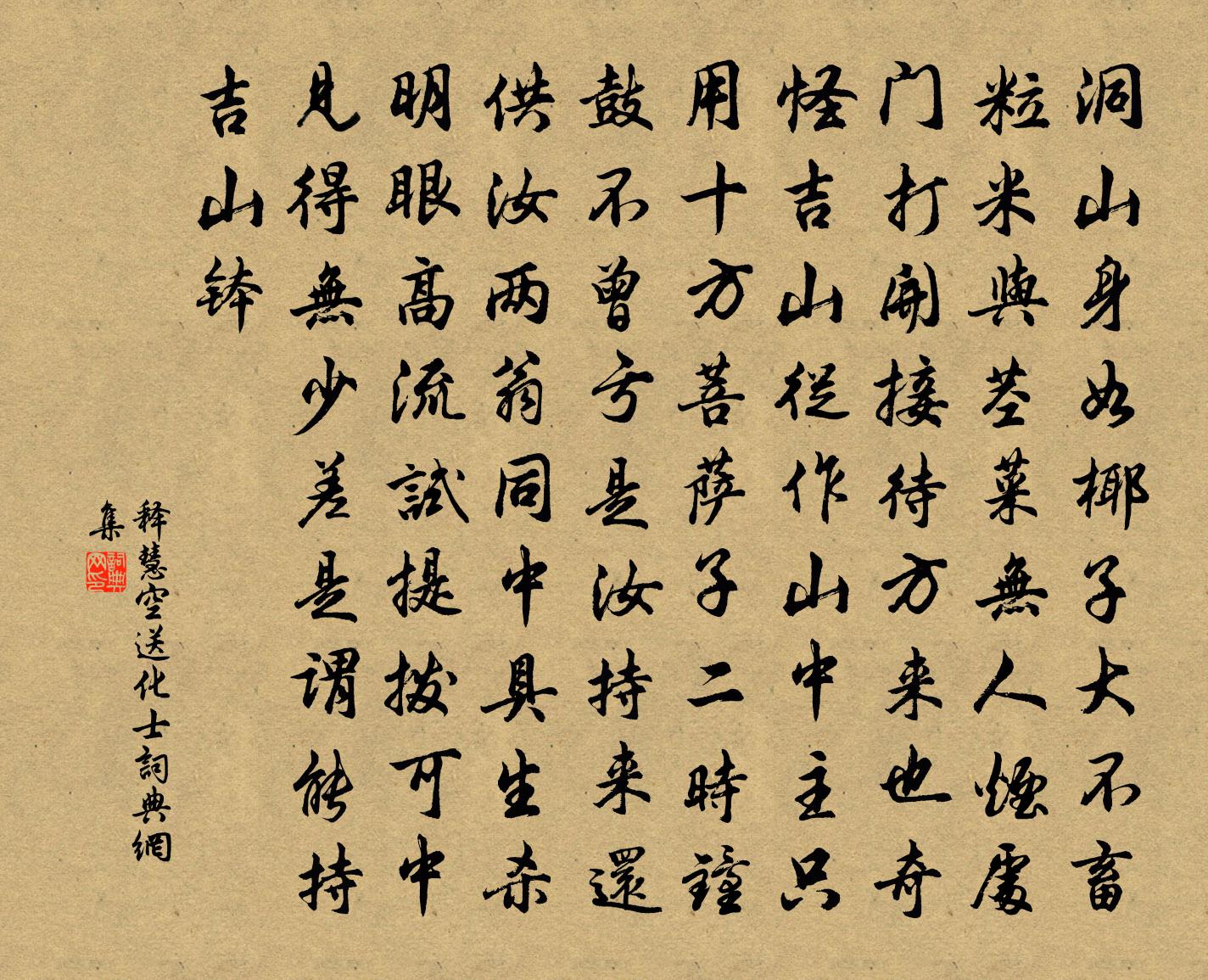 詩詞名句歷史字典書法欣賞書法字典國語詞典說文解字康熙字典古漢語字典標 題 作 者 詩 句 送化士作者:釋慧空 朝代:宋代送化士原文洞山身如椰子大,不畜粒米與莖菜。無人煙處門打開,接待方來也奇怪。吉山從作山中主,只用十方菩薩子。二時鐘鼓不曾虧,是汝持來還供汝。兩翁同中具生殺,明眼高流試提撥。可中見得無少差,是謂能持吉山缽。詩詞問答問:送化士的作者是誰?答:釋慧空問:送化士寫於哪個朝代?答:宋代釋慧空送化士書法欣賞送化士書法作品詩詞推薦聽董大彈胡笳聲兼寄語弄房給事李頎〔唐代〕蔡女昔造胡笳聲,一彈一十有八拍。胡人落淚沾邊草,漢使斷腸對歸客。古戍蒼蒼烽火寒,大荒沈沈飛雪白。(沈憶秦娥楊冠卿〔宋代〕雲垂幕。江天雪似楊花落。楊花落。翠衾不暖,曉寒偏覺。起來獨倚西樓角。客懷無耐傷離索。傷離索。蠻箋欲寄答中道小疾見寄梅堯臣〔宋代〕嵇康性彌嬾,曾不廢養生。子姑當妙年,何乃勞其精。老聃有至論,身孰親於名。詩本道情性,不須大厥聲。方聞聞范至能丐祠二首劉應時〔宋代〕士紳知已近來無,得此吾慚上大夫。酷愛新詩成異遇,每於廣坐語諸儒。既紓此顧思歸矣,聞返西州有是夫。便欲生查子(憶去秋抱病過冬,因賦此)汪莘〔宋代〕春來春色佳,秋至秋光好。無計奈春歸,又看秋光老。去年飛雪時,病與梅花道。來歲雪飛時,為把金樽倒。新修道居王建〔唐代〕世間無所入,學道處新成。兩面有山色,六時聞磬聲。閒加經遍數,老愛字分明。若得離煩惱,焚香過一生。題韓乾馬岑津〔宋代〕左輔周垣隱白沙,龍媒絕種進天家。驕嘶玉勒憐豐草,渴飲冰泉帶落花。西狩還經千里棧,東巡會駕五雲車。權奇趙康州徐節孝祠王洋〔宋代〕康州義烈光千載,徐老勸劬盡一身。及到成名略相等,須知忠孝是同倫。題閻立本十八學士圖鄭昺〔宋代〕閻公十八學士圖,當時妙筆分錙銖。惜哉名姓不題別,但可以意推形模。十二匹馬一匹驢,五士無馬應直廬。五鞍送顧況歸茅山韋夏卿〔唐代〕新地為遷客,虛皇作近臣。法尊稱大洞,學淺忝初真。鸞鳳文章麗,煙霞翰墨新。羨君尋句曲,白鵠是三神。次韻姚道人二首蘇轍〔宋代〕高人隱陋巷,至藥初無方。心知無生妙,運轉開陰陽。才如淩雲松,豈受尺寸量。氣如幽谷蘭,時送清風香。嗟我送陳糧料葉適〔宋代〕萬里渥窪出,行天絕比倫。能參天關鍵,莫用小精神。鐘鼎身雖貴,簡瓢道未貧。梅情兼雪意,留住恰芳春。悟黃粱 贈興平楊先生馬鈺〔元代〕密密相傳理最深。向水裡,自生金。個人無口解喔吟。能雲步,曳雲襟。尋思今古修仙道,今如古,古如今。古今龜山禱雨徐夢發〔宋代〕久困焦熬里,持香謁二禪。會留一宿覺,了得寸心緣。鶴識小溪路,鍾聞上界天。龍湫分勺水,法海遍三千。書靜照禪師塔王安石〔宋代〕簡老已歸黃土陌,淵師今作白頭翁。百憂三十餘年事,陳跡山林草野中。壽章漕度正〔宋代〕蒼蒼閩山高,悠悠閩水清。厥初萃瑰琦,而世生豪英。恭惟皇慶曆,當天開文明。風雲千載會,羅列皆名卿。當時悼詩李煜〔唐代〕永念難消釋,孤懷痛自嗟。雨深秋寂莫,愁引病增加。咽絕風前思,昏濛眼上花。空王應念我,窮子正迷家。以新米作撈飯有感虞儔〔宋代〕老矣何妨受一廛,笑渠楊惲強歌田。驚心赤地三年旱,慰眼黃雲八月天。他日江船來白粲,暫時水碓搗紅鮮。軟炊滿庭芳仇遠〔宋代〕寒食無情,陽春如客。晚風吹盡繁枝。落紅堆徑,小檻立移時。樂事不堪再省,吳鄉遠、愁思依依。誰家燕,斜穿嘉禾百詠景龍樓張堯同〔宋代〕千秋傳異彩,百尺護雕闌。欲識金龍瑞,丹霄試仰看。名句推薦茅檐人靜,蓬窗燈暗,春晚連江風雨。陸游《鵲橋仙·夜聞杜鵑》 野火燒不盡,春風吹又生。白居易《草 / 賦得古原草送別》 轉禍而為福,因敗而為功。劉向《戰國策·燕一·燕文公時》 白日放歌須縱酒,青春作伴好還鄉。杜甫《聞官軍收河南河北》 台在山腰,一峰突起,離水十餘丈。沈復《浮生六記·浪遊記快》 夫惜草茅者耗禾穗,惠盜賊者傷良民。韓非及後人《韓非子·難二》 孤村落日殘霞,輕煙老樹寒鴉,一點飛鴻影下。白樸《天淨沙·秋》 雁引愁心去,山銜好月來。李白《與夏十二登岳陽樓》 待小人不難於嚴,而難於不惡;待君子不難於恭,而難於有禮。洪應明《菜根譚·概論》 江碧鳥逾白,山青花欲燃。杜甫《絕句二首》