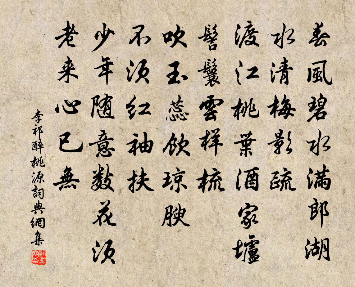 詩詞名句歷史字典書法欣賞書法字典國語詞典說文解字康熙字典古漢語字典標 題 作 者 詩 句 醉桃源/阮郎歸作者:李祁 朝代:宋代醉桃源/阮郎歸原文春風碧水滿郎湖。水清梅影疏。渡江桃葉酒家壚。髻鬟雲樣梳。吹玉蕊,飲瓊腴。不須紅袖扶。少年隨意數花須。老來心已無。詩詞問答問:醉桃源/阮郎歸的作者是誰?答:李祁問:醉桃源/阮郎歸寫於哪個朝代?答:宋代問:醉桃源/阮郎歸是什麼體裁?答:詞李祁醉桃源/阮郎歸書法欣賞醉桃源/阮郎歸書法作品詩詞推薦全太后為尼汪元量〔宋代〕南國舊王母,西方新世尊。頭顱歸妙相,富貴悟空門。傳法優婆域,誦經孤獨園。夜闌清磬罷,趺坐雪花繁。即事 其二王冕〔元代〕草徑無人到,柴門盡日關。脫巾垂白髮,把酒對青山。世薄驚時異,身貧得夢閒。夜深明月下,吟待鶴飛還。夜坐讀離騷張嵲〔宋代〕山風颯颯木蕭蕭,挑盡青燈夜正遙。但得誅茅臨澗水,長年飲酒詠離騷。鷓鴣天(李彥恢生日)周紫芝〔宋代〕尊酒年年樂事多。古銅猶得幾摩挲。他時人物君須記,玉筍班中李泰和。煩翠袖,把金荷。功名餘事且高歌。新來新月陳著〔宋代〕老天大巧亦兒嬉,磨出霜鐮僅一眉。掛向西園瘦梅樹,閒心渾怯損南枝。呈湖州趙再可舍人二首張嵲〔宋代〕一舸乘風汎渺茫,來依芳杜雪鷗行。難將野服隨賓履,七字聊參燕寢香。廬山梁鼎芬〔清代〕我生久行役,入山苦不早。身帶靈寶符,雞犬自牽抱。清風散陰氣,晶出安能褥。五老如故人,依稀夢中道。伏中熱不可過中夜起坐作詩寄五郎陸游〔宋代〕眾星若銀礫,老桂臥海底。中夜熱不解,病叟推枕起。悲蟲號草根,孤螢照野水。樹頭風急生,喘汗真一洗。追憶送張君玉赴寧江幕府七首晁公溯〔宋代〕江聲洶洶雷霆硤,山氣蒼蒼雲雨台。白髮拾遺吟不盡,分留物色待君來。過渭城館邵伯溫〔宋代〕又將鞍馬送殘春,吹盡征衣染盡塵。還是前年舊時候,渭城花柳一番新。為李方舟題東坡赤壁圖釋寶曇〔宋代〕大江赤壁黃州村,魚龍吹血波濤渾。腥風不洗賊臣淚,暗濕官樹旌旗昏。城南啞啞一笑入,愁日動地回春溫。夜闌浦江道中三絕鄭剛中〔宋代〕瘦骨岩岩禍患餘,追隨人事愈馳驅。何時酒掃松楸畔,小蓋茅庵唯讀書。減字木蘭花林淳〔宋代〕燭花呈燦。瑞氣滿筵春欲爛。月色中宵。疑是階前雪未消。騷人詞客。魂斷蠟梅香已籍。誰更情關。一點新愁入遠澹山岩陳宗禮〔宋代〕永州澹岩天下稀,山靈妙斲涪翁知。蹲猊翔鳳獻穎異,中有仙佛來娛嬉。我生骨相□冰雪,心境相□生懌悅。緣輕哀江南宋祁〔宋代〕病魂招得未渾全,暝倚秋屏豈是禪。一夢忽成霜蝶去,草深三逕若為眠。雲門峰陳岩〔宋代〕兩崖對聳三千丈,上倚清虛小有天。玉戶金鋪雲杳靄,羅衣搖曳幾神仙。遇赦北歸晁補之〔宋代〕山猶故險水猶奔,無復前年濺淚痕。自是人心隨境別,櫓聲帆色盡君恩。慶元府額上牌致語口號佚名〔宋代〕慶元天子舊名藩,寶佑元戎新榜顏。鬱郁蛟纏三大字,停停虹貫四明山。百年老穉歡聲沸,千古山河旺氣還。便挾秋懷十首末章稍自振起亦古義也陸游〔宋代〕我昔聞關中,水深土平曠;涇渭貫其間,沃壤誰與抗?桑麻郁千里,黍林高一丈;潼華臨黃河,古出名將相。淪陷和薛監察題興善寺古松(薛一作崔)張喬〔唐代〕種在法王城,前朝古寺名。瘦根盤地遠,香吹入雲清。鶴動池台影,僧禪雨雪聲。看來人旋老,因此嘆浮生。名句推薦淺不足與測深,愚不足與謀智,坎井之蛙,不可與語東海之樂。荀子《荀子·正論》 長安白日照春空,綠楊結煙垂裊風。李白《陽春歌》 湖南為客動經春,燕子銜泥兩度新。杜甫《燕子來舟中作》 臥看滿天雲不動,不知雲與我俱東。陳與義《襄邑道中》 枉己者,未有能直人者也。孟子《孟子·滕文公章句下·第一節》 昨夜西風凋碧樹,獨上高樓,望盡天涯路。晏殊《蝶戀花·檻菊愁煙蘭泣露》 嗟萬事難忘,惟是輕別。周邦彥《浪淘沙慢·曉陰重》 寄言儔侶,莫負廣寒沈醉。文徵明《念奴嬌·中秋對月》 百年成之不足,一旦壞之有餘。佚名《增廣賢文·上集》 信使可覆,器欲難量。周興嗣《千字文·全文》