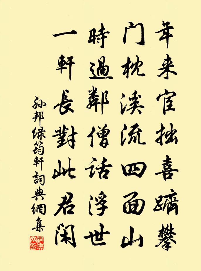 詩詞名句歷史字典書法欣賞書法字典國語詞典說文解字康熙字典古漢語字典標 題 作 者 詩 句 綠筠軒作者:孫邦 朝代:宋代綠筠軒原文年來宦拙喜躋攀,門枕溪流四面山。時過鄰僧話浮世,一軒長對此君閒。詩詞問答問:綠筠軒的作者是誰?答:孫邦問:綠筠軒寫於哪個朝代?答:宋代孫邦綠筠軒書法欣賞綠筠軒書法作品詩詞推薦幽澗泉李白〔唐代〕拂彼琴白石,彈琴吾素琴。幽琴澗愀兮流琴泉深,善手明徽高張清。心寂歷似千古,松颼飀兮萬尋。中見愁猿弔影送慈師北游林逋〔宋代〕鬱郁蒲茸染水田,渡淮閒寄賈人船。知師一枕清秋夢,多為林間放鶴天。太后閣春帖子趙湘〔唐代〕正閫成王化,開宮奉母儀。身當四海養,壽祝萬年期。偈頌二十五首釋道璨〔宋代〕開眼便是,開口便是。舉手便是,舉足便是。雖然如是,未是未是。奉和聖制送張說上集賢學士賜宴賦得謨字賀知章〔唐代〕西學垂玄覽,東堂發聖謨。天光燭武殿,時宰集鴻都。枯朽沾皇澤,翾飛舞帝梧。跡同游汗漫,榮是出泥塗。三嘆題慈感寺極目軒李洪〔宋代〕寺枕苕溪一曲,僧依城郭千家。客至未嘗芡觜,我來恰及荷花。游羅浮山一首示兒子過蘇軾〔宋代〕人間有此白玉京,羅浮見日雞一鳴。南樓未必齊日觀,郁儀自欲朝朱明。(劉夢得有詩,記羅浮夜半見日事。山不句李邴〔宋代〕深居絕送迎。崇禧夜坐劉宰〔宋代〕淮浙千萬山,茲山鍾秀異。山中四時好,雪景更佳耳。危登俯八荒,豈無超詣士。春遊眩紅紫,秋賞挹蒼翠。沖寒曳杖陸游〔宋代〕曳杖寄彷徉,徐行轉曲廊。病知貪酒害,老悔愛花狂。庭樹雲收影,簾旌雨浥香。悠然有住處,物我兩相忘。滿庭芳 因臘月二十二日乃重陽師祖憫化妙行王丹桂〔元代〕人升霞,眾道友修齋畢,以詞贈之雪霽郊原,冰凝池沼,時當深入窮冬。重陽此日,降跡闡真風。還是丹陽師父,雜題陸游〔宋代〕茆屋三間已太奢,柴乾米白喜無涯。非賢敢竊優賢祿,願折蓴絲與蕨芽。寓言皎然〔唐代〕人生百年我過半,天生才定不可換。東海釣鰲鰲不食,南山坐石石欲爛。次韻陳榮緒同倚鐘樓晚望別後明日見寄之作黃庭堅〔宋代〕天外僧伽塔,斜輝極照臨。恁欄隨處好,殘雪向來深。青草無風浪,枯松半死心。衡陽有回雁,他日更傳音。沈千運舊居張籍〔唐代〕汝北君子宅,我來見頹墉。亂離子孫盡,地屬鄰里翁。土木被丘墟,谿路不連通。舊井蔓草合,牛羊墜其中。君辭同鄭相併歌姬小飲戲贈 / 杜丞相悰筵中贈美人李群玉〔唐代〕裙拖六幅湘江水,鬢聳巫山一段雲。風格只應天上有,歌聲豈合世間聞。胸前瑞雪燈斜照,眼底桃花酒半醺。不是送鄭閣赴閩辟貫休〔唐代〕便便書腹德無鄰,健筆從知又入閩。鸚鵡才須歸紫禁,真珠履不稱清貧。武夷山夾仙霞薄,螺女潭通海樹春。從此四仙韻 贈徐玄之馬鈺〔元代〕神翁苗裔。骨格非凡人怎比。猛舍家緣。物外搜尋玄上玄。天長地久。走玉飛金常在手。營養黃芽。道號從今稱碧淳祐祭海神十六首佚名〔宋代〕[角一曲]四溟廣矣,八弦是紀。我宅東南,回復萬里。洪濤飄風,安危所倚。祀事特隆,神其戾止。松江司馬光〔宋代〕吳山黯黯江水清,欲雨未雨傷交情。扁舟蕩漾泊何處,紅蓼白苹相映生。名句推薦庭前雪壓松桂叢,廊下點點懸紗籠。劉禹錫《更衣曲》 久雨寒蟬少,空山落葉深。秘演《山中》 群燕辭歸鵠南翔,念君客游多斷腸。曹丕《燕歌行》 芳樹籠秦棧,春流繞蜀城。李白《送友人入蜀》 迢遞路回清野,人語漸無聞,空帶愁歸周邦彥《夜飛鵲·河橋送人處》 願我如星君如月,夜夜流光相皎潔。范成大《車遙遙篇》 夫兩貴之不能相事,兩賤之不能相使,是天數也。荀子《荀子·王制》 人之忌,在好為人師。孟子《孟子·離婁章句上·第二十三節》 正單衣試酒,恨客里、光陰虛擲。周邦彥《六醜·落花》 所向泥活活,思君令人瘦。杜甫《九日寄岑參》