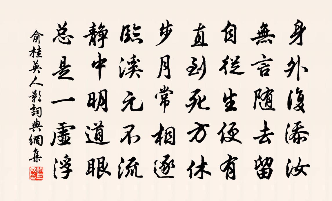 詩詞名句歷史字典書法欣賞書法字典國語詞典說文解字康熙字典古漢語字典標 題 作 者 詩 句 人影作者:俞桂英 朝代:宋代人影原文身外復添汝,無言隨去留。自從生便有,直到死方休。步月常相逐,臨溪元不流。靜中明道眼,總是一虛浮。詩詞問答問:人影的作者是誰?答:俞桂英問:人影寫於哪個朝代?答:宋代俞桂英人影書法欣賞人影書法作品詩詞推薦晉祠歐陽修〔宋代〕古城南出十裡間,鳴渠夾路何潺潺。行人望祠下馬謁,退即祠下窺水源。地靈草木得余潤,鬱郁古柏含蒼煙。並兒題黃山方勉〔明代〕杖黎得得入雲看,中有幽篁下有蘭。百道飛泉鳴玉佩,千尋石柱架瓊巒。隔林幢影招青鳥,出洞簫聲送彩鸞。地位扇子詩李石〔宋代〕先睡也須先覺,多文也須多學。如此沒量大人,不知可畏可藐。次韻時進叔二十六韻黃庭堅〔宋代〕時子河上園,竹間開棟宇。大兒勝衣冠,小兒豐頰輔。嫁女與朱公,伏臘可稱舉。發疏雖蒼浪,齒嚼未齟齬。雞棲相公竹王陶〔宋代〕已枯斷竹鈞私被,既沒賢公帝念深。仆木偃禾如不起,至今誰識大忠心。大風與楊念三飲次作此張耒〔宋代〕北風黃雲捲髮沙,吹暗長安百萬家。溫爐對酒慎勿出,且看酒面生浮花。我為吟詩說雲夢,荊江洞庭方洶湧。吟成橐籥歌張繼先〔宋代〕休言大道無為作,須向房中明橐籥。過時不動片時閒,紫霧紅光亂灼灼。青龍喜, * 惡,赤蛇纏定烏龜殼。縱然小池荷葉雨聲楊萬里〔宋代〕午夢西湖泛煙水,畫船撐入荷花底。雨聲一陣打疏蓬,驚開睡眼初蒙松。乃是池荷跳急雨,散了真珠又還聚。幸然陶淵明醉石項安世〔宋代〕石君匪招陶,陶子豈知石。偶然一醉間,成此千年跡。當時素心人,鄰里今誰宅。悠然獨君在,入我晦翁室。翁去東平蓬萊驛夜宴平盧楊判官醉後贈別姚太守置酒留宴獨孤及〔唐代〕驛樓漲海壖,秋月寒城邊。相見自不足,況逢主人賢。夜清酒濃人如玉,一斗何啻直十千。木蘭為樽金為杯,江南喚仙閣樓鑰〔宋代〕多少尋仙更不還,渺茫竟墮有無閒。使其真有毋庸喚,仙自曾城我自山。夢中作釋文珦〔宋代〕棄置何足憂,貧賤元非病。山邊水邊行,頗適幽人情。柴門絕輪鞅,蒼苔滿修徑。忽聽漁者歌,還動江湖興。瑞鷓鴣史鑄〔宋代〕底事秋英色壓黃。喜行春令惜紅妝。謝天分付千年品,特地攙先九日香。陶令駭觀須把酒,崔生瞥見誤成章。蜂情家風陸游〔宋代〕春耕秋釣舊家風,門巷荒寒屋壁空。四海交情殘夢裡,一生心事斷編中。買魚日待攜籃女,裹藥時從挾簏翁。便廢辭輦行鮑溶〔唐代〕漢家代久淳風薄,帝重微行極荒樂。青娥三千奉一人,班女不以色事君。朝停玉輦詔同載,三十六宮皆眄睞。不驚蜀路薛能〔唐代〕劍閣緣雲拂斗魁,疾風生樹過龍媒。前程憩罷知無益,但是駑蹄亦到來。春遊曲三首張仲素〔唐代〕煙柳飛輕絮,風榆落小錢。濛濛百花里,羅綺競鞦韆。騁望登香閣,爭高下砌台。林間踏青去,席上意錢來。行樂三月審知以余行有日置酒於智門寺後竹間小亭趙蕃〔宋代〕林下有高興,眼前無此流。並溪村逕入,背佛野亭投。綠竹依人好,紅蕖取意秋。病多寬酒債,別近耿離憂。水調歌頭劉志淵〔元代〕人道無生趣,日就月相和。高奔用顯鳥飛,離外宿靈柯。秀孕蕊珠嘉瑞,光射銀蟾皎潔,顯現月中娥。相會瑤池宴山中九日郭印〔宋代〕信馬幽尋慣,重陽未及家。清游貪翠巘,素約負黃花。縱目心先折,經秋鬢欲華。因循時節過,底處覓流霞。名句推薦東飛伯勞西飛燕,黃姑織女時相見。蕭衍《東飛伯勞歌》 是以堯稱則天,不屈潁陽之高;武盡美矣,終全孤竹之潔。范曄《後漢書·列傳·逸民列傳》 無人收廢帳,歸馬識殘旗。張籍《沒蕃故人》 致虛極;守靜篤。老子《老子·道經·第十六章》 東面望者不見西牆,南鄉視者不睹北方呂不韋《呂氏春秋·覽·有始覽》 上有好者,下必有甚焉者矣。孟子《孟子·滕文公章句上·第二節》 世上無難事,只怕不專心。佚名《增廣賢文·下集》 夜來風雨聲,花落知多少。孟浩然《春曉》 落日無人松徑里,鬼火高低明滅。薩都剌《念奴嬌·登石頭城次東坡韻》 鵬北海,鳳朝陽。辛棄疾《鷓鴣天·送廓之秋試》