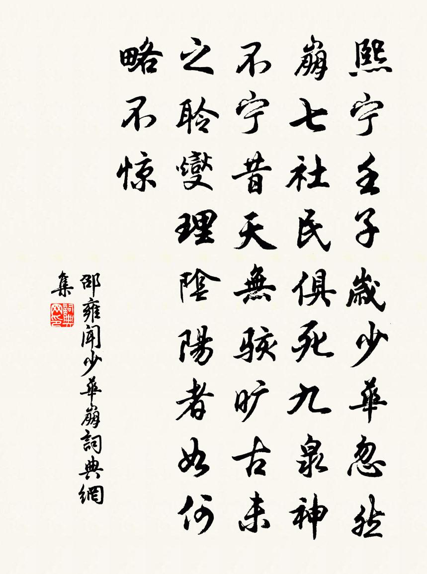 詩詞名句歷史字典書法欣賞書法字典國語詞典說文解字康熙字典古漢語字典標 題 作 者 詩 句 聞少華崩作者:邵雍 朝代:宋代聞少華崩原文熙寧壬子歲,少華忽然崩。七社民俱死,九泉神不寧。昔天無駭,曠古未之聆。燮理陰陽者,如何略不驚。詩詞問答問:聞少華崩的作者是誰?答:邵雍問:聞少華崩寫於哪個朝代?答:宋代邵雍聞少華崩書法欣賞聞少華崩書法作品詩詞推薦對菊雪岩〔宋代〕菊花相菊一長歡,公是公非話總難。以道義交堪傲俗,得漁樵趣不須官。紛紛落葉山初瘦,隱隱平沙雁已寒。天氣水龍吟(會慶節)曹勛〔宋代〕翠簾遲晚,龍樓麗日,海宇明新霽。樞旋大電,虹流華渚,陽春天氣。出震乘乾,保民立政,垂衣裳治。誕恩均九送元道人還水西寺徐鉉〔唐代〕李白高吟處,師歸掩竹關。道心明月靜,詩思碧雲閒。綠樹寒凌雪,飛泉響遍山。自慚丘壑志,皓首不知還。明禁忌蘇拯〔唐代〕陰陽家有書,卜築多禁忌。土中若有神,穴處何無祟。我識先賢意,本誡驕侈地。恣欲創樓台,率情染朱翠。四面樂府雜曲鼓吹曲辭艾如張李賀〔唐代〕錦襜褕,繡襠襦,強強飲啄哺爾雛。隴東臥穗滿風雨,莫信龍媒隴西去。齊人織網如素空,張在野春平碧中。網絲採蓮歇拍/採蓮令史浩〔宋代〕其間有洞天侶,思游塵世。珠葆搖曳。華表真人,清江使者,相從密議。此老遨嬉。我輩應須隨侍。正舉步、忽思夢遊滄海歌楊維楨〔元代〕東海之東去國十萬里,其洲名滄洲。地方五百里,上有瓊濤玉浪出沒九岫如羅浮。風光長如二三月,琪花玉樹不識題九仙宮龔伯璵〔宋代〕桃花流水隔人間,千古高風不可攀。綠樹陰中孤鶴宿,碧潭深處九龍蟠。雨餘芝術香丹室,夜半風雲繞石壇。富貴短歌行,贈王郎司直杜甫〔唐代〕王郎酒酣拔劍斫地歌莫哀,我能拔爾抑塞磊落之奇才。豫章翻風白日動,鯨魚跋浪滄溟開。且脫佩劍休裴回,西得秘閣賜讌送右諫議大夫种放得假歸終南山應製楊億〔宋代〕瑣闈聊輟皂囊封,賜告歸尋一畝宮。關路蒲輪千里遠,嚴扉蕙帳幾年空。百壺天酒凝甘露,二雅宸章掩大風。舊隱偈傾一百三十三首釋法薰〔宋代〕解語非乾舌,能言不是聲。斬新提活句,冬後一陽生。紅樓慢(贈太守楊太尉)吳則禮〔宋代〕聲懾燕然,勢壓橫山,鎮西名重榆塞。乾霄百雉朱闌下,極目長河如帶。玉壘涼生過雨,簾卷晴嵐凝黛。有城頭、送友下第游雁門劉駕〔唐代〕相別灞水湄,夾水柳依依。我願醉如死,不見君去時。所詣星斗北,直行到猶遲。況復挈空囊,求人悲路岐。北門春日獨登蓬萊閣章岷〔宋代〕郡閣高檐半納雲,危欄徙倚惜芳辰。澄潮疊嶂新經雨,啼鳥開花各為春。案有箋毫難賦景,席無歌管懶邀賓。自憐宿麻平驛顧在鎔〔唐代〕及到怡情處,暫忘登陟勞。青山看不厭,明月坐來高。犬為孤村吠,猿因冷木號。微吟還獨酌,多興憶同袍。送章碣赴舉羅隱〔唐代〕苹鹿歌中別酒催,粉闈星彩動昭回。久經罹亂心應破,乍睹昇平眼漸開。顧我昔年悲玉石,憐君今日蘊風雷。龍門宛陵道院成用吳尚書韻王遂〔宋代〕傳街軋軋度車聲,夾道翩翩共雁行。色養正須夸獨樂,真廉何得似雙清。便當坐進傳吾道,何必求為身後名。大字集賢宿直寄中書李梁二舍人楊億〔宋代〕耿耿銀釭照直廬,西風黃葉滿庭除。愁心不忍聞賓雁,病眼猶能拾蠢魚。欹枕微吟空展轉,繞廊閒步自躊躇。銅龍黃乾見約小飲就宿趙汝鐩〔宋代〕病後何人慰寂寥,長須持簡忽相招。溪山見說為樓爽,杖屨寧辭卻郭遙。柳絮一天晴舞雪,松聲十里夜聞潮。談詩溫泉易士達〔宋代〕當日溫泉浴太真,豈知繡襪解塵生。更於洗滑凝脂處,尚憶胡兒在錦繃。名句推薦且欲近尋彭澤宰,陶然共醉菊花杯。崔曙《九日登望仙台呈劉明府容》 少年不識愁滋味,愛上層樓。愛上層樓,為賦新詞強說愁。辛棄疾《醜奴兒·書博山道中壁》 應是天仙狂醉,亂把白雲揉碎。李白《清平樂·畫堂晨起》 黃河落天走東海,萬里寫入胸懷間。李白《贈裴十四》 行路難,不在水,不在山,只在人情反覆間。白居易《太行路》 此情可待成追憶?只是當時已惘然。李商隱《錦瑟》 挽弓當挽強,用箭當用長。杜甫《前出塞九首》 治國常富,而亂國常貧。管仲《管子·治國》 秋空明月懸,光彩露沾濕。孟浩然《秋宵月下有懷》 京國多年情盡改,忽聽春雨憶江南。虞集《聽雨》
