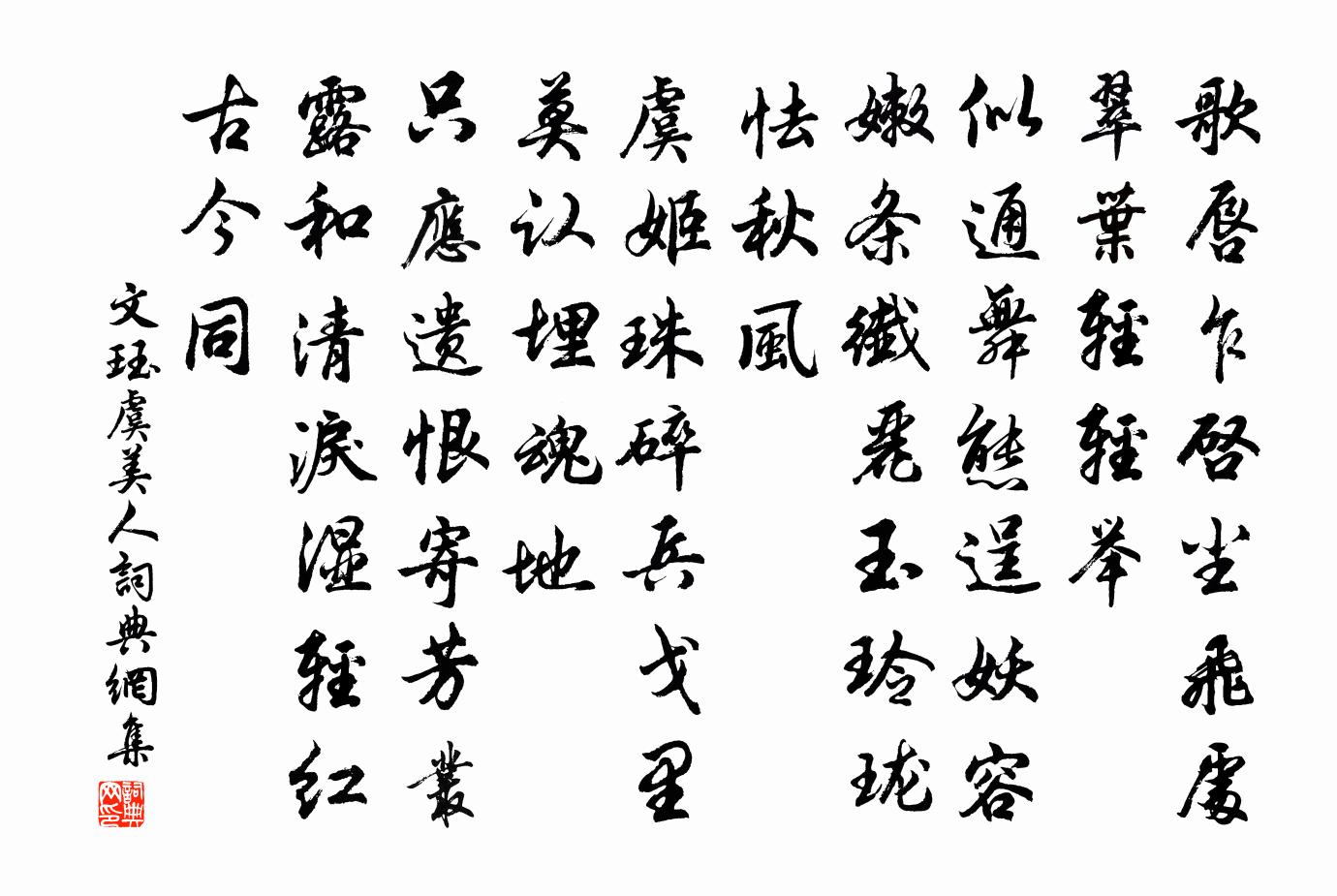 詩詞名句歷史字典書法欣賞書法字典國語詞典說文解字康熙字典古漢語字典標 題 作 者 詩 句 虞美人作者:文珏 朝代:宋代虞美人原文歌唇乍啟塵飛處。翠葉輕輕舉。似通舞態逞妖容。嫩條纖麗玉玲瓏。怯秋風。虞姬珠碎兵戈里。莫認埋魂地。只應遺恨寄芳叢。露和清淚濕輕紅。古今同。詩詞問答問:虞美人的作者是誰?答:文珏問:虞美人寫於哪個朝代?答:宋代問:虞美人是什麼體裁?答:詞文珏虞美人書法欣賞虞美人書法作品詩詞推薦齊宮溫庭筠〔唐代〕白馬雜金飾,言從雕輦回。粉香隨笑度,鬢態伴愁來。遠水斜如剪,青莎綠似裁。所恨章華日,冉冉下層台。山齋詩庾信〔南北朝〕寂寥尋靜室。蒙密就山齋。滴瀝泉澆路。穹窿石臥階。淺槎全不動。盤根唯半埋。圓珠墜晚菊。細火落空槐。直置東西馬塍董嗣杲〔宋代〕上城聚落界西東,業在澆畦奪化工。接死作生滋夜雨,變紅為白借春風。幾家衣食花姿異,兩岸池地勢同。病叟扶觀棋鄭俠〔宋代〕三百六十路,通精此有門。數奇藏日月,機發動乾坤。對面知為敵,渾輸卻有翻。詐貪常易喪,仁守乃長存。只子挽十一伯奉議四首黃公度〔宋代〕往者更聲律,公兮獨老成。餘波及猶子,作賦得虛名。瘴海三年別,靈岩一夢驚。歸來訪遺跡,心折涕縱橫。仙明洲口號李群玉〔唐代〕長愛沙洲水竹居,暮江春樹綠陰初。浪翻新月金波淺,風損輕雲玉葉疏。半浦夜歌聞盪槳,一星幽火照叉魚。二年挽荊南師張左司詩項安世〔宋代〕世已憎吾屬,天宜赦此賢。忍教名百代,不使壽中年。蘭謝無傅業,蘋荒久絕弦。淒涼楚江上,鴻影獨翩翩。詩一首許堅〔唐代〕只應天上路,不為下方開。道既學不得,仙人何處來。浣溪沙 花朝 曲阿詞綜翼有訴衷情清晨廉 卷洪翼〔元代〕鸞股先尋鬥草釵。鳳頭新繡踏青鞋。衣裳宮樣不須裁。雕玉鏤成鸚鵡架,泥金鐫就牡丹牌。明朝相約看花來。離城中張鎡〔宋代〕雨後溪流爾許深,枕堤樓閣靜沉沉。暫來殊郁登臨恨,欲別難禁去住心。倚檻乍離橋百尺,繫船猶戀柳千尋。黃錯山行晚歸趙孟堅〔宋代〕背日踏寒影,歸程路覺長。水流逢石響,花晚度秋香。前去多林莽,新傳有虎狼。行行應勿緩,掠面已風霜。題大安寺通禪師院貫休〔唐代〕應行諸岳遍,象屣半無綱。一法尋常說,此機仍未忘。窗閒藤影老,衲厚瀑痕荒。寄語迷津者,來茲問不妨。三月望日微雨汎舟西湖四首張鎡〔宋代〕堤樹枝條老更成,豈容他處夏陰清。東風不惜吹芳草,綠滿鵝兒燕子情。秋夜舟中作陸游〔宋代〕沽酒黃葉村,炊飯紅蓼岸。居人不孰何,正作漁父看。漁父我所羨,尚恐不得作。讀書端自痴,遊宦亦何樂?四顧詠蟹李貞白〔唐代〕蟬眼龜形腳似蛛,未曾正面向人趨。如今飣在盤筵上,得似江湖亂走無。怪石曾幾〔宋代〕眼前突兀見此石,怪怪奇奇俱可人。為問何如潘騎省,世間妍醜本非真。離汝寄張子黃庭堅〔宋代〕草枯木落晚淒淒,目斷黃塵聽馬嘶。想子重行分首處,荒涼巢父井亭西。寄石隱之潘閬〔宋代〕獨上危樓返照間,亂鴉群鳥噪回還。故人歲暮在何處,空見千山與萬山。書贈舊渾二曹長王建〔唐代〕二年同在華清下,入縣門中最近鄰。替飲觥籌知戶小,助成書屋見家貧。夜棋臨散停分客,朝浴先回各送人。僮僕瓶插月桂裘袞繡球甚麗錢時〔宋代〕月桂鬧裝紅欲滴,繡球圓簇白如霜。我無艷眼相酬答,付與庭花自在黃。名句推薦不充詘於富貴,不遑遑於所欲。姚察、姚思廉《梁書·列傳·卷五十》 賈生年少虛垂淚,王粲春來更遠遊。李商隱《安定城樓》 遙看孟津河,楊柳郁婆娑。佚名《折楊柳歌辭五首》 白梅懶賦賦紅梅,逞艷先迎醉眼開。曹雪芹《詠紅梅花得“梅”字》 新寒中酒敲窗雨,殘香細裊秋情緒。納蘭性德《菩薩蠻·新寒中酒敲窗雨》 烽火連三月,家書抵萬金。杜甫《春望》 曉迎秋露一枝新,不占園中最上春。杜牧《紫薇花》 黃鳥翩翩楊柳垂,春風送客使人悲。高適《東平別前衛縣李寀少府 / 送前衛縣李宷少府》 玉爐香,紅蠟淚,偏照畫堂秋思。溫庭筠《更漏子·玉爐香》 不惜千金買寶刀,貂裘換酒也堪豪。秋瑾《對酒·不惜千金買寶刀》