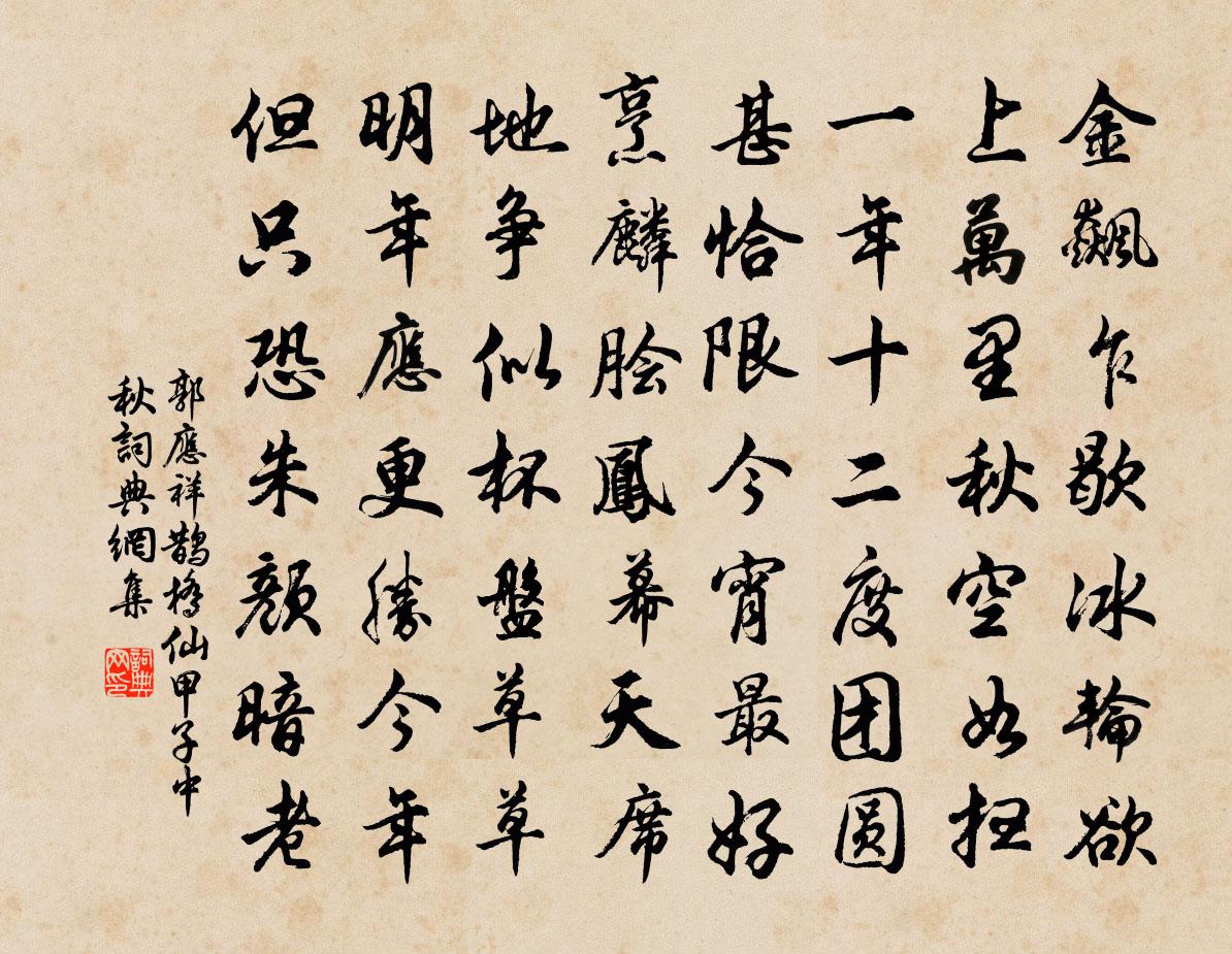 詩詞名句歷史字典書法欣賞書法字典國語詞典說文解字康熙字典古漢語字典標 題 作 者 詩 句 鵲橋仙(甲子中秋)作者:郭應祥 朝代:宋代鵲橋仙(甲子中秋)原文金飆乍歇,冰輪欲上,萬里秋空如掃。一年十二度團圓,甚恰限、今宵最好。烹麟膾鳳,幕天席地,爭似杯盤草草。明年應更勝今年,但只恐、朱顏暗老。詩詞問答問:鵲橋仙(甲子中秋)的作者是誰?答:郭應祥問:鵲橋仙(甲子中秋)寫於哪個朝代?答:宋代問:鵲橋仙(甲子中秋)是什麼體裁?答:詞郭應祥鵲橋仙(甲子中秋)書法欣賞鵲橋仙(甲子中秋)書法作品詩詞推薦贈洪道人圓定劉克莊〔宋代〕道人三昧力,手閱幾岩磚。既用功追琢,何憂質得堅。玉因石攻美,月以斧修圓。非遇良工剖,陶泓不受鐫。句繆瑜〔宋代〕有客去游丞相閣,無人來問孝廉船。落花呈王如山監簿翁森〔宋代〕落地飛花錦作堆,休言落後不如開。愛渠不逐波流去,自在陰崖覆綠苔。入南山至全師蘭若李益〔唐代〕木隕水歸壑,寂然無念心。南行有真子,被褐息山陰。石路瑤草散,松門寒景深。吾師亦何愛,自起定中吟。沁園春 寄劉光裔都事張之翰〔元代〕有手拿雲,有背摩空,相期昔年。記南方初下,送君硬語,東曹未滿,寄我奇篇。二十年間,數千里外,底事曾無五歌水鳥陸龜蒙〔唐代〕水鳥山禽雖異名,天工各與雙翅翎。雛巢吞啄即一例,游處高卑殊不停。則有觜鈹爪戟勁立直視者,擊搏挽裂圖膻再和資道晁說之〔宋代〕佳山陪四絕,名士出三齊。芬馥生蘭茞,荒蕪去菉藜。光華深北斗,氣象到西奎。揮毫若吐霓。美求鮮鯉鱠,珍訪偶題二首劉言史〔唐代〕金榜榮名俱失盡,病身為庶更投魑。春娥慢笑無愁色,別向人家舞柘枝。得罪除名謫海頭,驚心無暇與身愁。中使顯應觀桃花周弼〔宋代〕白雲隨鶴乘將去,深碧桃花滿故宮。三十六簧明月夜,不知何處吸春風。游金山寺呈茂老蒲壽宬〔宋代〕長江氣勢何雄雄,波心幻出青蓮宮。江流萬古浮不去,疑有根蒂誰能窮。遡流遠見一培塿,傳聞壯觀疑談空。風帆蓮塘盧方春〔宋代〕蓮塘有清氣,永認千周窗開。引滴不待瓢,折筩為酒杯。飲罷坐閒石,林杪風徐來。仰天忽大笑,微吟行綠苔。和慎思秋日同文館詩蔡肇〔宋代〕秸卵因時化,如何赴越雞。逸群來冀北,屏氣入淮西。盛事兼三物,浮辭斥百題。慎須精藻鑒,寵辱異雲泥。和劉賓客玉蕣薛濤〔唐代〕瓊枝的皪露珊珊,欲折如披玉彩寒。閒拂朱房何所似,緣山偏映月輪殘。紹興祀岳鎮海瀆四十三首佚名〔宋代〕我祀孔肅,神其安留。容興裴回,若止若浮。洽此重觴,申以百羞。無以對遺,萬邦之休。重葉梅李龍高〔宋代〕雪片層層簇玉林,寒窗光炯照人心。春風著物須平等,那得工夫有淺深。山居詩釋延壽〔宋代〕何如深谷一遺人,宴坐經行不累身。廢宅可嗟頻換主,凋叢愁見幾回春。尖尖石笑煙籠碧,點點苔錢雨先新。堪笑王夢得捕蝗二首章甫〔宋代〕相逢每嘆俱飄流,尊酒作意同新秋。蝗蟲日來復滿野,府帖夜下還呼舟。江天尚黑客騎馬,草露未晞人牧牛。路長送彭大老提舶泉南孫應時〔宋代〕人言西府厭編摩,歸臥方山意若何。出處無心亦無累,寧知世上有風波。春過函谷關於鄴〔唐代〕幾度作遊客,客行長苦辛。愁看函谷路,老盡布衣人。歲遠關猶固,時移草亦春。何當名利息,遣此絕征輪。純甫以予去歲九日赴東陽今年復趨府作菊花問強至〔宋代〕問籬菊,何事秋香欠春馥。淵明歲歲走征途,冷落重陽誰采劚。名句推薦故明主必謹養其和,節其流,開其源,而時斟酌焉。荀子《荀子·富國》 草滿池塘水滿陂,山銜落日浸寒漪。雷震《村晚》 乘我大宛馬,撫我繁弱弓。張華《壯士篇》 馬作的盧飛快,弓如霹靂弦驚。辛棄疾《破陣子·為陳同甫賦壯詞以寄之》 春來茗葉還爭白,臘盡梅梢盡放紅。韓元吉《送陸務觀福建提倉》 織婦何太忙,蠶經三臥行欲老。元稹《織婦詞》 明眸皓齒誰復見,只有丹青余淚痕。蘇軾《虢國夫人夜遊圖》 龜言此地之寒,鶴訝今年之雪。庾信《小園賦》 明日隔山嶽,世事兩茫茫。杜甫《贈衛八處士》 楚鄉飛鳥沒,獨與碧雲還。錢起《送夏侯審校書東歸》