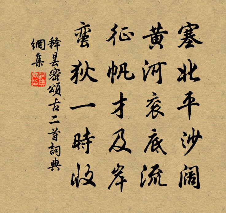 詩詞名句歷史字典書法欣賞書法字典國語詞典說文解字康熙字典古漢語字典標 題 作 者 詩 句 頌古二首作者:釋曇密 朝代:宋代頌古二首原文塞北平沙闊,黃河袞底流。征帆才及岸,蠻狄一時收。詩詞問答問:頌古二首的作者是誰?答:釋曇密問:頌古二首寫於哪個朝代?答:宋代釋曇密頌古二首書法欣賞頌古二首書法作品詩詞推薦秋夜獨坐(一作邢邵詩)袁朗〔唐代〕危弦斷客心,虛彈落驚禽。新秋百慮淨,獨夜九愁深。枯蓬唯逐吹,墜葉不歸林。如何悲此曲,坐作白頭吟。臨江仙蔡伸〔宋代〕繁杏枝頭蜂蝶亂,香風闔坐微聞。靚妝濃艷任東君。無情風雨,春事已平分。珍重主人留客意,夜闌秉燭開尊。何點絳唇(紫陽寒食)陳與義〔宋代〕寒食今年,紫陽山下蠻江左。竹籬煙鎖。何處求新火。不解鄉音,只怕人嫌我。愁無那。短歌誰和。風動梨花朵。換巢鸞鳳(梅意花庵作春情)史達祖〔宋代〕人若梅嬌。正愁橫斷塢,夢繞溪橋。倚風融漢粉,坐月怨秦簫。相思因甚到纖腰。定知我今,無魂可銷。佳期晚,暮春月內署書閣前海棠花盛開率爾七言八韻寄張洎〔宋代〕去歲海棠花發日,曾將詩句詠芳妍。今來花發春依舊,君已雄飛玉案前。驟隔清塵樞要地,獨攀紅蘂艷陽天。疏枝中秋風雨驟作悵然有懷簡全真沅陵並寄成父弟趙蕃〔宋代〕酒盡雲間月,詩成雨至風。支離如病鶴,吟詠雜寒蟲。摵摵朝梧葉,蕭蕭瘦竹風。飄零偶天末,憔悴只江東。蜀州鄭史君寄鳥觜茶,因以贈答八韻薛能〔唐代〕鳥觜擷渾牙,精靈勝鏌鋣。烹嘗方帶酒,滋味更無茶。拒碾乾聲細,撐封利穎斜。銜蘆齊勁實,啄木聚菁華。鹽損初授太府丞言懷王建〔唐代〕除書亦下屬微班,喚作官曹便不閒。檢案事多關市井,聽人言志在雲山。病童喚著唯行慢,老馬鞭多轉放頑。此去南征閨怨詩陰鏗〔南北朝〕湘水舊言深。征客理難尋。獨愁無處道。長悲不自禁。逢人憎解佩。從來懶聽音。唯當有夜鵲。南飛似妾心。寄亨甫鄧肅〔宋代〕晴空當晝棲暘蟲,目林欲焚深甑中。多謝吾君肯相訪,袖中詩句來清風。愛主我堪犬馬比,采蕨山巔行餓死。豈能依韻和陳秘校見寄梅堯臣〔宋代〕鬱郁東堂桂,常期接袂攀。羽翰殊不及,蓬蓽卻空還。江水幾經歲,監中無壯顏。音塵能見問,誰道隔雲山。呂稚卿唐彥范並賦游西池亦成菲句鄭獬〔宋代〕青翰龍舟雲外橫,黃金殿閣鏡中明。波光柳色恰相似,酒味人心俱有情。醉灑珠璣留滿紙,晚騎鸞鳳下層城。遊人四賢古風壽帥閫和安老人彭止〔宋代〕煌煌王侯族,富貴甘如蜜。飄飄不仙侶,翅舉自蓬蓽。且如王子晉,玉笙吹已畢。白鶴忽來尋,乘虛氣何逸。劉安郭氏山林十六詠閟雲關陸游〔宋代〕白雲如高人,擇友尚傲世。朱門客三千,一點不可致。慶元戊午重九天氣晴和侍七兄提舉監丞早集清周必大〔宋代〕午風和氣借春來,雨足黃花越節開。要識重陽真富貴,弟兄一日曆三台。詩一首黃景說〔宋代〕居鄉如處子,居官如戰士。處子常畏人,戰士惟有死。兒曹書諸紳,勿謂平平耳。病中書懷呈友人溫庭筠〔唐代〕逸足皆先路,窮郊獨向隅。頑童逃廣柳,羸馬臥平蕪。黃卷嗟誰問,朱弦偶自娛。鹿鳴皆綴士,雌伏竟非夫。采地宴餞李員外許渾〔唐代〕病守江城眼暫開,昔年吳越共銜杯。膺舟出鎮虛陳榻,鄭履還京下隗台。雲葉漸低朱閣掩,浪花初起畫檣回。心期古宮怨王建〔唐代〕乳烏啞啞飛復啼,城頭晨夕宮中棲。吳王別殿繞江水,後宮不開美人死。寶覺僧房戴復古〔宋代〕溪近泉聲在枕邊,月移梅影到窗前。水沈煙冷燈花落,半夜酒醒人不眠。名句推薦父母呼,應勿緩。父母命,行勿懶。李毓秀《弟子規·入則孝》 古人今人若流水,共看明月皆如此。李白《把酒問月·故人賈淳令予問之》 星河秋一雁,砧杵夜千家。韓翃《酬程延秋夜即事見贈》 十年無夢得還家,獨立青峰野水涯。謝枋得《武夷山中》 至今不會天中事,應是嫦娥擲與人。皮日休《天竺寺八月十五日夜桂子》 雷填填兮雨冥冥,猿啾啾兮狖夜鳴;屈原《九歌》 救人須救急,施人須當厄。馮夢龍《醒世恆言·卷十》 床前明月光,疑是地上霜。李白《靜夜思》 一月可曾閒幾日,百年難得閏中秋。慧霖《閏中秋玩月》 秋到長門秋草黃。畫梁雙燕去,出宮牆。薛昭蘊《小重山·秋到長門秋草黃》