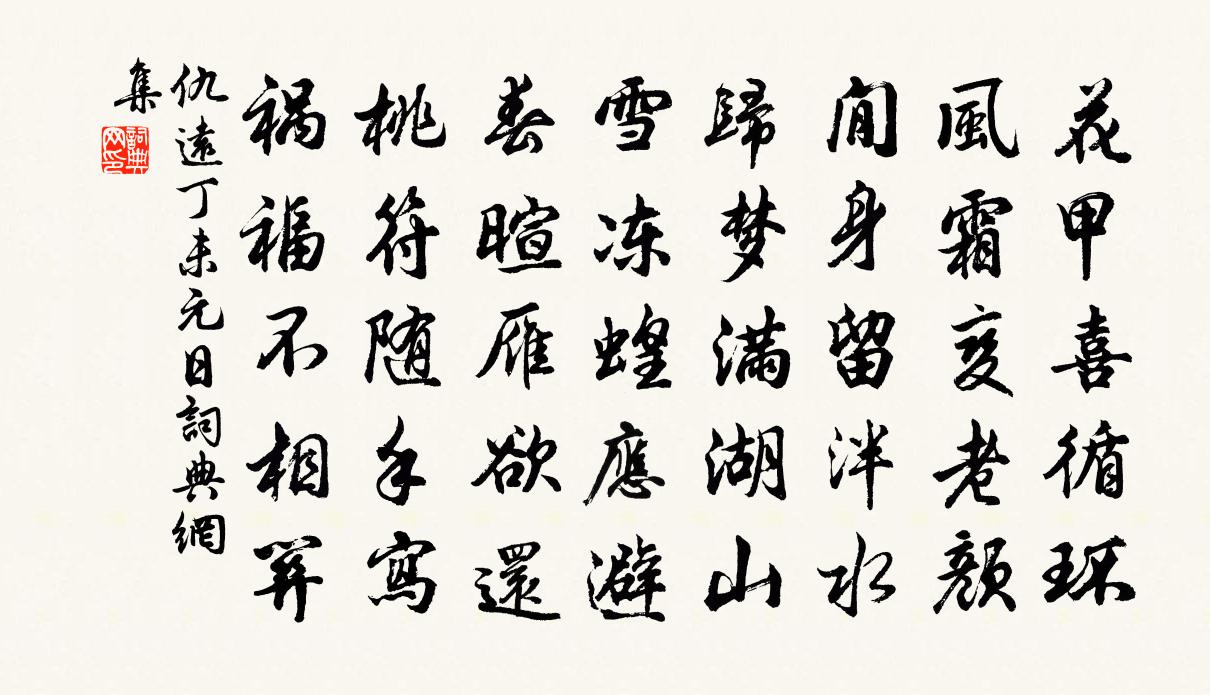 詩詞名句歷史字典書法欣賞書法字典國語詞典說文解字康熙字典古漢語字典標 題 作 者 詩 句 丁未元日作者:仇遠 朝代:宋代丁未元日原文花甲喜循環,風霜變老顏。閒身留泮水,歸夢滿湖山。雪凍蝗應避,春暄雁欲還。桃符隨手寫,禍福不相關。詩詞問答問:丁未元日的作者是誰?答:仇遠問:丁未元日寫於哪個朝代?答:宋代仇遠丁未元日書法欣賞丁未元日書法作品詩詞推薦喜韓少府見訪胡令能〔唐代〕忽聞梅福來相訪,笑著荷衣出草堂。兒童不慣見車馬,走入蘆花深處藏。贈孫十五道人葉適〔宋代〕將軍橋畔女仙家,年與鍾馗宴與花。欲度世人無妙訣,睡長留日信檐牙。三閣詞二首徐照〔宋代〕龔孔與麗華, * 章宵晝。只知歡似前,豈知禍萌後。春秋戰國門靈輒周曇〔唐代〕失水枯鱗得再生,翳桑無地謝深情。朱輪未染酬恩血,公子何由見赤誠。答王維留宿祖詠〔唐代〕四年不相見,相見復何為。握手言未畢,卻令傷別離。升堂還駐馬,酌醴便呼兒。語嘿自相對,安用傍人知。開爐次夕以不禁離抱來訪宏庵挑燈細語漏促忘施樞〔宋代〕客里情懷不自如,夜深來訪子云居。挑燈細按新翻曲,拂案同看舊架書。梧葉敲風蛩砌冷,菊香銷雨鶴庭虛。相逢次韻文少激祈雨有感黃庭堅〔宋代〕窮儒憂樂與民同,何況朱輪職勸農。終日虀鹽供一飯,幾時膚寸冒千峰。未須丘垤占鳴鸛,只要朝廷起臥龍。從此新春詞鄭獬〔宋代〕小池春破玉玲瓏,聲觸簾鉤漸好風。閒繞欄乾掐花樹,春痕已著半梢紅。舟中戲書釋紹嵩〔宋代〕喬木荒城古渡頭,鳥啼花落水空流。從吾所好煙波上,祗在船中老便休。訪曇師趙汝鐩〔宋代〕道人云外住,小逕入庵幽。乾老梅逾瘦,林疏竹自修。揀茶相伴煮。補線有停抽。此事如何說,下山歸去休。文湖漁唱趙瞻〔宋代〕湖光瀲灩之蓮荷,欸乃漁郎貫此過。笛韻吹殘紅蓼岸,櫓聲搖出錦鱗窩。狂歌明月間愁少,放浪扁舟適興多。蓴菜擬白馬篇滕岑〔宋代〕白馬紫游韁,意氣何飄揚。五陵富貴子,人謂天上郎。春華動新鞭,□蓋生輝光。行經幾台觀,下馬毬鞠場。吹彈次韻贈西謂之龔穎〔宋代〕膽怯何由戴鐵冠,只緣昭代獎孤寒。曲肱未遂違前志,直指無聞是曠官。三署每傳朝客說,五溪閒憑郡樓看。祝君送趙國開赴湘陰陳文蔚〔宋代〕聽取閩山父老謠,屢曾遊戲試牛刀。雙鳧澤國翩翩去,一鶚秋風漸漸高。書至水忘千樹橘,政成須種滿城桃。早歸窮冬逆旅曾豐〔宋代〕日月隙中容易過,歸期我與歲相蹉。雪霜使氣張湯酷,風日容情下惠和。木葉先凋歸宿早,梅花後發得春多。輿台謁同年許使君德開陽枋〔宋代〕欲造詩壇奪錦標,幾回躡足愧還休。君提妙律都先手,我漫家吟浪出頭。濟世自憐無絕力,叩閽剛道有嘉猷。先生上安晚節丞相三首釋道璨〔宋代〕日食何曾費萬錢,只將苜蓿薦春盤。俸余不用肥奴馬,留買青山取性看。山家暮春陸游〔宋代〕行飯獨相羊,扶藜過野塘。晴光生蝶粉,暖律變鶯吭。美群兒競,蠶飢小婦忙。深知遊宦惡,窮死勿離鄉。書與士瞻上人十首仇遠〔宋代〕豪氣年來漸埽除,簞瓢自樂守臞儒。江頭盡醉唐朝士,澤畔行吟楚大夫。萬里鵾鵬何必羨,一官蟣虱不如無。葛巾調笑令呂南公〔宋代〕華草。華草。秀髮乘春更好。深心密竹紛紛。妖韶隨處動人。人動。人動。王孫公子情重。名句推薦滿地殘紅宮錦污,昨夜南園風雨。王安國《清平樂·春晚》 得其所白,不可謂無白;得其所堅,不可謂無堅。公孫龍《公孫龍子·堅白論》 用功於內者,必於外無所求王永彬《圍爐夜話·第一八八則》 燕簾鶯戶,雲窗霧閣,酒醒啼鴉。張炎《朝中措·清明時節》 楚鄉飛鳥沒,獨與碧雲還。錢起《送夏侯審校書東歸》 高岸為谷,深谷為陵。佚名《十月之交》 六朝文物草連空,天淡雲閒今古同。杜牧《題宣州開元寺水閣閣下宛溪夾溪居人》 佇立傷神。無奈輕寒著摸人。朱淑真《減字木蘭花·春怨》 山中夜來月,到曉不曾看。元好問《倪莊中秋》 風暖有人能作伴,日長無事可思量。楊基《浣溪沙·上巳》