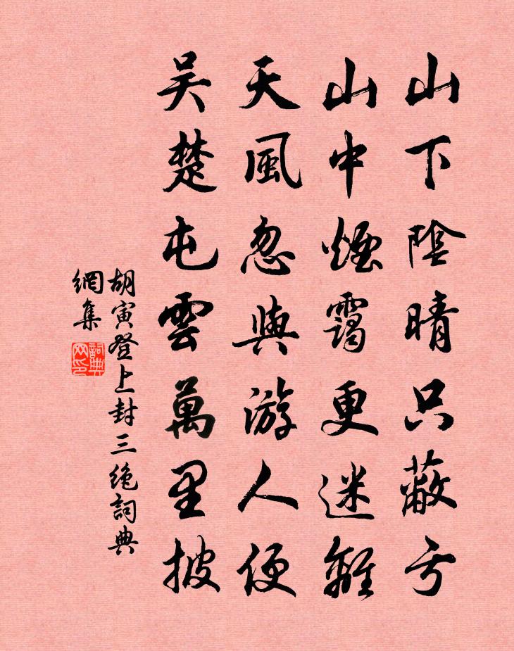 詩詞名句歷史字典書法欣賞書法字典國語詞典說文解字康熙字典古漢語字典標 題 作 者 詩 句 登上封三絕作者:胡寅 朝代:宋代登上封三絕原文山下陰晴只蔽虧,山中煙靄更迷離。天風忽與遊人便,吳楚屯雲萬里披。詩詞問答問:登上封三絕的作者是誰?答:胡寅問:登上封三絕寫於哪個朝代?答:宋代胡寅登上封三絕書法欣賞登上封三絕書法作品詩詞推薦題鄭大有隱居李商隱〔唐代〕結構何峰是,喧閒此地分。石樑高瀉月,樵路細侵雲。偃臥蛟螭室,希夷鳥獸群。近知西嶺上,玉管有時聞。過商山貫休〔唐代〕吟緣橫翠憶天台,嘯狖啼猿見盡猜。四個老人何處去,一聲仙鶴過溪來。皇城宮闕回頭盡,紫閣煙霞為我開。天際東宮壽章崔敦禮〔宋代〕吹銅和氣集佳祥,鬱鬱蔥蔥震色蒼。山嶽東明開寶禁,星辰南極注瑤觴。龍樓照日浮秋曉,象輅朝天馥御香。分土戲詠閒適陸游〔宋代〕剡曲稽山是故鄉,人言景物似瀟湘。三升花露春壺滿,八尺風漪午枕涼。樹合綠陰山鵲鬧,盆鐫紫石水梔香。回思故侍讀黃公輓詩權安節〔宋代〕西南人物早推先,入踐華途譽望全。朱邸談經忠貫日,黃扉批敕力回天。敬王素學真無負,憂國沉疴竟莫痊。初政偈頌十首釋如淨〔宋代〕秋風清,秋月明,大地山河露眼睛。瑞岩點瞎重相見,棒喝交馳驗衲僧。呈李知卿法曹趙蕃〔宋代〕使者趨朝後,參軍捧檄初。重湖來至險,兩月聽閒居。豈是拘形投,真成畏簡書。祠官請已再,郵傳報何疏。風雨和曹憲金華山韻上李雁湖吳泳〔宋代〕百卉冬具腓,喬松立霜雪。老枝自擎重,既晚逾秀髮。勁挺真在臣,回邪走妖月。金非百鍊剛,那不因翠屑。漁父詞釋圓〔宋代〕本是瀟湘一釣客,自東自西自南北。只把孤舟為屋宅。無寬窄,幕天席地人難測。省中寓直次劉巨濟職方韻兼示祠部張台卿李復〔宋代〕鋃鐺司鑰禁門重,寓直高秋此夜同。樓外歸雲迎霽月,宮中傳漏帶疏風。衰迂豈合參新論,俊就算何堪接野翁。華頌石頭和尚草庵歌釋印肅〔宋代〕明窗內,晃晃絕塵無覆草。指作菩提卻不真,白頂門開全領會。趙山台蓮花方丈釋了惠〔宋代〕一芙蕖是一毗耶,一葉春風一室開。三萬二千師子座,藕絲竅裹涌將來。皇雅十首《皇治》三章尹洙〔宋代〕皇底其治,欽哉惟刑。在疑而宥,罔察為明。愛怒弗肆,孰為重輕。毋一弗辜,惟典之平。永遇樂王吉昌〔元代〕妙契天輪,斡樞七政,玉衡旋轉。潛運升沉,推窮造化,一氣三奇變。龜精蟾髓,鸞精烏血,滾滾鼎中烹煉。玄珠送陳昈歸麻川杜荀鶴〔唐代〕麻川清見底,似入武陵溪。兩岸山相向,三春鳥亂啼。酒旗和柳動,僧屋與雲齊。即此吾鄉路,懷君夢不迷。謁金門 效前人首句用山人字醉中答友張翥〔元代〕山人坐。把酒歌呼相和。起舞盡教烏帽墮。歸來頭不裹。浮世人情歷過。身外虛名參破。除卻醉鄉無別個。神仙天迂叟白居易〔唐代〕一辭魏闕就商賓,散地閒居 * 春。初時被目為迂叟,近日蒙呼作隱人。冷暖俗情諳世路,是非閒論任交親。應須偈頌一百三十六首釋惟一〔宋代〕楊岐栗棘蓬,吞著礙喉嚨。東山鐵餕餡,渾侖苦磝磝。諸人若要省力,不如參一個平實。楚王渡江得萍實。大如斗燕來巢方岳〔宋代〕吾貧席自無家,席客戶寄村席疃。槿籬月三間,荒寒天不席。燕亦何所聞,乃於我乎館。豈以菊未莎,而有竹可款花心動(七夕)張元乾〔宋代〕水館風亭,晚香濃、一番芰荷新雨。簟枕乍閒,襟裾初試,散盡滿天袢暑。斷雲卻送輕雷去。疏林外、玉鉤微吐。名句推薦淡盪春光寒食天。玉爐瀋水裊殘煙。李清照《浣溪沙·淡盪春光寒食天》 承恩不在貌,教妾若為容。杜荀鶴《 * 怨》 背燈和月就花陰,已是十年蹤跡十年心。納蘭性德《虞美人·銀床淅瀝青梧老》 大德不官,大道不器,大信不約,大時不齊。戴聖《禮記·學記》 窮且益堅,不墜青雲之志。王勃《滕王閣序》 父子之嚴,不可以狎;骨肉之愛,不可以簡。顏之推《顏氏家訓·教子篇》 行人刁鬥風沙暗,公主琵琶幽怨多。李頎《古從軍行》 哀蟬無留響,叢雁鳴雲霄。陶淵明《己酉歲九月九日》 不信妾腸斷,歸來看取明鏡前。李白《長相思三首》 常隨寶鐙陪金勒,絕塞指揮萬馬嘶。俞益謨《中洲株柳》