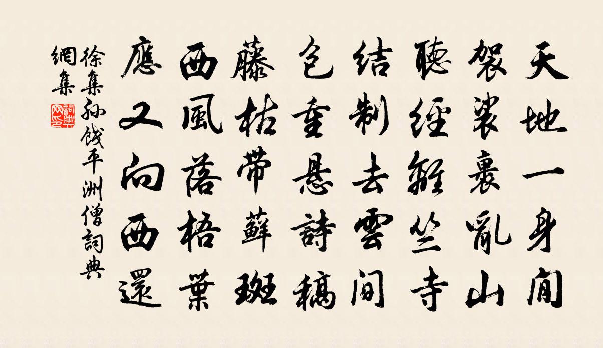 詩詞名句歷史字典書法欣賞書法字典國語詞典說文解字康熙字典古漢語字典標 題 作 者 詩 句 餞平洲僧作者:徐集孫 朝代:宋代餞平洲僧原文天地一身閒,袈裟裹亂山。聽經離竺寺,結制去雲間。包重懸詩稿。藤枯帶蘚斑。西風落梧葉,應又向西還。詩詞問答問:餞平洲僧的作者是誰?答:徐集孫問:餞平洲僧寫於哪個朝代?答:宋代徐集孫餞平洲僧書法欣賞餞平洲僧書法作品詩詞推薦郡齋即事書懷十二韻呈諸官楊億〔宋代〕長樂疏鍾自厭聞,漢庭誰不惜離群。舟浮一水波瀾闊,路入千山杳靄分。郡閣先憂迷簿領,村田聊得問耕耘。疲民送稱上人賈島〔唐代〕歸蜀擬從巫峽過,何時得入舊房禪。寺中來後誰身化,起塔栽松向野田。再次韻答余司理陳造〔宋代〕雨來不後晴不遲,今晴昔雨皆可詩。自憐老去才易盡,平日尚有黃絹辭。挑燈初聽鼕鼕鼓,南風收盡檐間雨。麥根松隱坐上寄錢大參曹勛〔宋代〕閒里光陰不記名,曲勤宏度訪公榮。五雲灑翰情文厚,九節浮香琖色輕。寶箑含風清致爽,彩絲縈臂眼增明。團欒贈畫者徐琛陳長方〔宋代〕我行江南江北山,真賞會心那可數。獨愛黃陵古廟前,四水粘天迷浦漵。胸中歷歷著山川,有句如枝不容吐。欲將送傑上人歸成都陸游〔宋代〕錦城一別鬢成絲,今日山陰送傑師。亂絮飛花撲行路,正如東郭放船時。秋日郊居陸游〔宋代〕山雨霏微鴨頭水,溪雲細薄魚鱗天。幽尋自笑本無事,羽扇筇枝上釣船。青玉案劉辰翁〔宋代〕稠塘舊是花千樹。曾泛入、溪深誤。前度劉郎重喚渡。漫山寂寂,年時花下,往往無尋處。一年一度相思苦。恨不所居首夏,水木尤清,適然有作皮日休〔唐代〕病來無事草堂空,晝水休聞十二筒。桂靜似逢青眼客,松閒如見綠毛翁。潮期暗動庭泉碧,梅信微侵地障紅。盡日小園宋庠〔宋代〕節物過芳苞,幽奇勝近郊。先秋蟬棄甲,背歲鵲營巢。池小萍周岸,筠低露泣梢。摽梅資宴豆,賜臛佐晨庖。夕塢相見歡(見月聞笛八月五夜)李處全〔宋代〕新涼襟袂冷然。乍晴天。風送誰家羌管、月便娟。雲散盡,秋空碧,玉鉤懸。洗耳時聽三弄、等團圓。九張機佚名〔宋代〕輕絲。象床玉手出新奇。千花萬草光凝碧。裁縫衣著,春天歌舞,飛蝶語黃鸝。觀叔祖少卿奕棋黃庭堅〔宋代〕世上滔滔聲利間,獨憑棋局老青山。心游萬里不知遠,身與一山相對閒。夜半解圍燈寂寞,樽前翻卻酒闌珊。因觀惜花一首蘇籀〔宋代〕豁眼桃紅思聖解,襲人蘭郁比修能。面脂靡曼負塗澤,繪彩化工夸斲冰。茜粲芳穠觸吟境,艷陽風色嗾狂朋。傾壺桃源憶故人王道亨〔宋代〕劉郎自是桃花主。不許春風閒度。春色易隨風去。片片傷春暮。返魂不用清香炷。卻有梅花淡佇。從此鎮長相顧。趙玉汝自作戲墨見寄各題六言其上鵓鳩方岳〔宋代〕村北村南雨暗,舍東舍西水生。去婦復還何日,煙蓑處處春耕。次韻仲殊雪中游西湖二首蘇軾〔宋代〕寶雲樓閣鬧千門,林靜初無一鳥喧。閉戶莫教風掃地,捲簾疑有月臨軒。水光瀲灩猶浮碧,山色空濛已斂昏。乞得上古之什補亡訓傳十三章燕於巢一章顧況〔唐代〕(燕於巢,審日辰也,燕不以甲乙銜泥。)燕燕於巢,綴葺維戊。甲兮乙兮,不宜有謬。飛龍在天,雲掩於斗。曷頌古一百則釋正覺〔宋代〕百草頭上無邊春,信手拈來用得親。丈六金身功德聚,等閒攜手入紅塵。塵中能作主,化外自來賓。觸處生涯隨分念奴嬌蔡伸〔宋代〕輕雷驟雨,洗千岩濃翠,層巒森列。衣袂涼生,叢竹外、時有飛螢明滅。雲浪鱗鱗,蘭舟泛泛,共載一輪月。五湖名句推薦王顧左右而言他。孟子《孟子·梁惠王章句下·第六節》 離離原上草,一歲一枯榮。白居易《草 / 賦得古原草送別》 薄霧濃雲愁永晝,瑞腦銷金獸。李清照《醉花陰·薄霧濃雲愁永晝》 慷慨十年長劍在,登樓一笑暮山橫。崔允《花馬池詠》 人之聰明,多失於浮炫脫脫《金史·列傳·卷三十三》 菊暗荷枯一夜霜。新苞綠葉照林光。蘇軾《浣溪沙·詠橘》 半天涼月色,一笛酒人心。袁枚《夜過借園見主人坐月下吹笛》 槐葉初勻日氣涼,蔥蔥鼠耳翠成雙。范成大《夏日田園雜興》 青海陣雲匝,黑山兵氣沖。高適《塞下曲》 足不強則跡不遠,鋒不銛,則割不深。王充《論衡·卷十三·超奇篇》