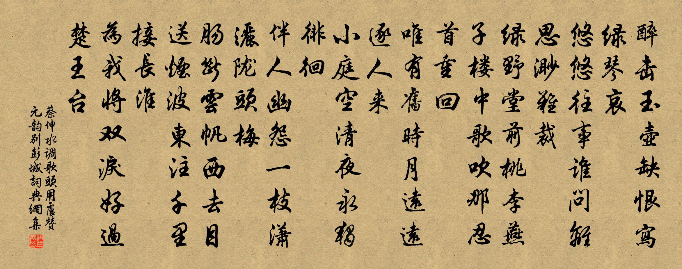 詩詞名句歷史字典書法欣賞書法字典國語詞典說文解字康熙字典古漢語字典標 題 作 者 詩 句 水調歌頭(用盧贊元韻別彭城)作者:蔡伸 朝代:宋代原文醉擊玉壺缺,恨寫綠琴哀。悠悠往事誰問,離思渺難裁。綠野堂前桃李,燕子樓中歌吹,那忍首重回。唯有舊時月,遠遠逐人來。小庭空,清夜永,獨徘徊。伴人幽怨,一枝瀟灑隴頭梅。腸斷雲帆西去,目送煙波東注,千里接長淮。為我將雙淚,好過楚王台。詩詞問答問:《水調歌頭(用盧贊元韻別彭城)》的作者是誰?答:蔡伸問:該詩寫於哪個朝代?答:宋代問:該詩是什麼體裁?答:詞書法欣賞水調歌頭(用盧贊元韻別彭城)書法作品詩詞推薦和傅寺丞竹穩之什讀書堂陳宓〔宋代〕閉門聲吾咿,世仰德行成。祿仕非有意,邦國須公榮。區區刀筆徒,未足稱股肱。其日雨聞姚黃開戲成詩二章呈子駿堯夫司馬光〔宋代〕小雨留春春未歸,好花雖有恐行稀。勸君披取漁蓑去,走看姚黃判濕衣。瑞鶴仙(壽)張元乾〔宋代〕喜西園放鑰。對燕寢香潤,棠陰寒薄。東風夜來惡。禁菸時天氣,鶯啼花落。新晴共約。怕韶光、容易過卻。把銅紹興祀皇地祗十五首佚名〔宋代〕於穆盛禮,肅肅在宮。幾事有初,直於東榮。條濯是謹,惟寅惟清。祗芳柔嘉,享茲我誠。自述杜荀鶴〔唐代〕四海欲行遍,不知終遇誰。用心常合道,出語或傷時。擬作閒人老,慚無識者嗤。如今已無計,只得苦於詩。梁雅樂歌 諴雅 二沈約〔南北朝〕地德薄。昆丘峻。揚羽翟。鼓應朄。出尊祗。展誠信。招海瀆。羅岳鎮。惟福祉。鹹昭晉。冷泉林洪〔宋代〕一泓清可沁詩脾,冷暖年來只自知。流出西湖載歌舞,回頭不是在山時。壽某翁吳泳〔宋代〕當日 * 抑未猜,貴公元自有仙材。文辭敏妙真星魄,學問沈潛是聖胎。黃石授兵非有意,紅旗破賊卻歸來。阿同晚晴趙蕃〔宋代〕溪雨無常度,陰晴日幾回。山容朝政合,水面晚仍開。乍覺巉岩盡,又看平遠來。高人欠摩詰,空為襪留材。天津晚步呂公著〔宋代〕芝蓋久稀疏,暮雲空坱北。千年舊都城,一片閒宮闕。禁御尚連延,觚稜猶嶻嶭。橋勢橫雌霓,堤形偃初月。瀍澗頌古一○一首釋子淳〔宋代〕木人來問青霄路,石女年尊似不聞。攜手相將歸故國,暮山芨芨鎖重雲。滿江紅·正月十三日送文安國還朝蘇軾〔宋代〕天豈無情?天也解、多情留客。春向暖、朝來底事,尚飄輕雪?君過春來紆組綬,我應歸去耽泉石。恐異時、懷酒張冠卿以前詩懷哉各努力人物古來少句為十詩陳傅良〔宋代〕冥心觀宇宙,孰是同與各。夜旦無反惡,日出星河落。此有齊人瑟,彼有荊人璞。嗟余耳目短,豈故重然諾。初歸鹹寧宅坐北齋作二首宋庠〔宋代〕柳市西頭最遠坊,歸來先掃讀書堂。閒園別有風流意,無限苔花上石床。送僕射相公赴西京王禹偁〔宋代〕五十升端揆,西郊任保厘。偶拋三事重,未失百僚師。府縣威儀引,宮城管鑰隨。粗官嫌出將,劇位是留司。櫻筍上巳日送韓簡伯王銍〔宋代〕門戶荀陳士論僉,卻隨王謝老江南。一官傲世妨才命,萬事承家任苦甘。漁艇我將還舊隱,僧窗誰與對清談。落花用前韻酬鄭山長楊公遠〔宋代〕短鬢蕭蕭已半霜,從教憔悴勝東陽。磨穿老硯畫成趣,撚斷吟髭句不香。月下行歌閒放逸,酒邊起舞發清狂。欲過官田行高斯得〔宋代〕噫呼嘻樂哉,鹹淳三年之秋大有年。近自浙可東西江與淮,遠及七閩二廣連四川。黃雲一望千萬里,莫辨東西南北漳南示義軍寄邑人譚野臣曾淵子〔宋代〕漳州城南煙霧深,漳州城北氛氣侵。憶從奸邪賣和議,漢廷君臣愁至今。乘輿播遷天地怒,殘軍掩泣眠星霧。黃金垂柳邵雍〔宋代〕門前垂柳正依依,更被東風來往吹。忘了自家今已老,卻疑身是少年時。名句推薦守職而不廢,處義而不回。黃石公《素書·正道》 嘆十年心事,休休莫莫。吳潛《滿江紅·豫章滕王閣》 莫道藍橋路遠,行雲中隔幽坊。吳文英《風入松·為友人放琴客賦》 滄浪之水清兮,可以濯我纓;佚名《滄浪歌》 我歌月徘徊,我舞影零亂。李白《月下獨酌四首·其一》 野店桃花紅粉姿,陌頭楊柳綠菸絲。趙孟頫《東城》 安民之術,在於豐財。豐財者,務本而節用也。陳壽《三國志·魏書·任蘇杜鄭倉傳》 禁里疏鍾官舍晚,省中啼鳥吏人稀。王維《酬郭給事 / 贈郭給事》 故園渺何處,歸思方悠哉。韋應物《聞雁》 沙上並禽池上暝。雲破月來花弄影。張先《天仙子·水調數聲持酒聽》