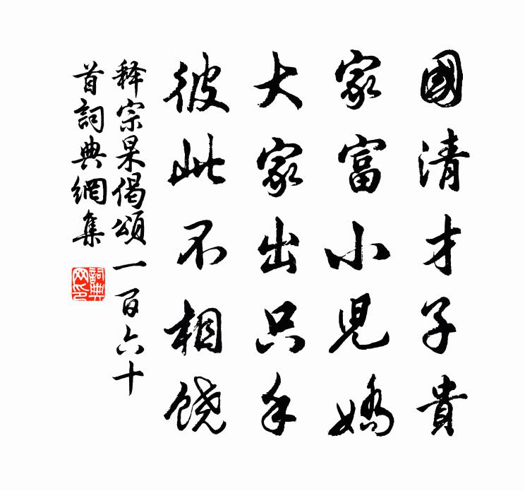 詩詞名句歷史字典書法欣賞書法字典國語詞典說文解字康熙字典古漢語字典標 題 作 者 詩 句 偈頌一百六十首作者:釋宗杲 朝代:宋代偈頌一百六十首原文國清才子貴,家富小兒嬌。大家出只手,彼此不相饒。詩詞問答問:偈頌一百六十首的作者是誰?答:釋宗杲問:偈頌一百六十首寫於哪個朝代?答:宋代釋宗杲偈頌一百六十首書法欣賞偈頌一百六十首書法作品詩詞推薦西江月蕭廷之〔宋代〕一二復臨養火,兔雞沐浴潛藏。分明變化在中央。結就玄珠片餉。還返歸根托體,守城抱一提防。黃庭來往是尋常橫吹曲辭。出塞沈佺期〔唐代〕十年通大漠,萬里出長平。寒日生戈劍,陰雲搖旆旌。飢烏啼舊壘,疲馬戀空城。辛苦皋蘭北,胡霜損漢兵。自在觀音贊釋心月〔宋代〕日高花影重,風暖鳥聲碎。在在圓通門,門門觀自在。寶陀峰頂較些些,片月分輝照滄海。宮詞王珪〔唐代〕十三垂髻螺鬆,學舞經年後苑中。近日昭儀抄姓字,一時宣撥人東宮。記夢陸游〔宋代〕夢不出心境,曠然成遠遊。花殘杜城醉,木落華山秋。戰血磨長劍,塵痕洗故裘。那知覺來處,身臥五湖舟。阮郎歸佚名〔宋代〕門兒高掛艾人兒。鵝兒粉撲兒。結兒綴著小符兒。蛇兒百索兒。紗帕子,玉環兒。孩兒畫扇兒。奴兒自是豆娘兒。南山留題和呂元錫韻某府判〔宋代〕詞源浩渺浙江潮,倒瀉銀河落九霄。貝闕珠宮春不老,蓬萊瀛海路非遙。多君訪古曾攜手,愧我勞生漫折腰。擬欲送宋中道鄭州拜掃梅堯臣〔宋代〕酣酣道旁杏,戢戢壠上柏。不知煙火禁,但感風露易。開關掃墓隧,向樹系車軶。灑淚有餘悲,麒麟高几尺。偈傾一百三十三首釋法薰〔宋代〕不坐空王殿,不掛本來衣。何須便恁麽,切忌未生時。疊石溪二首司馬光〔宋代〕道傍行採藥,石底臥題名。野老相迎拜,溪童乍見驚。存沒口號蘇泂〔宋代〕陶山松柏日夜長,屋下兒孫漸滿堂。當時侍傍五男子,考叔之羹曾未嘗。隴頭水徐陵〔南北朝〕隴頭流水急。水急行難渡。半入隗囂營。傍侵酒泉路。心交賜寶刀。小婦裁紈素。欲知別家久。戎衣今已故。題懶庵二首劉子翬〔宋代〕地偏賓至稀,晝靜門常掩。深房紙瓦明,宴坐薄團穩。庭花落未掃,徑草繁不剪。林泉倦出遊,況乃市朝遠。和利州鮮于轉運公劇八詠竹軒司馬光〔宋代〕茲軒最灑落,歷歷種琅玕。正書簿書稀,蕭蕭風雨寒。翠陰涼宴坐,疏韻承清歡。錦籜裁夏扇,玉筍供春盤。晴蝸御街行(賦轎)高觀國〔宋代〕藤筠巧織花紋細。稱穩步、如流水。踏青陌上雨初晴,嫌怕濕、文鴛雙履。要人送上,逢花須住,才過處、香風起望月婆羅門 懷古王寂〔元代〕笑談尊俎,坐中驚嘆謫仙人。烏絲落筆如神。喚起小鬟風味,學按古陽春。對瓊枝璧月,朝暮長新。宦萍此身。嘆和謝景英提乾曹勛〔宋代〕公家繡戶壓城垣,物采隨時入懶軒。人倚層樓風滿檻,江涵秋影月當門。剩聞薌淥羅襦麗,醉看金荷燭影昏。可但上致用院李同知論海舶熊禾〔宋代〕易經致民用,肇自羲農先。耒耜既生聚,市易還懋遷。公私不交病,本末無倒懸。古人致主術,稱物靡有偏。厥初新婚別杜甫〔唐代〕兔絲狗附蓬狗,引蔓故不長。嫁女與征夫,不如棄路旁。結髮為妻子,狗不暖君狗。暮婚晨告別,無乃太匆忙。君奏宣列之樂歌舞江淹〔南北朝〕殷崇配天。周尊明祀。瑞合汾陰。慶同泰畤。青幕雲舒。丹殿霞起。二曜惟新。五精告始。於以享之。景福是履。名句推薦平岸小橋千嶂抱。柔藍一水縈花草。王安石《漁家傲·平岸小橋千嶂抱》 蕙風如薰,甘露如醴。左思《三都賦》 故國梅花歸夢,愁損綠羅裙。孔夷《南浦·旅懷》 雨色秋來寒,風嚴清江爽。李白《酬裴侍御對雨感時見贈》 佳節清明桃李笑,野田荒冢只生愁。黃庭堅《清明》 河橋送人處,涼夜何其。周邦彥《夜飛鵲·河橋送人處》 君子以同道為朋,小人以同利為朋脫脫《宋史·列傳·卷七十八》 一念開明,反身而誠王陽明《傳習錄·卷中·答陸原靜書》 孔雀東南飛,五里一徘徊。佚名《孔雀東南飛 / 古詩為焦仲卿妻作》 我亦飄零久!顧貞觀《金縷曲二首》