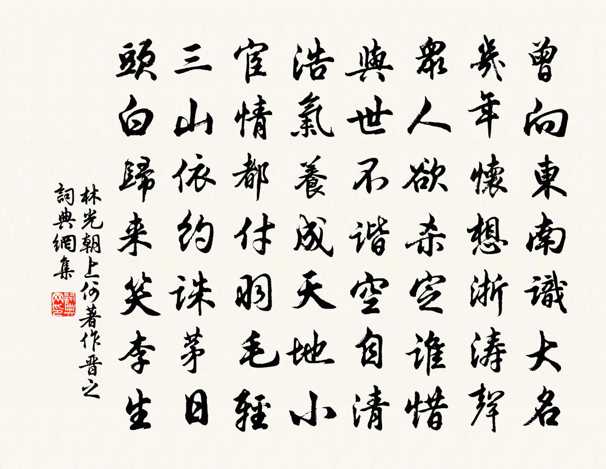 詩詞名句歷史字典書法欣賞書法字典國語詞典說文解字康熙字典古漢語字典標 題 作 者 詩 句 上何著作晉之作者:林光朝 朝代:宋代上何著作晉之原文曾向東南識大名,幾年懷想浙濤聲。眾人慾殺定誰惜,與世不諧空自清。浩氣養成天地小,宦情都付羽毛輕。三山依約誅茅日,頭白歸來笑李生。詩詞問答問:上何著作晉之的作者是誰?答:林光朝問:上何著作晉之寫於哪個朝代?答:宋代林光朝上何著作晉之書法欣賞上何著作晉之書法作品詩詞推薦和吳子華侍郎令狐昭化舍人嘆白菊衰謝之絕次用本韻韓偓〔唐代〕正憐香雪披千片,忽訝殘霞覆一叢。還似妖姬長年後,酒酣雙臉卻微紅。五代史宦官傳序歐陽修〔宋代〕自古宦者亂人之國,其源深於女禍。女,色而已,宦者之害,非一端也。 蓋其用事也近而習,其為心也專而忍南歌子高登〔宋代〕菊捻黃金嫩,杯傾琥珀濃。良辰何處寄萍蹤。短艇飄搖一葉、浪花中。鳳闕游娃館,幽坡賞梵宮。當年樂事總成空雙桃寄鞏經略三首姜特立〔宋代〕忽見雙桃入眼新,捧看驚動坐間賓。老夫得此渾無為,持壽高堂兩玉人。論語絕句一百首張九成〔宋代〕做人真箇亦誠難,臨死猶將手足看。今免一身非細事,一身之外更多端。見紫荊花韋應物〔唐代〕雜英紛已積,含芳獨暮春。還如故園樹,忽憶故園人。前之十首次詩釋行海〔宋代〕十五遊方今五十,駸駸白盡少年頭。看來造物真兒戲,憶著平生冷汗流。宇宙何須三兔窟,山川總是一菟裘。眼前郎中胡君出守三衢特枉長韻一篇曲敘故人之契宋庠〔宋代〕南宮仙客欲歸休,更領銅符越絕州。郎位雖嗟三不遇,友聲偏喜兩相求。朝端引籍辭群鷺,天外忘機信白鷗。行矣山行衛宗武〔宋代〕攜友行莫春,山南復山北。一川去縈紆,層林互倚伏。舍舟上孱顏,萬象鹹在目。野花衒殘紅,柔條曳新綠。春巒禪人並化主寫真求贊釋正覺〔宋代〕為僧{左屈右刂}剞,與世支離。目瞳青炯炯,頭髮白絲絲。劫空有句,真得無師。借功分照用,借位解提持。萬雨晴陸游〔宋代〕小雨初增氣慘淒,新晴差解病沉迷。虛廊靜院聽松籟,細草甘泉養鹿麛。寒靄細分山遠近,野歌相應路高低。孰知和劉後村梅花百詠方蒙仲〔宋代〕心事芬芬流品勝,一生清友是梅臞。可憐介甫交遊盡,歲晚鐘山進二俞。七寶玲瓏王哲〔元代〕人人每日,問人要求玄。你便待、做神仙。四四一十六個字,二十八字在眾賢。會得之時也未然。來俱不染,打破閨詞趙崇嶓〔宋代〕恨殺庭前鵲,難憑卜遠期。朝朝來報喜,誤妾畫雙眉。嘆笑方回〔宋代〕意外無憂心,予盡豈厭貧。索錢紛債主,賒藥愧醫人。坐喪高標盡,時驚俗態新。殘書亦懶讀,滿架付埃塵。夔州病中王周〔唐代〕隱几經旬疾未痊,孤燈孤驛若為眠。郡樓昨夜西風急,一一更籌到枕前。贈筆工沈秀榮仇遠〔宋代〕吾家歙石鋒芒出,不但挫墨亦挫筆。老懶作事苦不多,一筆才供兩三日。近知沈子藝希有,洗擇圓齊易入手。不論和劉補闕秋園寓興六首雍陶〔唐代〕水木夕陰冷,池塘秋意多。庭風吹故葉,階露淨寒莎。愁燕窺燈語,情人見月過。砧聲聽已別,蟲響復相和。閉門丫頭岩項安世〔宋代〕三十年前過,吾方似此山。山容似尚丱,吾鬢久成班。羞把娉婷嫁,長垂婑墮鬟。黃塵鳴帽底,愧汝若為顏。韓信王安石〔宋代〕貧賤侵凌富貴驕,功名無復在芻蕘。將軍北面師降虜,此事人間久寂寥。名句推薦嬌艷輕盈香雪膩,細雨黃鶯雙起。張泌《滿宮花·花正芳》 大直若屈,大巧若拙,大辯若訥。老子《老子·德經·第四十五章》 親愛我,孝何難。親憎我,孝方賢。李毓秀《弟子規·入則孝》 言不信者行不果。墨子《墨子·02章 修身》 南陵水面漫悠悠,風緊雲輕欲變秋。杜牧《南陵道中 / 寄遠》 一曲陽關,斷腸聲盡,獨自憑蘭橈柳永《少年游·參差煙樹灞陵橋》 回鞭指長安,西日落秦關。李白《登敬亭北二小山余時送客逢崔侍御並登此地》 復恐匆匆說不盡,行人臨發又開封。張籍《秋思》 刻薄成家,理無久享;倫常乖舛,立見消亡。朱柏廬《朱子家訓·全文》 暝色入高樓,有人樓上愁。李白《菩薩蠻·平林漠漠煙如織》