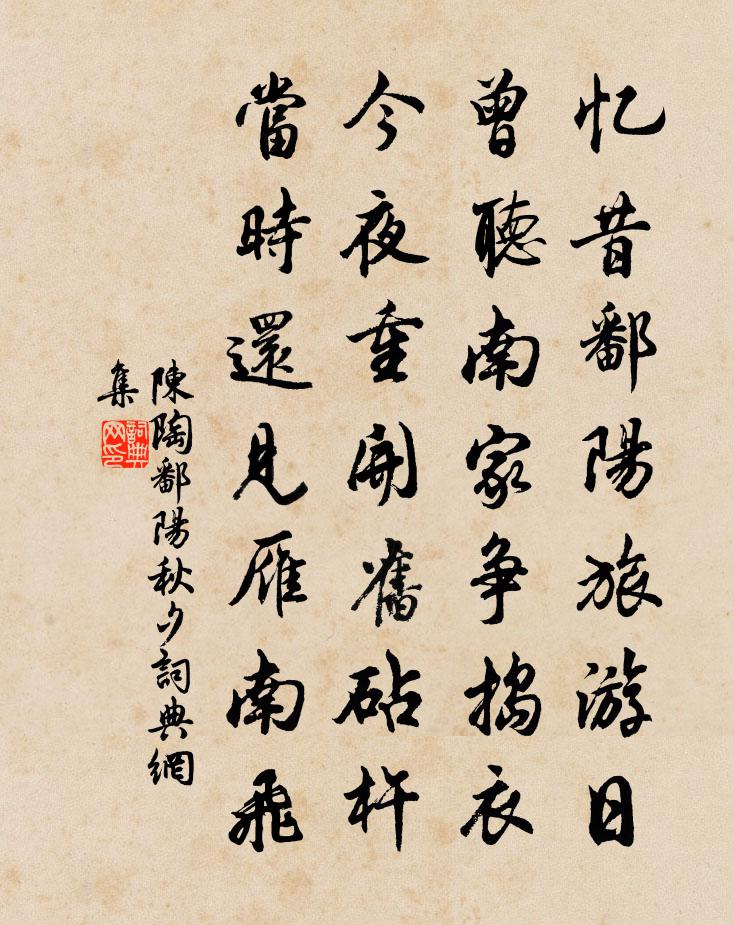 詩詞名句歷史字典書法欣賞書法字典國語詞典說文解字康熙字典古漢語字典標 題 作 者 詩 句 鄱陽秋夕作者:陳陶 朝代:唐代鄱陽秋夕原文憶昔鄱陽旅遊日,曾聽南家爭搗衣。今夜重開舊砧杵,當時還見雁南飛。詩詞問答問:鄱陽秋夕的作者是誰?答:陳陶問:鄱陽秋夕寫於哪個朝代?答:唐代問:鄱陽秋夕是什麼體裁?答:七絕陳陶鄱陽秋夕書法欣賞鄱陽秋夕書法作品注釋全唐詩:卷746-60詩詞推薦暮春書懷寄翁十趙師秀〔宋代〕帝里逢春雨不乾,才晴數日又春還。桐華半落官河水,榆葉全遮客舍山。未悔闊疏令事去,最憐乏絕壞身閒。菖蒲和董職方見賀誕子詩余靖〔宋代〕天幸依仁守列藩,佳篇為貺荷謙尊。固慙彝鼎無勛閥,且喜桑弧有子孫。豈比芳蘭庭下秀,預知苦李道傍繁。日臨賜楊億判秘監宋真宗〔宋代〕瑣闥往年司制誥,共嘉藻思類相如。蓬山今日詮墳史,還仰多聞過仲舒。報政列城歸覲後,疏恩高閣拜官初。諸生歸故園舒岳祥〔宋代〕辟兵辟寇走他方,六遍移家路轉長。百醉與君同出處,五窮隨我共行藏。柳花暗度誰家筆,燕子寒歸何處梁。最羨題法華寺絕頂禪家壁方乾〔唐代〕蒼翠岧嶢逼窅冥,下方雷雨上方晴。飛流便向砌邊掛,片月影從窗外行。馴鹿不知誰結侶,野禽都是自呼名。只應舟中漫興李新〔宋代〕梅雨冥冥濕釣船,失群寒鷺下江天。一聲長笛無窮意。自疊漁蓑白日眠。晚步裘萬頃〔宋代〕日落欲閉戶,風清聊杖藜。千山猶帶雨,一徑已無泥。虢虢水聲急,悠悠雲影低。催歸緣底事,著意旁人啼。詠史上伏生陳普〔宋代〕二兒並轡入公門,博局紛紛啟禍原。不及賈生何處是,弗將禮法教兒孫。山園小梅得疏影橫斜水清淺暗香浮動月黃十四趙時韶〔宋代〕一夜霜風吃緊吹,曉驚飛鳥蹴花枝。誰知窗外紛紛意,正是山陰雪下時。劉岩居士再和去年中秋見貽次韻姜特立〔宋代〕蒼茫雲海渺無津,玉戶初圓絕點塵。萬里共欣雲葉淨,一年爭看桂華新。狂吟定約六七友,低唱可無三兩人。今日題劉直卿崇蘭軒楊萬里〔宋代〕風亦何須過,林仍不厭深。莫將春色眼,來看歲寒心。政坐香通國,端令佩滿襟。楚人更饒舌,得免世間尋雜劇·李太白匹配金錢記喬吉〔元代〕第一折(沖末扮王府尹領張千上,詩云)束髮隨朝三十生,官居京兆有威權。可憐清操如秋水,不受人間枉法錢。郡中冬夜聞蛩姚合〔唐代〕秋蛩聲尚在,切切起蒼苔。久是忘情者,今還有事來。微霜風稍靜,圓月霧初開。此思誰能遣,應須執酒杯。轉調蝶戀花沈蔚〔宋代〕雞上清明初過雨。春色無多,葉底花如許。輕暖時聞燕雙語。等閒飛入誰家去。短牆東畔新朱戶。前日花前,把酒劉園程公許〔宋代〕陰沍必陽和,快晴差愜意。怒飈妒心賞,清游殊鮮味。擊船枯葦叢,悶損兀坐睡。斷港麴塵波,見引著勝地。逕梅山行愁思羅與之〔宋代〕日落煙欲橫,山寒翠將滴。荒村渺愁人,跬步觸四塞。路遙兩髀酸,頗恨身不翼。舍策還悵然,倦倚松下石。象弈各有等級四絕品四人高下文天祥〔宋代〕擊柱論功不忍看,築壇刑馬誓河山。當年絳灌知何似,只在春秋魯衛間。勸學詩 / 偶成朱熹〔宋代〕少年易老學難成,一寸光陰不可輕。(一作:少年易老學難成)未覺池塘春草夢,階前梧葉已秋聲。對雪奉餞任城六父秩滿歸京李白〔唐代〕龍虎謝鞭策,鵷鸞不司晨。君看海上鶴,何似籠中鶉。獨用天地心,浮雲乃吾身。雖將簪組狎,若與煙霞親。季父山寺陸游〔宋代〕路盡初逢寺,行行獨叩扉。民貧稀送供,僧老少完衣。日正樓鍾動,溪深藥草肥。吾衰亦久矣,舍此欲疇依?名句推薦客思吟商還怯。怨歌長、瓊壺暗缺。周密《玉京秋·煙水闊》 寒來暑往,秋收冬藏。周興嗣《千字文·全文》 桃花塢裏桃花庵,桃花庵裏桃花仙。唐寅《桃花庵歌》 田夫荷鋤至,相見語依依。王維《渭川田家》 江南春盡離腸斷,苹滿汀洲人未歸。寇準《江南春·波渺渺》 後不乏人,榮之方久,賢者自苦亦惠嗣。來俊臣《羅織經·固榮卷第六》 忙忙如喪家之狗,急急如漏網之魚。馮夢龍《醒世恆言·卷十七》 人事有代謝,往來成古今。孟浩然《與諸子登峴山》 朔方三度重陽節,河曲乾旌歲歲忙。齊之鸞《九日登清水營城》 學之興廢,隨世輕重。顏之推《顏氏家訓·勉學篇》