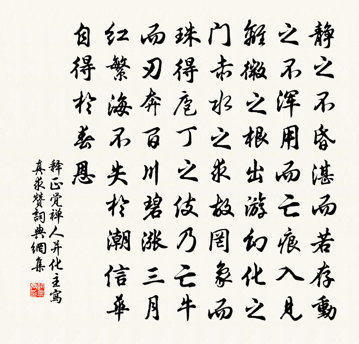 詩詞名句歷史字典書法欣賞書法字典國語詞典說文解字康熙字典古漢語字典標 題 作 者 詩 句 禪人並化主寫真求贊作者:釋正覺 朝代:宋代禪人並化主寫真求贊原文靜之不昏,湛而若存。動之不渾,用而亡痕。入見離微之根,出遊幻化之門。赤水之求故罔象而珠得,庖丁之伎乃亡牛而刃奔。百川碧漲,三月紅繁。海不失於潮信,華自得於春恩。詩詞問答問:禪人並化主寫真求贊的作者是誰?答:釋正覺問:禪人並化主寫真求贊寫於哪個朝代?答:宋代釋正覺禪人並化主寫真求贊書法欣賞禪人並化主寫真求贊書法作品詩詞推薦瑞鷓鴣(二之一)柳永〔宋代〕天將奇艷與寒梅。乍驚繁杏臘前開。暗想花神、巧作江南信,鮮染燕脂細翦裁。壽陽妝罷無端飲,凌晨酒入香腮。酬劉谷立春日吏隱亭見寄李郢〔唐代〕孤亭遙帶寺,靜者獨登臨。楚霽江流慢,春歸澤氣陰。野田青牧馬,幽竹暖鳴禽。日日年光盡,何堪故國心。春晚桐江上閒望作貫休〔唐代〕江上車聲落日催,紛紛擾擾起紅埃。更無人望青山立,空有帆沖夜色來。沙鳥似雲鍾外去,汀花如火雨中開。可憐詠筆詩蕭衍〔南北朝〕昔聞蘭蕙月。獨是桃李年。春心儻未寫。為君照情筵。送羅正子年兄出使二浙趙挺之〔宋代〕相逢三十春,歡宴殊未足。都門今見君,行意一何速。正之南國秀,德業素所畜。才名振京師,賢達競推轂。當年訴衷情沈蔚〔宋代〕深深院宇小池塘。一徑碧梧長。青春又歸何處,新筍綠成行。多少事,惱人腸。懶思量。香消一炷,睡起霎時,日午睡王鎡〔宋代〕枕書午睡正朦朧,雲翠風涼透葛中。喚醒一床蝴蝶夢,虬鴉聲在隔樓東。敬軒王朝佐〔宋代〕作聖階梯義甚明,豈容惰慢倒儀形。氣將六馬收銜轡,心不多歧守性靈。上帝鑒茲恆翼翼,主翁喚醒更惺惺。揭楣尋徐道士張籍〔唐代〕尋師遠到暉天觀,竹院森森閉藥房。聞入靜來經七日,仙童檐下獨焚香。正月三日驟暖多稼亭前梅花盛開四首楊萬里〔宋代〕絕愛西湖疏影詩,要知猶是未開時。如今開盡渾無縫,只見花頭不見枝。留贈杜牧〔唐代〕舞靴應任閒人看,笑臉還須待我開。不用鏡前空有淚,薔薇花謝即歸來。挽舟者歌佚名〔隋代〕我兄征遼東,餓死青山下。今我挽龍舟,又阻隋堤道。方今天下飢,路糧無些小。前去三千程,此身安可保!寒骨句釋曇穎〔宋代〕三世諸佛是奴婢,一大藏教是涕唾。滕昌佑芙蓉文同〔宋代〕雙乾發寒葩,一枿立紋羽。欲品精妙人,君當二三數。齊天樂佚名〔宋代〕天開圖畫江山秀。怪得人間希有。屏島精神,潭溪骨格,鍾作名門華胄。滿堂晝繡。甚禊集蘭亭,竹修林茂。得得閒詠陸游〔宋代〕平生到處足間關,天遣殘年樂故山。社日連村饜酒肉,豐年無盜伏茆菅。秋來梁燕將雛去,雨過林鳩喚婦還。我亦湖州歌九十八首 其五十八汪元量〔宋代〕一更船泊鄆州城,城外巡軍夜柝鳴。如此月圓如此客,猶能把酒到天明。雨中出湖上送客楊萬里〔宋代〕細雨輕煙著地昏,湖波真箇解生塵。淨慈靈隱君休覓,失卻諸峰不惱人。六和塔寺館三宿和秀江亭詩牌韻程公許〔宋代〕鯨呿鰲擲三神山,幻境起滅指顧間。東西帆穡來復去,得似上方僧獨間。看山看水知多少,詩債償殊未字了,膠膠王君貺宣徽輓詞三首蘇轍〔宋代〕妙年收賈傅,白首貴王陽。志氣文章在,功名歲月長。遺孫依舊德,故吏滿諸方。河朔三持節,斯民定不忘。謫墮名句推薦春去秋來也,愁心似醉醺。歐陽炯《巫山一段雲·春去秋來也》 世事浮云何足問,不如高臥且加餐。王維《酌酒與裴迪》 團扇不搖風自舉,盈盈翠竹,纖纖白薴,不受些兒暑。文徵明《青玉案·庭下石榴花亂吐》 默而識之,學而不厭,誨人不倦,何有於我哉!孔子弟子《論語·述而篇》 吳絲蜀桐張高秋,空山凝雲頹不流李賀《李憑箜篌引》 窮兵極武,仁者不為。令狐德棻《周書·列傳·卷二十七》 論德而定次,量能而授官。荀子《荀子·君道》 儉則傷事,侈則傷貨管仲《管子·乘馬》 風一更,雪一更,聒碎鄉心夢不成,故園無此聲。納蘭性德《長相思·山一程》 橫戈從百戰,直為銜恩甚。李白《塞下曲六首》