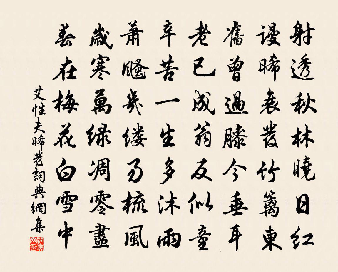 詩詞名句歷史字典書法欣賞書法字典國語詞典說文解字康熙字典古漢語字典標 題 作 者 詩 句 晞髮作者:艾性夫 朝代:宋代晞髮原文射透秋林曉日紅,謾晞衰發竹籬東。舊曾過膝今垂耳,老已成翁反似童。辛苦一生多沐雨,蕭颾幾縷易梳風。歲寒萬綠凋零盡,春在梅花白雪中。詩詞問答問:晞髮的作者是誰?答:艾性夫問:晞髮寫於哪個朝代?答:宋代問:晞髮是什麼體裁?答:七古艾性夫晞髮書法欣賞晞髮書法作品詩詞推薦訪子益趙汝鐩〔宋代〕揀得溪山住,三間草屋低。坐貧憂酒債,廢事悔棋迷。壁壞何時補,詩成無處題。留余余戒飲,白飯薦黃雞。已亥雜詩 21龔自珍〔清代〕滿擬新桑遍冀州,重來不見綠雲稠。書生挾策成何濟,付與維南織女愁。元豐二年十月政公改路故作此詩王安石〔宋代〕獨龍東路得平岡,始免遊人屐齒妨。更有主林身半現,與公隨轉作陰涼。歲暮書懷寄林玉溪戴復古〔宋代〕笑共梅花語,窮難與命爭。人皆居燠館,我獨墮寒坑。假合非吾道,幽棲了此生。門牆元自靜,群小莫從橫。句楊虞卿〔唐代〕河勢崑崙遠,山形菡萏秋。張正字母夫人朱氏輓詞范成大〔宋代〕苹藻儀邦媛,詩書了歲華。籯金寧遺子,群玉竟傳家。厚施心無斁,浮生自有涯。空餘報恩子,三載亦苴麻。浣溪沙 送劉仲元赴平定州親迎王惲〔元代〕青鳥西傳燕爾期。乘龍喜氣見修眉。芳*濃似去年時。禁臠名香天盼重,玉台春暖鏡鸞棲。人生樂處是新知。浣溪沙(和曾吉甫韻呈宋景晉待制。宋有二袓)向子諲〔宋代〕綠繞紅圍宋玉牆。幽蘭林下正芬芳。桃花氣暖玉生香。誰道廣平心似鐵,艷妝高韻兩難忘。蘇州老矣不能狂。和曇穎師四明十題宴坐岩梅堯臣〔宋代〕心危身亦危,衽席尚顛墜。如何岩石上,來坐自安意。能諭死生間,無論寤與寐。正月八日至十二日雪不止和施仲任韻郭印〔宋代〕天雨寶花呈上瑞,不同常歲旋能乾。痴兒詫見鹽成糝,戲仆圓搓玉作團。漏屋茅檐垂欲壓,華筵酒椀正禁寒。懸知同楊公濟賦破山得開字強至〔宋代〕無物終天地,青山豈免開。萬人鑱秀骨,一氣失全胚。漫貯崇朝雨,猶防浩劫灰。何年巨靈手,曾此擘崔嵬。餞管制乾李曾伯〔宋代〕畫諾三邊賴一賢,憐余東下病 * 。驅馳不憚數千里,繾綣相於十二年。我老已辜康樂屐,君行快著祖行鞭。祗慚送兄弟還都至長葛河上四首晚步韓維〔宋代〕愛此霽景侍,舍舟步高岸。夕陽照渡口,急急水紋亂。霜鴉田間鳴,沙鳥波上散。登臨豈非美,當軫別後嘆。踏莎行(春日有感)辛棄疾〔宋代〕萱草齋階,芭蕉弄葉。亂紅點點團香蝶。過牆一陣海棠風,隔簾幾處梨花雪。愁滿芳心,酒潮紅頰。年年此際傷離追和東坡梅花十絕王之道〔宋代〕盈盈終日對妝檯,一樹臨溪欲半開。吟賞不須期爛漫,恐隨春雨點蒼苔。壽教授方岳〔宋代〕精神天上石麒麟,器業無雙間世人。欲展經綸趨北闕,暫將去范董南閩。采衣戲處勸聲溢,絳帳開時瑞氣新。虔祝水龍吟京鏜〔宋代〕四年留蜀慚無補,好是求歸得去。風帆百尺,煙波萬里,寧辭掀舞。楚尾吳頭,我家何在,西山南浦。想珠簾畫棟送方時父劉克莊〔宋代〕向來羞作繞枝飛,劉表區區不足依。索飯兒嗔郎罷出,畫眉人約藁砧歸。食魚底處容長鋏,射虎今方尚短衣。老縛過臨平高翥〔宋代〕征帆一似白鷗輕,起揭船篷看曉晴。梅子著花霜奈岸,自披風帽過臨平。觀雲寄簡講師樓鑰〔宋代〕蒼狗俄然又白衣,來從何處去何歸。無心出岫還歸去,莫向秋風說是非。名句推薦今夕何夕,見此良人?佚名《綢繆》 一聲畫角譙門,豐庭新月黃昏,雪裡山前水濱。白樸《天淨沙·冬》 一寸相思一寸灰。蘇軾《南鄉子·集句》 桃未芳菲杏未紅,沖寒先已笑東風。曹雪芹《紅樓夢·第五十回》 敗莫大於不自知。呂不韋《呂氏春秋·論·不苟論》 離別一何久,七度過中秋。蘇轍《水調歌頭·徐州中秋》 記得年時臨上馬,看人眼淚汪汪。劉彤《臨江仙·千里長安名利客》 我最憐君中宵舞,道男兒到死心如鐵。辛棄疾《賀新郎·同父見和再用韻答之》 雪中何以贈君別,惟有青青松樹枝。岑參《天山雪歌送蕭治歸京》 凍臉有痕皆是血,酸心無恨亦成灰。曹雪芹《詠紅梅花得“梅”字》