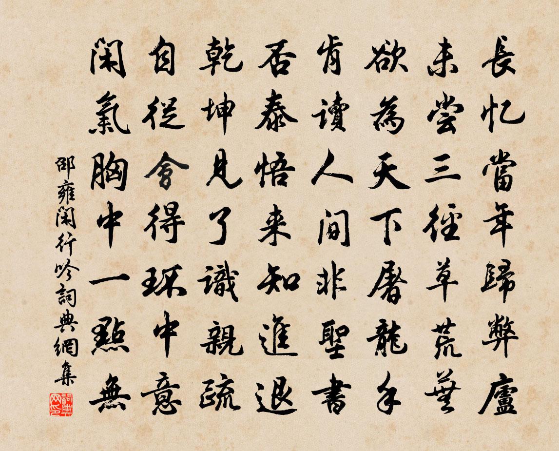 詩詞名句歷史字典書法欣賞書法字典國語詞典說文解字康熙字典古漢語字典標 題 作 者 詩 句 閒行吟作者:邵雍 朝代:宋代閒行吟原文長憶當年歸弊廬,未嘗三徑草荒蕪。欲為天下屠龍手,肯讀人間非聖書。否泰悟來知進退,乾坤見了識親疏。自從會得環中意,閒氣胸中一點無。詩詞問答問:閒行吟的作者是誰?答:邵雍問:閒行吟寫於哪個朝代?答:宋代邵雍閒行吟書法欣賞閒行吟書法作品詩詞推薦喜聞三十弟訊息李處權〔宋代〕喜得真訊息,仍安嶺表居。深知道路遠,不在信音疏。荔子應憐汝,檳榔敢笑渠。一年看又盡,兄弟意何如。九日復口洪咨夔〔宋代〕涼邊未放菊花斑,莫作重陽節物看。就網買魚風露重,推篷舉酒水天寬。箭頭歲月離弦易,局面功名下著難。慚愧寒食感事呈同官文同〔宋代〕三月八日值寒食,陰霾蔽空不肯收。北園花木殊未動,到處哭雨惟鳴鳩。吾曹可憐愛薄宦,甘此寂寞來山州。酒肴寄天封明老陸游〔宋代〕浪跡天台一夢中,距今四十五秋風。勝游回首似昨日,衰病侵人成老翁。聖寺參差石橋外,仙蓬縹緲玉霄東。因君花石詩十一章鄧肅〔宋代〕安得守令體宸衷,不復區區踵前蹤。但為君王安百姓,圃中無日不春風。鷓鴣天石耆翁〔宋代〕借問枝頭昨夜春。已傳訊息到柴門。頻看秀色無多艷,拖得清香不見痕。山矗矗,水粼粼。村南村北冷銷魂。人間燕歸梁石孝友〔宋代〕樓外春風桃李陰。記一笑千金。翠眉山斂眼波侵。情滴滴、怨深深。當初見了,而今別後,算此恨難禁。與其向後和憂世寄清溪友人趙希逢〔宋代〕少年奮筆若揮戈,兵甲胸中數萬羅。一片忠肝明貫日,十分辯口勢懸河。肯同郭璞遞投策,莫學楚輿狂作歌。四海跋姜君弼課冊蘇軾〔宋代〕雲興天際,炊若車蓋。凝□未瞬,瀰漫霮□。驚雷出火,喬木麋碎。殷地爇空,萬夫皆廢。溜綆四墜,日中見昧。頃年楊康功使高麗還奏乞立海神廟於板橋仆嫌蘇軾〔宋代〕記其云何也次韻答之退之仙人也,遊戲於斯文。談笑出偉奇,鼓舞南海神。頃年三韓使,幾為鮫鱷吞。歸來築祠宇三月二十五日喜雨梅堯臣〔宋代〕初為委吏承命書,是夜旱雨深一尺。乃知窮困同草萊,隔歲焦枝有時滌。向聞乖龍池底藏,驅逐肯行須霹靂。今無奉和聖制天長節賜宰臣歌應制王維〔唐代〕太陽升兮照萬方,開閶闔兮臨玉堂,儼冕旒兮垂衣裳。金天淨兮麗三光,彤庭曙兮延八荒。德合天兮禮神遍,靈芝偈頌十四首釋印肅〔宋代〕隴西達士重標立,萬行圓明道果成。舉目含靈俱是佛,應無所住得其心。浯溪二首劉克莊〔宋代〕上置書堂下釣磯,漫郎陳跡尚依稀。無端一首黃詩在,長與江山起是非。追憶征西幕中舊事陸游〔宋代〕憶昨王師戍隴回,遺民日夜望行台。不論夾道壺漿滿,洛筍河魴次第來。句釋曉瑩〔宋代〕漏鼓乍聽連岸響。代簡謝尹處初先生邵雍〔宋代〕樂國久容人避乖,非窩何以狀清懷。則予豈敢窺高躅,天險能升不用階。黃鶯兒王哲〔元代〕平等平等,復過萊州,須行救拯。害風兒闡化勻均,化良歸善肯。二儀三耀常為正。察人心、恰如*秤。若不高更感興二首白玉蟾〔宋代〕又見荷開滿故園,夙紅昨紫儼然存。畫梁飛燕前身趙,曲檻歌鶯阿姊樊。慶清朝(牡丹)曹勛〔宋代〕絳羅縈色,茸金麗蕊,秀格壓盡群芳。人間第一嬌嫵,深紫輕黃。乍過夜來穀雨,盈盈明艷惹天香。春風暖,寶幄名句推薦勤苦守恆業,始有數月糧。黃燮清《秋日田家雜詠》 冬則溫,夏則凊。晨則省,昏則定。李毓秀《弟子規·入則孝》 喜傳語者,不可與語。好議事者,不可圖事。陳繼儒《小窗幽記·集醒篇》 碧雲無渡碧天沉,是湖心,是儂心。張惠言《江城子·填張春溪西湖竹枝詞》 一雙舞燕,萬點飛花,滿地斜陽。陳子龍《訴衷情·春遊》 憶與君別年,種桃齊蛾眉。李白《獨不見》 金井梧桐秋葉黃,珠簾不捲夜來霜。王昌齡《長信怨》 曉鏡但愁雲鬢改,夜吟應覺月光寒。李商隱《無題·相見時難別亦難》 繡袂捧琴兮,登君子堂。貫休《善哉行·傷古曲無知音》 征蓬出漢塞,歸雁入胡天。王維《使至塞上》