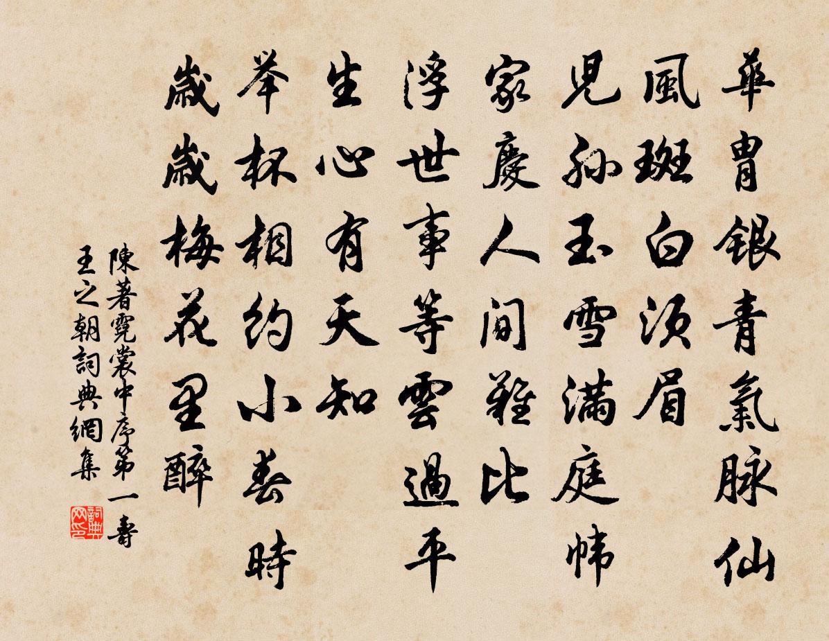 詩詞名句歷史字典書法欣賞書法字典國語詞典說文解字康熙字典古漢語字典標 題 作 者 詩 句 霓裳中序第一(壽王之朝)作者:陳著 朝代:宋代霓裳中序第一(壽王之朝)原文華胄銀青氣脈,仙風斑白鬚眉。兒孫玉雪滿庭幃。家慶人間難比。浮世事等雲過,平生心有天知。舉杯相約小春時。歲歲梅花里醉。詩詞問答問:霓裳中序第一(壽王之朝)的作者是誰?答:陳著問:霓裳中序第一(壽王之朝)寫於哪個朝代?答:宋代問:霓裳中序第一(壽王之朝)是什麼體裁?答:詞陳著霓裳中序第一(壽王之朝)書法欣賞霓裳中序第一(壽王之朝)書法作品詩詞推薦幽州歌汪元量〔宋代〕漢兒辮髮籠氈笠,日暮黃金台上立。臂鷹解帶忽放飛,一行塞雁南征急。寄若拙弟兼呈二十家叔陳與義〔宋代〕退之送窮窮不去,樂天待富富不來。政須青山映白髮,顧著皂蓋爭黃埃。何如父子共一壑,龐家活計良不惡。阿奴再和二首蘇軾〔宋代〕憶觀滄海過東萊,日照三山迤邐開。桂觀飛樓凌霧起,仙幢寶蓋拂天來。不聞宮漏催晨箭,但覺檐陰轉古槐。供奉題吳司理子隆兼隱陳造〔宋代〕紳笏視林藪,達人忘異同。端知柱下史,卻笑鹿門翁。犴獄仍陰德,詩書亦雋功。何須笠澤去,煙浪放船篷。宿陳處士書齋朱慶餘〔唐代〕結茅當此地,下馬見高情。菰葉寒塘晚,杉陰白石明。向爐新茗色,隔雪遠鐘聲。閒得相逢少,吟多寐不成。鶴謠八首白玉蟾〔宋代〕鶴者還丹之使兮洋洋,縞雲衣兮玄綺裳,唳以下兮郴陽。南嶽魏監廟曩自請奉祠恬於聲利十餘年來益閉牟巘五〔宋代〕全真閉戶魏不琢,二紀怡然外世榮。留得詩名皮陸集,到君句法有餘清。嚴泰伯出示誠齋五詩屬予繼聲奉呈一首李壁〔宋代〕為愛比鄰好,誅茅試結廬。地臨平楚回,堂枕一峰孤。乞予青霞佩,斟吾白玉腴。行行對金馬,謹莫戲侏儒。和皓文二絕林逋〔宋代〕芳草誰能夢謝池,但將心地喻摩尼。千岩萬壑時相憶,明月清風兩自知。冬至酬劉使君殷堯藩〔唐代〕異鄉冬至又今朝,回首家山入夢遙。漸喜一陽從地復,卻憐群沴逐冰消。梅含露蕊知迎臘,柳拂宮袍憶候朝。多少山中玩物雜言十首戴表元〔宋代〕圃人憂孽蟲,為蔬畜雞雛。小雞擇蟲啄,大雞遂啄蔬。蟲去蔬亦盡,對之可欷噓。昂昂高冠幘,反不小雞如。河池秋雨鄭剛中〔宋代〕一雨一涼秋氣味,添愁添病客情懷。故園十畝檀欒好,個裡歸心未得諧。鷓鴣天(詠梅菊呈撫州葛守)廖行之〔宋代〕九日東籬已泛觴。隴頭猶待返魂香。那知此日花神約,得得同登君子堂。迎臘雪,傲晴霜。西湖風韻接柴桑。壽潭歸舟三絕王柏〔宋代〕江邊踏月入孤舟,水月流光一片浮。夜靜海門雷怒吼,潮頭凍殺未甘休。城中有高樹劉黻〔宋代〕城中有高樹,與我相為鄰。薄味生古道,靜坐疏今人。淵明酷愛菊,張翰勤思蓴。蓴菊我何有,一杯天地春。萍鄉客舍戴復古〔宋代〕草罷惜春賦,持杯亦鮮歡。檐楹雙燕語,風雨百花殘。小閣無聊坐,征衣不耐寒。地爐燒石炭,強把故書看。石頭城楊備〔宋代〕五城樓雉各相望,山水英靈宅帝王。此地定由天造險,古來長侍作金湯。紹興祀神州地祗十六首佚名〔宋代〕穆穆令聞,溥溥有容。澤被萬宇,靡不率從。恭陳量幣,明芳其衷。禮亦宜之,享德攸同。用前五字韻趣劉聖與建第劉宰〔宋代〕君不見茅屋下,四壁床敷窄。又不見朱門中,金碧鎖空宅。宅成更欲致良材,水浮陸走空山澤。茅屋區區誠已疏,晚悟劉克莊〔宋代〕晚悟才為崇,深居學養生。乃知景升字,差勝少游兄。絕澗攜瓶汲,空山抱耒耕。兒孫聽苦語,世世勿談兵。名句推薦寂寂聞猿愁,行行見雲收李白《尋高鳳石門山中元丹丘》 衣祿原有定數,必節儉簡省,乃可久延。王永彬《圍爐夜話·第六三則》 今年元夜時,月與燈依舊。歐陽修《生查子·元夕》 愛親者,不敢惡於人;敬親者,不敢慢於人。孔子及其弟子《孝經·天子》 一道殘陽鋪水中,半江瑟瑟半江紅。白居易《暮江吟》 願天上人間,占得歡娛,年年今夜。柳永《二郎神·炎光謝》 瑤草一何碧,春入武陵溪。黃庭堅《水調歌頭·遊覽》 讀書如吃飯,善吃者長精神,不善吃者生痰瘤。袁枚《隨園詩話·卷十三》 冰肌玉骨,自清涼無汗。蘇軾《洞仙歌·冰肌玉骨》 冰骨清寒瘦一枝。玉人初上木蘭時。吳文英《浣溪沙·題李中齋舟中梅屏》