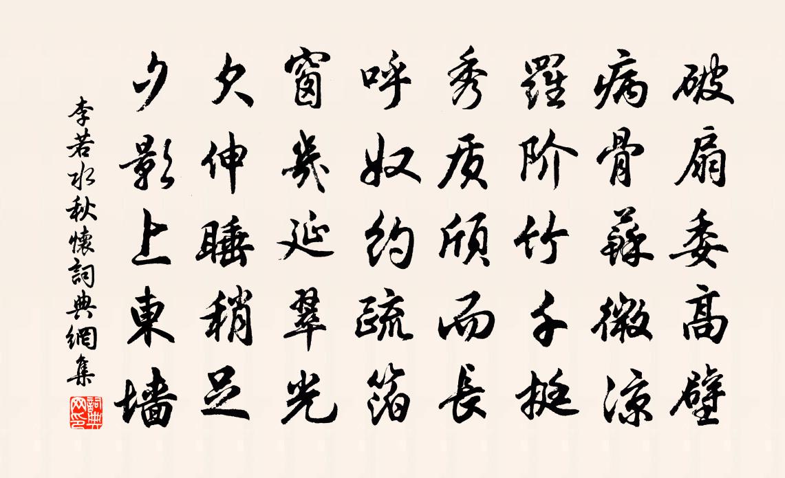 詩詞名句歷史字典書法欣賞書法字典國語詞典說文解字康熙字典古漢語字典標 題 作 者 詩 句 秋懷作者:李若水 朝代:宋代秋懷原文破扇委高壁,病骨蘇微涼。羅階竹千挺,秀質頎而長。呼奴約疏箔,窗幾延翠光。欠伸睡稍足,夕影上東牆。詩詞問答問:秋懷的作者是誰?答:李若水問:秋懷寫於哪個朝代?答:宋代李若水秋懷書法欣賞秋懷書法作品詩詞推薦繫舟餘杭門訪西湖金輪寺參上人王銍〔宋代〕北郭望西湖,微徑幾尋尺。澹與人意長,雲寒正無色。深尋幽禪居,步轉蒼山側。落葉不可紀,遮盡山下石。師方陳公哲梅花百詠戴表元〔宋代〕雪後西湖空碧波,酒徒消散也無多。白頭醒眼春風裹,奈此梅花百詠何。約山中友仇遠〔宋代〕望極秋空無片雲,前山歷歷見遙岑。新鴻漸到邊城靜,舊雨不來汀草深。仙李有時曾入夢,伯桃死後少知心。如君蜀中方乾〔唐代〕遊子去游多不歸,春風酒味勝餘時。閒來卻伴巴兒醉,豆蔻花邊唱竹枝。送從子淵宰浦江樓鑰〔宋代〕誰雲宦路足嶇嶔,送子之官獨放心。廉介有餘無矯亢,謙恭已甚自崇深。安輿何用資三釜,慶問時能抵萬金。公退悲歌五首方回〔宋代〕獨立蕭蕭落葉風,閒居已忍十年窮。幸猶張籍不終瞎,未必杜微真是聾。瑣事可容知較盡,塵編敢謂讀皆通。骨骸跋唐賢論史圖劉克莊〔宋代〕定是當時有難疑,一賢指畫眾肩隨。而今縱有人揮麈,問者為誰聽者誰。寄金山良書記章甫〔宋代〕浮玉山頭屋數椽,同龕彌勒憶當年。只今輸與良書記,睡起晴窗看釣船。賢者之孝二百四十首王陽林同〔宋代〕禮經稱孝子,不服闇登危。所以九折阪,回車不敢馳。近村陸游〔宋代〕去去柴車十里中,竹林密處路才通。漸聞水磑知村近,遙望禾囷喜歲豐。漁艇往來春浪碧,人家高下夕陽紅。百錢扇子詩李石〔宋代〕梅里尋酸卻得香,舌根未舉鼻先嘗。算來大似輸他眼,老去猶堪玩雪霜。漁村雜詩十首再和前韻薛嵎〔宋代〕暝色和煙四望迷,仰眠牛背覺天低。村翁遙指笙歌處,此地魚沉鳥不棲。夜自叔祖北園歸張鎡〔宋代〕夕靄生涼竹徑迂,快風吹馬出通衢。疎星落落邊城闕,擊鼓闐闐雜笑呼。竟日浪追河朔飲,幾時真在輞川圖。歸來聞鶯有懷故園賀鑄〔宋代〕海陵春後雨冥冥,耳厭蛙嗥鸛齡鳴。何意東亭好風日,流鶯忽作故園聲。故園千里長牽夢,老病三年不廢情。想見鄰圃求桂花並收墜英陳深〔宋代〕收拾殘英搗作湯,小山風味不能忘。敢煩即遺蒼頭去,掃取黃金一斛強。大酺·越調春雨周邦彥〔宋代〕對宿煙收,春禽靜,飛雨時鳴高屋。牆頭青玉旆,洗鉛霜都盡,嫩梢相觸。潤逼琴絲,寒侵枕障,蟲網吹黏簾竹。【南呂】一枝花_【南呂】一沈禧〔元代〕【南呂】一枝花廷儀公子實當代都督李公之家嗣也。器宇宏達,才華瞻敏,百氏之書,靡不該浹;至於龍韜虎略,寄李常伯滿粹翁王令〔宋代〕我思古人不可見,獨以兩眼紙上求。苦讀才疲即伏枕,亦冀夢寐從之游。每疑賢聖世間有,豈獨古出今則不。心之頌古一百則釋正覺〔宋代〕言衣半夜付盧能,攪攪黃梅七百僧。臨際一枝 * 眼,瞎驢滅卻得人憎。心心相印,祖祖傳燈。夷平海岳,變化鯤題政黃牛出山圖王灼〔宋代〕眼明雙白鷺,身隱一黃牛。玉轡章台陌,可憐供百憂。名句推薦二月巴陵日日風,春寒未了怯園公。陳與義《春寒》 昨夜東風入武陽,陌頭楊柳黃金色。李白《早春寄王漢陽》 聞之而不見,雖博必謬;見之而不知,雖識必妄;知之而不行,雖敦必困。荀子《荀子·儒效》 人之過誤宜恕,而在己則不可恕洪應明《菜根譚·概論》 糟糠不飽者不務粱肉,短褐不完者不待文繡。韓非及後人《韓非子·五蠹》 見人惡,即內省。有則改,無加警。李毓秀《弟子規·信》 雪裡溫柔,水邊明秀,不借春工力。辛棄疾《念奴嬌·梅》 青山朝別暮還見,嘶馬出門思舊鄉。李頎《送陳章甫》 寬而栗,柔而立,愿而恭,亂而敬,擾而毅,直而溫,簡而廉,剛而塞,強而義。佚名《尚書·虞書·皋陶謨》 風鳴兩岸葉,月照一孤舟。孟浩然《宿桐廬江寄廣陵舊遊》