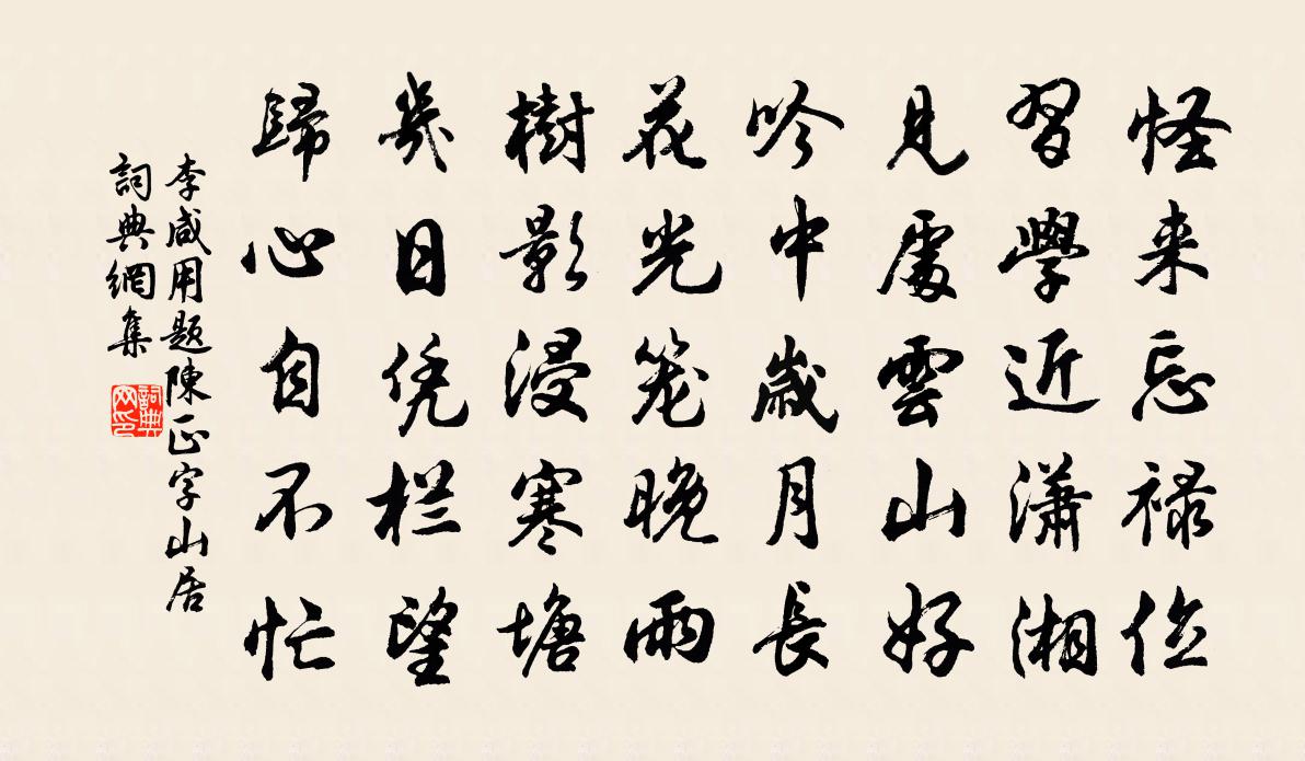 詩詞名句歷史字典書法欣賞書法字典國語詞典說文解字康熙字典古漢語字典標 題 作 者 詩 句 題陳正字山居作者:李鹹用 朝代:唐代題陳正字山居原文怪來忘祿位,習學近瀟湘。見處雲山好,吟中歲月長。花光籠晚雨,樹影浸寒塘。幾日憑欄望,歸心自不忙。詩詞問答問:題陳正字山居的作者是誰?答:李鹹用問:題陳正字山居寫於哪個朝代?答:唐代問:題陳正字山居是什麼體裁?答:五律李鹹用題陳正字山居書法欣賞題陳正字山居書法作品注釋全唐詩:卷645-26詩詞推薦聚景園王澡〔宋代〕光堯與壽星,昔得屢游幸。縟川騎服鮮,藻野宮妝靚。春池冰鑒開,笑對驚鴻影。不見兩河閒,父老久延頸。仰望櫻桃楊億〔宋代〕離宮時薦罷,樂府艷歌新。石髓凝秦洞,珠胎剖漢津。三桃聊並列,百果獨先春。清籞來君賜,雕盤助席珍。甘餘壽黎拙翁陳儀慶〔宋代〕名重河汾道更尊,只將拙日養吾存。南州佳士爭傾蓋,闕里諸生半在門。一笑何妨延賀客,六旬今已見曾孫。斯文游黃檗山江淹〔南北朝〕長望竟何極,閩雲連越邊。南州饒奇怪,赤縣多靈仙。金峰各虧日,銅石共臨天。陽岫照鸞采,陰溪噴龍泉。殘杌言志寄劉鈞秀才李中〔唐代〕童稚親儒墨,時平喜道存。酬身指書劍,賦命委乾坤。秋爽鼓琴興,月清搜句魂。與君同此志,終待至公論。五月二十四日過高郵三溝梅堯臣〔宋代〕甲申七月七,未明至三溝。先妻南陽君,奄仳向行舟。魂去寂無跡,追之固無由。此苦極天地,心瞀腸如抽。泣盡道中即事吳浚〔宋代〕林葉聲乾山影瘦,斬新霜氣欲無秋。菊花猶護西風局,自在籬根夢蓐收。九日進茱萸山詩五首張說〔唐代〕家居洛陽下,舉目見嵩山。刻作茱萸節,情生造化間。黃花宜泛酒,青岳好登高。稽首明廷內,心為天下勞。菊酒六月二十四日病起,喜雨聞鶯,與大兒議秋涼楊萬里〔宋代〕暑氣朝來掃地空,南風畢竟讓西風。秋生楚尾吳頭外,涼殺天涯地角中。萬疊山連千澗水,雙行纏伴一郫筒。初程西山晁公溯〔宋代〕萬州城西何所有,高山其下俯寒塘。浮鷗藉草溪沙暖,飛鳥沖花野樹香。他日擬從南嶽隱,平生尤愛北窗涼。道人已亥雜詩 13龔自珍〔清代〕出事公卿溯戊寅,雲煙萬態馬蹄湮。當年筮仕還嫌晚,已哭同朝三百人。八角井劉敞〔宋代〕誰鑒八角井,不方亦不圓。此地饒美水,此井獨苦泉。泉甘常早竭,泉苦晚永年。浪得世上名,對之還慨然。薌林五十詠過花橋楊萬里〔宋代〕北垞通南埭,前花映後花。雨多橋板斷,折碎兩涯霞。全州劉克莊〔宋代〕寂寞全州路,家家荻竹扉。異僧留塔在,過客入城稀。傳舍臨清泚,官亭占翠微。沙頭泊船者,多自嶺南歸。高馬小兒圖龔開〔宋代〕華驄料肥九分膘,童子身長五尺饒。青絲鞚短金勒緊,春風去去人馬驍。莫作尋常廝養看,沙陀義兒皆好漢。此兒京西即事韓琮〔唐代〕秋草河蘭起陣雲,涼州唯向管弦聞。豺狼毳幕三千帳,貔虎金戈十萬軍。候騎北來驚有說,戍樓西望悔為文。昭陽秋集罷還途中作,謹獻壽春公、黎公韋應物〔唐代〕束帶自衡門,奉命宰王畿。君侯枉高鑒,舉善掩瑕疵。斯民本已安,工拙兩無施。何以酬明德,歲晏不磷緇。時節西江月張孝祥〔宋代〕汗鑄九金神鼎,隋書小字蓮經。剛風劫火轉清冥。護守應煩仙聖。昨夢歸來帝所,今朝壽我親庭。只將此寶伴長生游浮玉三首蔡肇〔宋代〕曾訪山中支遁林,厭聞鐘鼓日欽欽。百川赴海通三島,萬籟逢秋共一音。折戟戰痕誰共吊,浮杯足跡杳難尋。魚峰浣溪沙(壬午九日)劉辰翁〔宋代〕身是去年人尚健,心知十日事如常。眼前杯酒是重陽。破帽簪萸攜素手,長歌藉草慰寒香。兒童怪我老來狂。名句推薦如來不應以具足諸相見。鳩摩羅什譯《金剛經·離色離相》 已訝衾枕冷,復見窗戶明。白居易《夜雪》 屋漏在上,知之在下。姚察、姚思廉《梁書·本紀·卷三》 名實相生,利用相成,是非相明,去就相安也。王通《中說·卷五·問易篇》 獨睡起來情悄悄,寄愁何處好。納蘭性德《謁金門·風絲裊》 燕子飛時,綠水人家繞。枝上柳綿吹又少。蘇軾《蝶戀花·春景》 中年親友難別,絲竹緩離愁。蘇軾《水調歌頭·安石在東海》 夜來小雨新霽,雙燕舞風斜。万俟詠《訴衷情·送春》 日暮平沙秋草亂,一雙白鳥避人飛。袁宏道《感事·湘山晴色遠微微》 攜手藕花湖上路。一霎黃梅細雨。朱淑真《清平樂·夏日游湖》