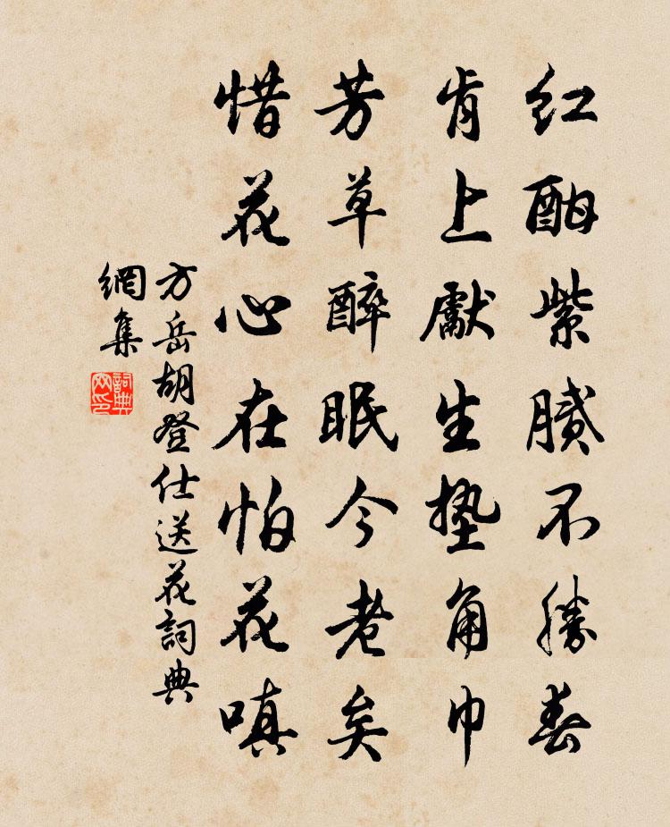 詩詞名句歷史字典書法欣賞書法字典國語詞典說文解字康熙字典古漢語字典標 題 作 者 詩 句 胡登仕送花作者:方岳 朝代:宋代胡登仕送花原文紅酣紫膩不勝春,肯上先生墊角巾。芳草醉眠今老矣,惜花心在怕花嗔。詩詞問答問:胡登仕送花的作者是誰?答:方岳問:胡登仕送花寫於哪個朝代?答:宋代方岳胡登仕送花書法欣賞胡登仕送花書法作品詩詞推薦贈興平鄭明府耿湋〔唐代〕海內兵猶在,關西賦未均。仍勞持斧使,尚宰茂陵人。遙夜重城掩,清宵片月新。綠琴聽古調,白屋被深仁。跡與山行衛宗武〔宋代〕晚芳開欲盡,落葉滿林楸。風色轉寒候,雨聲鳴暮秋。清游殊有礙,歸興浩難收。何日逢開霽,天還解客愁。句豐禪師〔宋代〕雪嶺梅花綻,雲洞老僧驚。自題新昌居止,因招楊郎中小飲白居易〔唐代〕地偏坊遠巷仍斜,最近東頭是白家。宿雨長齊鄰舍柳,晴光照出夾城花。春風小榼三升酒,寒食深爐一碗茶。能到雨夜陸游〔宋代〕麥熟家家喜墮涎,龜堂依舊突無煙。雨中更覺淒涼甚,一點殘燈守蠹編。幽居陸游〔宋代〕遶屋巉巉碧玉峰,箇中天遣養疏慵。捐書已嘆空虛腹,得酒還澆壘塊胸。曲幾坐看窺戶月,短蓬臥聽隔城鍾。柴桑河南白尹有喜崔賓客歸洛兼見懷長句,因而繼和劉禹錫〔唐代〕幾年侍從作名臣,卻向青雲索得身。朝士忽為方外士,主人仍是眼中人。雙鸞游處天京好,五馬行時海嶠春。遙羨二月晦日勸耕石城三首吳芾〔宋代〕兀坐無聊賴,所期懷抱開。偶驅千騎出,還得十朋來。遣興非無句,消愁亦有杯。此心終不樂,只是憶天台。釣台二首陳必敬〔宋代〕已上桐江台,又弄桐江釣。不食桐江魚,不怕嚴公笑。楚童謠先秦無名〔先秦〕楚王渡江得萍實。大如斗。赤如日。剖而食之甜如蜜。早春示陳元達一首王阮〔宋代〕北陸藏冰後,東風入律和。梅因三弄少,麥賴六花多。簪盍思喧馬,燈游羨鬧蛾。躬耕吾不倦,其奈沒田何。聞滁陽失守憶表兄周端臣〔宋代〕猶憶歸淮甸,何期陷敵塵。祗聞殘破慘,未得死生真。夢不諳長路,書難附便人。吞聲無限淚,一滴一傷神。淳熙八年端午帖子詞太上皇后合六首崔敦詩〔宋代〕翰墨消長日,尊罍占遠風。纖塵吹不到,人在玉壺中。戲答陳季常寄黃州山中連理松枝二首黃庭堅〔宋代〕老松連枝亦偶然,紅紫事退獨參天。金沙灘頭鎖子骨,不妨隨俗暫嬋娟。花舞史浩〔宋代〕是非場,名利海,得喪炎涼徒自苦。至樂陶陶,唯有醉鄉,誰向此間知趣。花下一杯一杯,且莫把、光陰虛度。八安宜園林獻高使君儲光羲〔唐代〕直道已三出,幸從江上回。新居茅茨迥,起見秋雲開。十里次舟楫,二橋交往來。楚言滿鄰里,雁叫喧池台。魚鱉王夫人輓詞李復〔宋代〕家聲昔冠秦中望,婦學今傳潁上風。百歲流光方過半,新春逝水忽馳東。丹山鳳泣歸巢冷,寒月烏啼反哺空。他日王岩幽隱居潘璵〔宋代〕一片清閒福,山間結小廬。此身為隱計,有地學農鋤。午飲煎溪茗,朝羹摘野蔬。無人知姓字,可以避徵書。范正獻書畢帖贊岳珂〔宋代〕士之以道義相從,豈計其功,而況乎公。當其任紬繹唐事之寄,所以極簡編之從容。亦既上成書於邇英,而公猶得七夕三首宋庠〔宋代〕紫宙風輕斂夕霏,露華應濕六銖衣。鵲橋貪問經年恨,不覺蛛絲減舊機。名句推薦西登香爐峰,南見瀑布水。李白《望廬山瀑布水二首》 寒泉貯、紺壺漸暖,年事對、青燈驚換了。吳文英《花犯·謝黃復庵除夜寄古梅枝》 相思休問定何如。情知春去後,管得落花無。晁沖之《臨江仙·憶昔西池池上飲》 相送情無限,沾襟比散絲韋應物《賦得暮雨送李胄/賦得暮雨送李曹》 鐵馬雲雕久絕塵,柳營高壓漢營春。溫庭筠《過五丈原 / 經五丈原》 忠恕違道不遠。施諸己而不願,亦勿施於人。子思《中庸·第十三章》 秋江帶雨,寒沙縈水,人瞰畫閣愁獨。史達祖《八歸·秋江帶雨》 雨聲颼颼催早寒,胡雁翅濕高飛難。杜甫《秋雨嘆三首》 竹影和詩瘦,梅花入夢香。王庭筠《絕句·竹影和詩瘦》 古宮閒地少,水港小橋多。杜荀鶴《送人游吳》