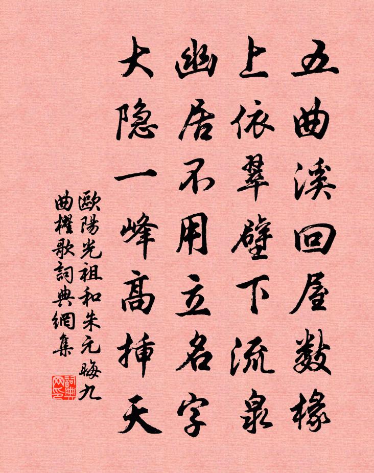 詩詞名句歷史字典書法欣賞書法字典國語詞典說文解字康熙字典古漢語字典標 題 作 者 詩 句 和朱元晦九曲櫂歌作者:歐陽光祖 朝代:宋代和朱元晦九曲櫂歌原文五曲溪回屋數椽,上依翠壁下流泉。幽居不用立名字,大隱一峰高插天。詩詞問答問:和朱元晦九曲櫂歌的作者是誰?答:歐陽光祖問:和朱元晦九曲櫂歌寫於哪個朝代?答:宋代歐陽光祖和朱元晦九曲櫂歌書法欣賞和朱元晦九曲櫂歌書法作品詩詞推薦梁明堂登歌 歌青帝辭沈約〔南北朝〕帝居在震。龍德司春。開元布澤。含和尚仁。羣居既散。歲雲陽止。飭農分地。民粒惟始。雕梁繡栱。丹楹玉墀。溪上小憩舒岳祥〔宋代〕鵲立碧峰遠,雞啼清晝寬。青苔留客醉,白髮借書看。方枕藤花軟,一瓶丹井寒。此時無二事,藜杖共盤桓。菩薩蠻高觀國〔宋代〕玉闌秋色知誰主。隔闌一架葡萄雨。綠蘚怕啼螿。可堪宮漏長。烏絲吟古怨。清淚消塵硯。夢冷不成雲。□峰峰外寄題朱元晦武夷精舍十二釣磯楊萬里〔宋代〕月夜乘醉來,垂竿曲溪曲。水清無寸鱗,釣得半輪王。頌十玄談祖意釋印肅〔宋代〕祖意如空不是空,鵬程九萬力唯風。若非風體空何用,體得無空道自通。野興釋行海〔宋代〕鷗入籬門沙岸高,秋來新壁換蘆條。半池煙荇浮黃萼,一架寒藤掛綠瓢。長相思(喜晴)劉辰翁〔宋代〕上元晴。上元晴。待得晴時坐觸屏。山禽三兩聲。欲歸城。未歸城。見說城中處處燈。明年處處行。送梵才大師歸天台張友道〔宋代〕久陪譯館清流集,吟苦霜添兩頷髭。厭駐王成思舊隱,年來卻赴白雲期。晨起苦寒張耒〔宋代〕夜霜漫屋風折竹,我乃與君在空谷。平生一衲度嚴寒,塊守深爐體生粟。大潘借馬貸監河,小潘無事仰屋歌。妻兒題畫蘭鄭燮〔清代〕身在千山頂上頭,突岩深縫妙香稠。非無腳下浮雲鬧,來不相知去不留。雲棲釋文珦〔宋代〕我頗愛雲散,雲不嫌我頑。兩心既莫逆,每事常相關。靜室雲守護,空門雲往還。雲棲良自嘉,雲與身俱閒。與耿天騭會話王安石〔宋代〕邯鄲四十餘年夢,相對黃粱欲熟時。萬事只如空鳥跡,怪君強記尚能追。凌歊台杜耒〔宋代〕幾年聽客話凌歊,不似台邊目力遙。千古江山猶昨日,六宮歌舞自前朝。苔碑有字多漫滅,野寺無僧轉寂寥。碧聚偈頌一百零二首釋紹曇〔宋代〕三十餘僧眼似眉,白雲深處聚頭嬉。燒枯柴火煨山芋,拽木羅籠總不知。景福東廂詩賜書司馬光〔宋代〕上聖固天縱,英藝皆絕倫。時乘萬幾閒,翰動如有神。用之當豫游,不忘安四民。匪頒及群下,絡繹來中宸。毰毸懷珦潛山釋行海〔宋代〕楚雨吳煙動客思,江梅發後失歸期。傳來蹤跡渾無定,飄泊情懷已可知。鼓角每驚多事日,鶯花空度少年時。與君丙午新正書懷十首范成大〔宋代〕殊方節物記吾曾,海北天西一瘦藤。烏欖雞檳嘗老酒,酥花芋葉試新燈。瘴雲度嶺濃如墨,邊雪窺窗冷欲冰。閒展和范景仁王景彝殿中雜題三十八首並次韻其十梅堯臣〔宋代〕時頒光祿酒,花出漢宮牆。湛露承天渥,流霞落羽觴。近親龍尾道,遠襲雀頭香。溺殿人誰見,終知曼倩狂。初發建安陸游〔宋代〕小雨初收雲未歸,吾行迨及晚秋時。寒沙新雁無人問,露井殘桐有客悲。征袂拂霜晨喚馬,驛窗剪燭夜題詩。悠然七夕宴懸圃二首李治〔唐代〕羽蓋飛天漢,鳳駕越層巒。俱嘆三秋阻,共敘一宵歡。璜虧夜月落,靨碎曉星殘。誰能重操杼,縴手濯清瀾。霓裳名句推薦凡戰,所謂攻者,知彼者也。佚名《百戰奇略·第四卷·攻戰》 元嘉草草,封狼居胥,贏得倉皇北顧。辛棄疾《永遇樂·京口北固亭懷古》 何期今日酒,忽對故園花。文森《九日》 以正治國,以奇用兵,以無事取天下。老子《老子·德經·第五十七章》 貞女貴徇夫,捨生亦如此。孟郊《列女操 / 烈女操》 銜霜當路發,映雪擬寒開。何遜《詠早梅 / 揚州法曹梅花盛開》 易挑錦婦機中字。難得玉人心下事。劉克莊《玉樓春·戲林推》 君人者釋其刑德而使臣用之,則君反制於臣矣。韓非及後人《韓非子·二柄》 傷高懷遠幾時窮。無物似情濃。張先《一叢花令·傷高懷遠幾時窮》 歲暮陰陽催短景,天涯霜雪霽寒宵。杜甫《閣夜》