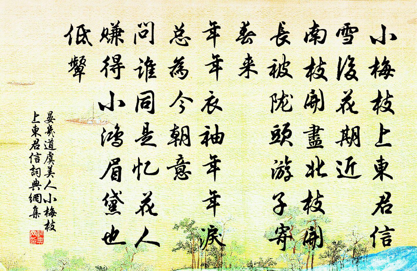 小梅枝上東君信。雪後花期近。南枝開盡北枝開。長被隴頭遊子、寄春來。