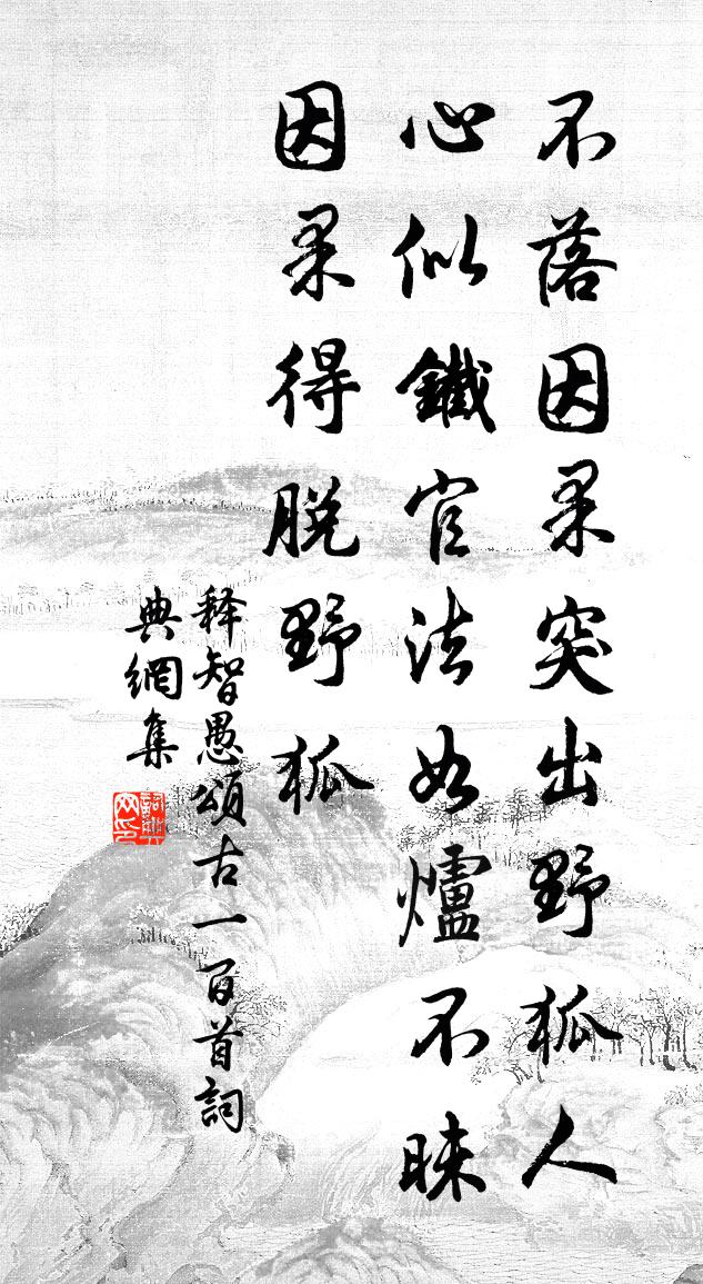 詩詞名句歷史字典書法欣賞書法字典國語詞典說文解字康熙字典古漢語字典標 題 作 者 詩 句 頌古一百首作者:釋智愚 朝代:宋代頌古一百首原文不落因果,突出野狐。人心似鐵,官法如爐。不昧因果,得脫野狐。詩詞問答問:頌古一百首的作者是誰?答:釋智愚問:頌古一百首寫於哪個朝代?答:宋代釋智愚頌古一百首書法欣賞頌古一百首書法作品詩詞推薦題殷舍人宅木芙蓉徐鉉〔唐代〕憐君庭下木芙蓉,裊裊纖枝淡淡紅。曉吐芳心零宿露,晚搖嬌影媚清風。似含情態愁秋雨,暗減馨香借菊叢。默飲舟過安仁五首楊萬里〔宋代〕一葉漁船兩小童,收篙停棹坐船中。怪生無雨都張傘,不是遮頭是使風。寄舍弟二首李新〔宋代〕冷漿庭巷四時秋,巧拙時情不解謀。遠客病容詩共瘦,故鄉野水淚通流。稍辜破鏡刀頭約,盡失蒼蠅驥尾游。他日賢者之孝二百四十首伏湛林同〔宋代〕向來父學顯,別自以家名。不是能傳業,如何著孝聲。晚意郭印〔宋代〕睡起書齋寂,疏簾獨上鉤。雨餘鴉噪晚,天闊雁橫秋。物色供吟賦,功名嘆滯留。兵戈今未息,回首不堪愁。滿庭芳 詠俞紹庵九芝堂沈禧〔元代〕節義名門,簪纓華胄,聖朝旌表昭彰。聲譽籍甚,青史注遺芳。積善偏鍾餘慶,天地報、芝產中堂。人希見,九莖踏莎行(蠟梅)毛滂〔宋代〕粟玉玲瓏,雍酥浮動。芳跗染得胭脂重。風前蘭麝作香寒,枝頭煙雪和春凍。蜂翅初開,蜜房香弄。佳人寒睡愁和張守唱和紅字韻詩八首劉子翬〔宋代〕午枕回清夢,疏林逗遠風。茶甌烹葉白,果飣剝方紅。小壘常稀訟,鄰邦近息戎。民謠知善政,佽助亦何功。王夷仲夫人輓詞樓鑰〔宋代〕彤史無人續,誰能識壺彜。苹蘩奉先祖,詩禮付佳兒。未見魚軒樂,俄興鸞鏡悲。藁砧方得路,腸斷悼亡詩。句李諮〔宋代〕空令抱恨歸黃壤,不見崇山謫去時。望永思陵陸游〔宋代〕旰食憂民宴樂疏,太倉幾有九年儲?賈生未解人間事,北闕猶陳痛哭書。題畫帳二首遠帆皇甫冉〔唐代〕朝見巴江客,暮見巴江客。雲帆儻暫停,中路陽台夕。瑪瑙坡楊蟠〔宋代〕石徑先光怪,傳流瑪瑙坡。天人曾布地,此物至今多。幽趣十二首鄭剛中〔宋代〕幽趣無人會,閒居我自知。筍尖穿落葉,花蕊掛遊絲。寒在蜂來少,風斜燕不遲。老夫無定力,破戒為題詩。早秋遊靈岩聞人滋〔宋代〕憑欄山翠濕蒙蒙,佛閣依然水殿風。欲採蓮花何處所,年年金井落梧桐。抵楚門李仕興〔元代〕楚門山色散煙霞,人到江南識永加。半壟石田多種麥,一冬園樹尚開花。海天日暖魚堪釣,潮浦船回酒可賒。傍水偈十三首釋法泰〔宋代〕一雁度長空,影落寒江水。水無沉影心,雁無遺蹤意。蹤影兩相忘,憑何為的旨。籬邊金菊黃,江上芙蓉翠。寄進士崔魯范鄭準〔唐代〕洛陽才子舊交知,別後干戈積詠思。百戰市朝千里夢,三年風月幾篇詩。山高雁斷音書絕,谷背鶯寒變化遲。會待夜深吟王令〔宋代〕叩幾悲砍涕滿襟,聖賢千古我如今。凍琴弦斷燈青暈,誰會男兒半夜心。吊屈原文柳宗元〔唐代〕 後先生蓋千祀兮,余再逐而浮湘。求先生之汨羅兮,攬蘅若以薦芳。願荒忽之顧懷兮,冀陳辭而有光。 先名句推薦反者道之動;弱者道之用。老子《老子·德經·第四十章》 荊山長號泣血人,忠臣死為刖足鬼李白《鞠歌行》 人之聰明,多失於浮炫脫脫《金史·列傳·卷三十三》 夫情動而言形,理髮而文見劉勰《文心雕龍·體性》 當年不肯嫁春風,無端卻被秋風誤。賀鑄《芳心苦·楊柳回塘》 先生名利比塵灰,綠竹青鬆手自栽。王汝舟《詠歸堂隱鱗洞》 柳重煙深,雪絮飛來往。歐陽修《蝶戀花·面旋落花風蕩漾》 爭奈愁來,一日卻為長賀鑄《行路難·縛虎手》 雲淡風輕近午天,傍花隨柳過前川。程顥《春日偶成·雲淡風輕近午天》 亦余心之所善兮,雖九死其猶未悔。屈原《離騷》