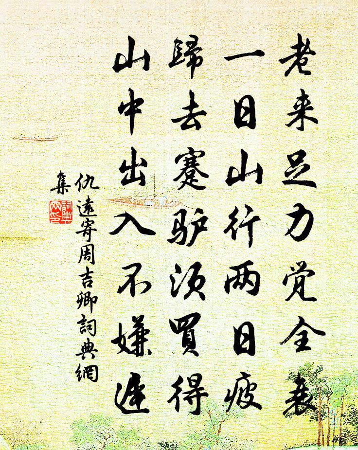 詩詞名句歷史字典書法欣賞書法字典國語詞典說文解字康熙字典古漢語字典標 題 作 者 詩 句 寄周吉卿作者:仇遠 朝代:宋代寄周吉卿原文老來足力覺全衰,一日山行兩日疲。歸去蹇驢須買得,山中出入不嫌遲。詩詞問答問:寄周吉卿的作者是誰?答:仇遠問:寄周吉卿寫於哪個朝代?答:宋代仇遠寄周吉卿書法欣賞寄周吉卿書法作品詩詞推薦題韓仲止壁二首余儔〔宋代〕謁入久不出,兀坐如枯荄。蒼頭前致詞,問我何因來。士節久凋喪,人情易嫌猜。本無性命憂,不去安待哉。導引佚名〔宋代〕輕輿小輦,曾宴玉欄秋。慶賞殿宸游。傷心處,獸香散盡,一夜入丹邱。翠簾人靜月光浮。但半卷銀鉤。誰知道,次和答張誾寄靈壽杖李廌〔宋代〕我生職貧病,壯齡俄早衰。朱顏不少貸,白髮太先期。故人獨閔余,遠寄靈壽枝。老景知有賴,醒醉為扶持。頌古二十九首釋師體〔宋代〕若瓠連根苦,同坑無異土。二千年已前,一火破落戶。清醒薛嵎〔宋代〕獨懷忠憤赴湘中,舉國昏昏志不同。漁父笑君君亦笑,煙波相望各西東。長春花鄭剛中〔宋代〕小蕊頻頻包碎綺,嫩紅日日醉朝霞。氣溫已是如三月,更向亭前堆落花。題天王院內鑒堂舒坦〔宋代〕等是人間出世人,數他珍寶信非珍。茫茫白日誰回首,此處元無一點塵。代壽韓平原劉過〔宋代〕國付平章眾正開,凌煙錄盡到雲台。鴛鴻充序皆桃李,羔雁成群及草萊。強國斷無逾此策,隨車未必盡直材。更須湓城客思方回〔宋代〕客懷歷落事多違,嘆息流光似箭飛。雪後蔞蒿初薦酒,花前蛺蝶欲穿衣。熟知江水磨今古,難向春風問是非。悵望挽胡澹庵二首趙蕃〔宋代〕憶昔樂全公,暮為老蘇長。載其辨奸論,此老一生了。澹庵夫何如,書有斬檜草。顧豈無他歟,言大可略小。次韻溧水令李彥平清賞圖周必大〔宋代〕俗吏才拘拘,書生志落落。均之窘几案,底處著丘壑。中山李長官,整暇非政學。庭虛吏早散,園古句頻琢。問之北望王安石〔宋代〕欲望淮南更白頭,杖藜蕭颯倚滄洲。可憐新月為誰好,無數晚山相對愁。聞八弟朝議二十一弟朝奉二十弟迪功與安郎倉晁說之〔宋代〕葆真宮是何年有,遊子相將便得真。聞道流霞醒不醉,只應人世恨還新。東坡引辛棄疾〔宋代〕君如樑上燕。妾如手中扇。團團青影雙雙伴。秋來腸欲斷。黃昏淚眼。秋來腸欲斷。青山隔岸。但咫尺、如天遠。朝中措沈端節〔宋代〕天遙野闊雁書空。山遠暮雲中。目斷江南煙雨,□□敧枕春風。功名富貴,何須計較,煙際疏鍾。解道淺妝濃抹,三月晦日送春宋祁〔宋代〕倏忽韶光第九旬,無花何處覓殘春。長繩萬尺非難具,誰與天邊絆日輪。驀山溪石孝友〔宋代〕小花靜院。有個人人現。縹緲更娉婷,算不數、歌朋舞伴。鳴珂曲里,常記偶相逢,無語恨,有情愁,綠嫩紅妝淺春夜雪再用韻十首楊公遠〔宋代〕東風怒撼樹梢鳴,凍住頑雲黯不明。兀坐爐邊閒側耳,春蟲撩亂撲窗聲。癸未二月廿五日訪周道人西庵戲題陳文蔚〔宋代〕道人邀我飯胡麻,半日清閒得遠家。多少欲來無路問,空於洞口覓桃花。宮詞一百首岳珂〔宋代〕萬里燕雲慮正深,赭袍衿甲被黃金。思文聖主師文母,歸徠州下拆泥封。名句推薦成人不自在,自在不成人。曹雪芹《紅樓夢·第八十二回》 江流石不轉,遺恨失吞吳。杜甫《八陣圖》 明月出天山,蒼茫雲海間。李白《關山月》 放眼暮江千頃,中有離愁萬斛,無處落征鴻。楊炎正《水調歌頭·把酒對斜日》 雪裡溫柔,水邊明秀,不借春工力。辛棄疾《念奴嬌·梅》 一葉葉,一聲聲,空階滴到明。溫庭筠《更漏子·玉爐香》 大哉,時之相生也!達者可與幾矣。王通《中說·卷五·問易篇》 賞心樂事共誰論?花下銷魂,月下銷魂。唐寅《一剪梅·雨打梨花深閉門》 雲霞出海曙,梅柳渡江春。杜審言《和晉陵陸丞早春遊望》 誤落塵網中,一去三十年。陶淵明《歸園田居·其一》