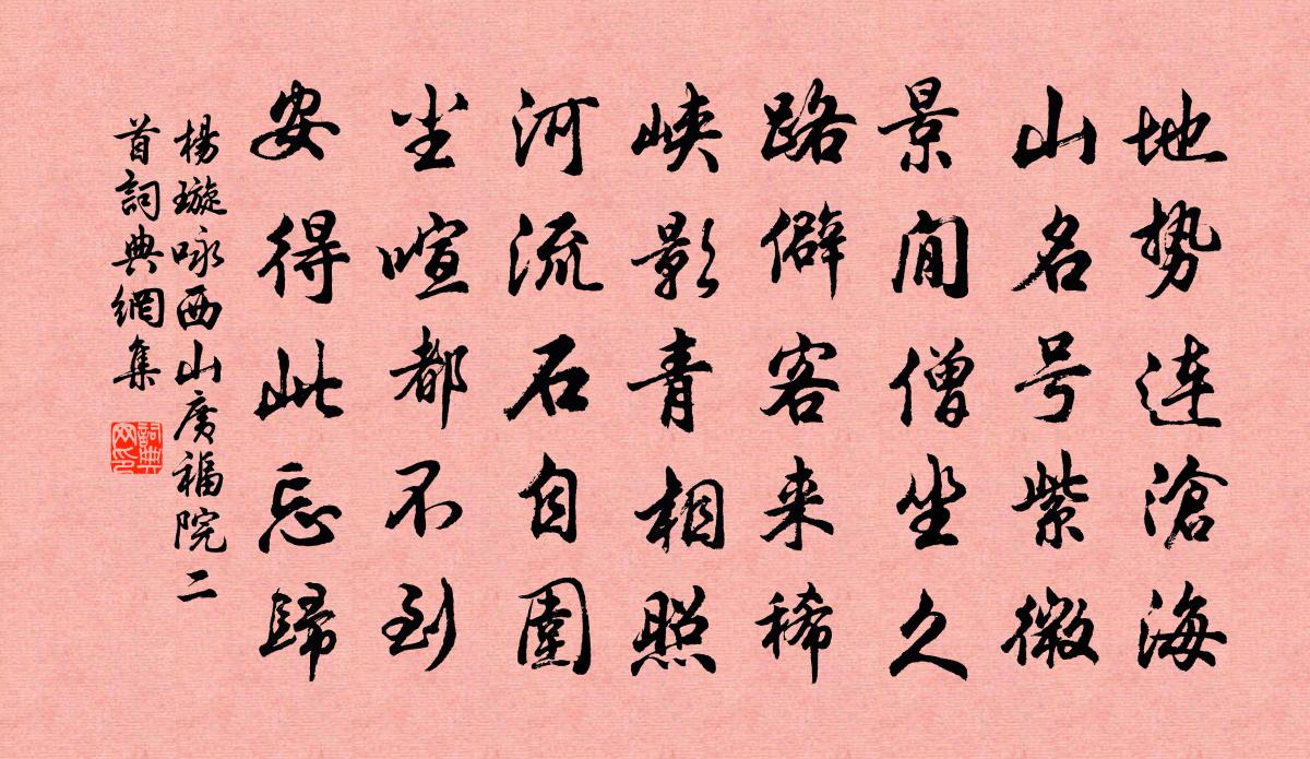 詩詞名句歷史字典書法欣賞書法字典國語詞典說文解字康熙字典古漢語字典標 題 作 者 詩 句 詠西山廣福院二首作者:楊璇 朝代:宋代詠西山廣福院二首原文地勢連滄海,山名號紫微。景閒僧坐久,路僻客來稀。峽影青相照,河流石自圍。塵喧都不到,安得此忘歸。詩詞問答問:詠西山廣福院二首的作者是誰?答:楊璇問:詠西山廣福院二首寫於哪個朝代?答:宋代楊璇詠西山廣福院二首書法欣賞詠西山廣福院二首書法作品詩詞推薦君貴用前韻來謝又次韻答之陳著〔宋代〕青鞋踏過剡山長, * 初香替紫陽。情話綢繆無世變,意吟瀟灑似秋光。別來杏苑驚三載,問及花崖夢一場。我亦齋中雜題陸游〔宋代〕湖水日益長,柳色日益深。好鳥西山來,飛鳴過前林。年華挽不留,陳跡曠難尋。花開少共賞,酒熟惟孤斟。王謝朝來曲王昌齡〔唐代〕日昃鳴珂動,花連繡戶春。盤龍玉台鏡,唯待畫眉人。次韻梁廣文重午弔古陳造〔宋代〕菰粽蘸蜜彩作絲,竹萌尚籜榴未子。官居端午不可孤,小卻文移謝胥史。酒社切戒屐聲疎,詩郵莫漫奚奴寄。與君河傳 戲效花間體邵亨貞〔元代〕庭院。春淺。重門深掩。寂寞東風。睡濃。起來繡*花影重。嬌慵。宿妝凝澹紅。待把眉山臨鏡畫。還又罷。卻放泛舟一首王阮〔宋代〕霅川荷葉浦,彭蠡石榴頭。此地皆奇絕,平生所爛游。從來貪水園,老去只漁舟。理角乘桴便,何人從我浮。買太湖石姚合〔唐代〕我嘗游太湖,愛石青嵯峨。波瀾取不得,自後長咨嗟。奇哉賣石翁,不傍豪貴家。負石聽苦吟,雖貧亦來過。貴我醉題埭西酒家陸游〔宋代〕陣陣新寒入布裘,偶乘小醉得閒遊。丹楓落日野橋晚,斷雁濕雲江路秋。馬得一鳴何恨斥,金經百鏈豈容柔?不知郊廟歌辭。梁太廟樂舞辭。昭德舞佚名〔唐代〕肅肅文考,源浚派長。漢稱誕季,周實生昌。奄有四海,超彼百王。笙鏞迭奏,禮物熒煌。長相思蘇頲〔唐代〕君不見天津橋下東流水,南望龍門北朝市。楊柳青青宛地垂,桃紅李白花參差。花參差,柳堪結,此時憶君心斷絕秋興陸游〔宋代〕白頭韭美醃虀熟,赬尾魚鮮斫鱠成。卻對盤餮三太息,老年一飽費經營。送何主簿歸豐城楊萬里〔宋代〕眾里非無士,難中卻幾人。如何新帥澤,偏作此邦春?未要棲鸞恨,方看報主身。青燈一樽酒,聊復話酸辛。酬李公寅留別李復〔宋代〕歸風何急動徵車,幾夕相逢意有餘。綠暗河橋冰泮後,雲藏山徑雪晴初。登門曾上千重峻,遊刃將驚萬窾虛。他日贈周秀才二首陳師道〔宋代〕早逢異人得異術,究考咎休出頃刻。相逢拍手問由來,怪我今年有陰德。木蘭花慢 贈貴游摘阮,時得名妾,故戲及之劉敏中〔元代〕此聲何所似,似琴語、更琅然。問太古遺音,承平舊曲,誰為君傳。知音素蛾好在,只向人懷抱照人圓。一笑青雲漁父詞一十八首沐浴呂岩〔唐代〕卯酉門中作用時,赤龍時蘸玉清池。雲薄薄,雨微微,看取妖容露雪肌。洛陽懷古楊果〔元代〕洛陽雲樹郁崔嵬,落日行人首重回。山勢忽從平野斷,河聲偏傍故宮哀。《五噫》擬逐梁鴻去,六印休驚季子來。臨江仙(同日李提刑炁亦有詞因次韻)魏了翁〔宋代〕腳踏西郊紅世界,才知春意分明。不須更說錦官城。春來遊冶騎,得得為渠停。停到花眠人且去,酒杯苦欲留行。葛仙行祠鄭玠〔宋代〕身為俗吏趨行部,手藝名香祝有年。五色雀飛慶薦祉,七星松古自通仙。磬湖趙蕃〔宋代〕鑿開何自來,名得因形似。似欲使先生,因茲號居士。名句推薦自是人生長恨水長東。李煜《相見歡·林花謝了春紅》 見梨花初帶夜月,海棠半含朝雨。万俟詠《三台·清明應制》 還與去年人,共藉西湖草。蘇軾《卜運算元·感舊》 偶然值林叟,談笑無還期。王維《終南別業 / 初至山中 / 入山寄城中故人》 心事孤山春夢在,到思量、猶斷詩魂吳文英《極相思·題陳藏一水月梅扇》 賊是小人,智過君子。佚名《增廣賢文·上集》 歲夜高堂列明燭,美酒一杯聲一曲。李頎《聽安萬善吹觱篥歌》 水村山館,夜闌無寐,聽盡空階雨。黃大臨《青玉案·和賀方回韻送伯固還吳中》 春衫著破誰針線,點點行行淚痕滿。黃公紹《青玉案·年年社日停針線》 李白如今已仙去,月在青天幾圓缺?唐寅《把酒對月歌》