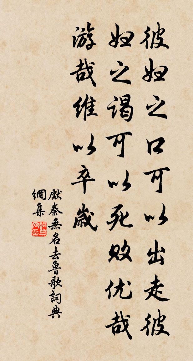 詩詞名句歷史字典書法欣賞書法字典國語詞典說文解字康熙字典古漢語字典標 題 作 者 詩 句 去魯歌作者:先秦無名 朝代:先秦去魯歌原文彼婦之口。可以出走。彼婦之謁。可以死敗。優哉游哉。維以卒歲。詩詞問答問:去魯歌的作者是誰?答:先秦無名問:去魯歌寫於哪個朝代?答:先秦問:去魯歌是什麼體裁?答:樂府先秦無名去魯歌書法欣賞去魯歌書法作品詩詞推薦醴陵客店劉克莊〔宋代〕縣郭依稀隔渡頭,解鞍來倚店家樓。已攀桂樹吟招隱,因看梅花賦遠遊。市上俚音多楚語,橋邊碧色是湘流。直南【中呂】朱履曲_休只愛夸強張養浩〔元代〕休只愛誇強說會,少不得直做的貼骨粘皮,一旦待相離怎相離。愛他的著他的,得便宜是落便宜,休著這眼皮兒謾秋夜聞笛薩都剌〔元代〕何人吹笛秋風外,北固山前月色寒。亦有江南未歸客,徘徊終夜倚闌乾。自笑仇遠〔宋代〕謁客登門不敢嗔,強顏應按暫時親。一官本自如冰冷,更有依冰借暖人。廣陵答崔琛趙嘏〔唐代〕棹倚隋家舊院牆,柳金梅雪撲檐香。朱樓映日重重晚,碧水含光灩灩長。八斗已聞傳姓字,一枝何足計行藏。聲名續八詠萬象出新奇唐仲友〔宋代〕經營得要領,呈露入軒闥。迢迢括蒼山,虬龍南北環。中含七邑壤, * 溪流灣。昔樓已據勝,今樓與名稱。東西和題藤架獨孤及〔唐代〕尊尊葉成幄,璀璀花落架。花前離心苦,愁至無日夜。人去藤花千里強,藤花無主為誰芳。相思歷亂何由盡,春日拋球樂馮延巳〔唐代〕年少王孫有俊才,登高歡醉夜忘回。歌闌賞盡珊瑚樹,情厚重斟琥珀杯。但願千千歲,金菊年年秋解開。桃源憶故人黃庭堅〔宋代〕碧天露洗春容淨。淡月曉收殘暈。花上密煙飄盡。花底鶯聲嫩。雲歸楚峽厭厭困。兩點遙山新恨。和淚暗彈紅粉。西江月高道寬〔元代〕混沌屯蒙如卵,昏昏默默盈空。浩然太素抱鴻蒙。一氣循環凝重。內隱真水真火,氤氳盤結如冰。中心元始造玄功送謝夷甫宰餘姚縣(餘姚,一作鄮縣)戴叔倫〔唐代〕君去方為宰,干戈尚未銷。邑中殘老小,亂後少官僚。廨宇經兵火,公田沒海潮。到時應變俗,新政滿餘姚。十一月十六日入館孔武仲〔宋代〕一雪初乾曉日紅,行人爭道已憧憧。泥縈馬足行初躓,寒犯貂裘力正濃。地逼新陽雖喜氣,雲垂滄海更愁容。便應白鹿洞二首·其一王貞白〔唐代〕讀書不覺已春深,一寸光陰一寸金。(已春深 一作:春已深)不是道人來引笑,周情孔思正追尋。酬鄭判官湖上見贈皎然〔唐代〕歲歲湖南隱已成,如何星使忽知名。沙鷗慣識無心客,今日逢君不解驚。聞新蟬寄桂雍貫休〔唐代〕新蟬終夜叫,嘒嘒隔溪濆。杜宇仍相雜,故人聞不聞?冬至贈潘郎張耒〔宋代〕曉鏡星星華發新,江山流落未歸人。五紋暗度人間線,九寸潛通地下春。歌笑欣欣環老稚,杯盤草草稱清貧。與君雜劇·王月英元夜留鞋記佚名〔元代〕楔子(老旦、卜兒、同正旦王月英領梅香上,詩云),生男勿喜女勿悲,曾聞有女作門楣。世人誰解求凰曲,拈得菖蒲陸游〔宋代〕雁山菖蒲崑山石,陳叟持來慰幽寂。寸根蹙密九節瘦,一拳突兀千金直。清泉碧缶相發揮,高僧野人動顏色。盆山蓮竹鶴姚勉〔宋代〕蓮為君子花,竹有君子操。深衣古君子,清以仙自號。徘徊蓮竹間,似覺皆所好。水邊立良久,林外復高蹈。翩然秋夜感遇十首以孤村一犬吠殘月幾人行為韻陸游〔宋代〕昔遇高皇帝,同朝多偉人。哀哉逝不留,焄蒿返蒼旻。存者才一二,相望不得親。秋風聞雁過,老淚沾衣巾。名句推薦死生驚懼不入乎其胸,是故忤物而不懾。列子及其弟子《列子·黃帝》 憶君心似西江水,日夜東流無歇時。魚玄機《江陵愁望寄子安》 強欲登高去,無人送酒來。岑參《行軍九日思長安故園》 杖劍對尊酒,恥為遊子顏。陸龜蒙《別離》 西湖舊日,留連清夜,愛酒幾將花誤。吳文英《永遇樂·探梅次時齋韻》 有孫母未去,出入無完裙。杜甫《石壕吏》 待羔兒、酒罷又烹茶,揚州鶴。辛棄疾《滿江紅·和范先之雪》 製法而自犯之,何以帥下?陳壽《三國志·魏書·武帝紀》 故人入我夢,明我長相憶。杜甫《夢李白二首·其一》 長風萬里送秋雁,對此可以酣高樓。李白《宣州謝朓樓餞別校書叔雲 / 陪侍御叔華登樓歌》