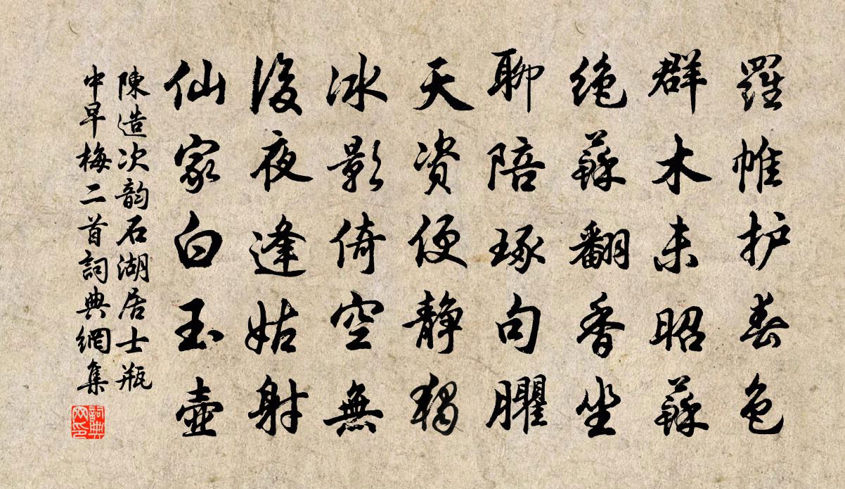 詩詞名句歷史字典書法欣賞書法字典國語詞典說文解字康熙字典古漢語字典標 題 作 者 詩 句 次韻石湖居士瓶中早梅二首作者:陳造 朝代:宋代次韻石湖居士瓶中早梅二首原文羅帷護春色,群木未昭蘇。絕蘇翻香坐,聊陪琢句臞。天資便靜獨,冰影倚空無。後夜逢姑射,仙家白玉壺。詩詞問答問:次韻石湖居士瓶中早梅二首的作者是誰?答:陳造問:次韻石湖居士瓶中早梅二首寫於哪個朝代?答:宋代陳造次韻石湖居士瓶中早梅二首書法欣賞次韻石湖居士瓶中早梅二首書法作品詩詞推薦道次靈井梅堯臣〔宋代〕井面水不動,傍分龍鱗激。泉氣時生漚,上涌光的皪。深苔翠堪染,石底清可覿。旱歲或來祠,彈弦屬靈覡。西江月周紫芝〔宋代〕發白猶欹旅枕,溪深未掛煙莎。往來苕霅意如何。應有輕鷗笑我。細算年來活計,只消一個漁舟。金魚無分不須求惜分飛(別吳作)晁補之〔宋代〕山水光中清無暑。是我消魂別處。只有多情雨。會人深意留人住。不見梅花來已暮。未見荷花又去。圖畫他年覰。放翁自贊陸游〔宋代〕進無以顯於時,退不能隱於酒。事刀筆不如小吏,把鋤犁不如健婦。或問陳子何取而肖其像,曰是翁也。腹容王導綠頭鴨 大圓覺海王吉昌〔元代〕混融成。大圓覺海崢嶸。性珠顯、恢弘祖意,慧風通、虛谷傳神。有中無、無中有有,應變處、廓爾縱橫。坦蕩融謝崔象之示詩稿黃庶〔宋代〕古樂治情性,故使風俗完。鄭衛入人耳,雅正聲日殫。教化走薄惡,靡靡如轉丸。全音不可見,來往寂寞間。我疑鈴齋馮時行〔宋代〕亂離固多事,賢哲有要領。一切本仁義,條教日月炳。邦民用不犯,閉閣自非省。猶能肖蓋公,使我醉清淨。春風得揚州書宋祁〔宋代〕四郡連翩擁使旗,多年不聽汝南雞。宴開河朔千人帳,書用黎陽一補泥。水曲箭波喧夜櫓,原田絲雨勸春{黎人水次韻師皋鄧肅〔宋代〕平生論兵輕白起,端欲採芝追甪里。誰遣聲名到人間,役役十年空血指。天狗墮地嗟未已,雷聲屢迫君王耳。閩山柳崔櫓〔唐代〕風慢日遲遲,拖煙拂水時。惹將千萬恨,系在短長枝。骨軟張郎瘦,腰輕楚女飢。故園歸未得,多少斷腸思。漫尉黃庭堅〔宋代〕豫章黃魯直,既拙又狂痴。往在江湖南,漁樵乃其師。腰斧入白雲,揮車棹清溪。虎豹不亂行,鷗鳥相與嬉。遇人【中呂】紅繡鞋_竹衫兒並刀喬吉〔元代〕竹衫兒並刀剪龍鬚為寸,玉絲穿龜背成文,襟袖清涼不沾塵。汗香晴帶雨,肩瘦冷搜雲,是玲瓏剔透人。浹背全無別謝師宰王安石〔宋代〕閶闔城西地如水,雞鳴黃塵波浪起。窮年一馬望扶桑,東得省門身輒止。簿書期會老紛紛,邂逅論心喜有君。數日雉朝飛霍總〔唐代〕五色有名翬,清晨挾兩雌。群群飛自樂,步步飲相隨。覘葉逢人處,驚媒妒寵時。綠毛春斗盡,強敵願君知。大滌洞天留題邵哲〔宋代〕抖擻京塵只素衣,脫銜困馬喜逶迤。雲根來擬啟金室,天柱高攀得玉芝。龍躍清泉知客定,丹藏紺箬與誰期。晴霞雙廟張耒〔宋代〕成敗功名付偶然,男兒要是死生間。故應城破知肝膽,飛矢何勞記賀蘭。夕發邠寧寄從弟(一作寄舒從事)馬戴〔唐代〕半酣走馬別,別後鎖邊城。日落月未上,鳥栖人獨行。方馳故國戀,復愴長年情。入夜不能息,何當閒此生。遺興王洋〔宋代〕老如認老應無病,貧要安貧可免憂。貧病欺人須服弱,嗔拳笑面卻應休。海棠方岳〔宋代〕黃州不識春風面,噲伍漫山桃李枝。銀燭夜深妝額褪,錦屏睡足鬢絲垂。半醒半醉凌晨酒,幾雨幾晴寒食時。莫怨送江州孫膳部歸闕兼寄承旨侍郎王禹偁〔宋代〕九江為郡鬢成霜,淮海相逢共黯傷。放逐翰林同李白,蹉跎郎署是馮唐。才名各負詩千首,離別無辭酒一觴。歸見名句推薦子用私道者家必亂,臣用私義者國必危。劉向《戰國策·趙二·趙燕後胡服》 宮衣亦有名,端午被恩榮。杜甫《端午日賜衣》 滿目飛花萬點,回首故人千里,把酒沃愁腸。葛長庚《水調歌頭·江上春山遠》 別日南鴻才北去,今朝北雁又南飛。魚玄機《閨怨》 上有青冥之長天,下有淥水之波瀾李白《長相思·其一》 鴛鴦密語同傾蓋,且莫與、浣紗人說。張炎《疏影·詠荷葉》 何時詔此金錢會,暫醉佳人錦瑟旁。杜甫《曲江對雨》 甘居人下者鮮。御之失謀,非犯,則篡耳。來俊臣《羅織經·治下卷第三》 年年戰骨埋荒外,空見蒲桃入漢家。李頎《古從軍行》 城隅南對望陵台,漳水東流不復回。岑參《登古鄴城》