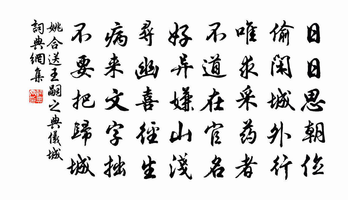 詩詞名句歷史字典書法欣賞書法字典國語詞典說文解字康熙字典古漢語字典標 題 作 者 詩 句 送王嗣之典儀城作者:姚合 朝代:唐代送王嗣之典儀城原文日日思朝位,偷閒城外行。唯求採藥者,不道在官名。好異嫌山淺,尋幽喜徑生。病來文字拙,不要把歸城。詩詞問答問:送王嗣之典儀城的作者是誰?答:姚合問:送王嗣之典儀城寫於哪個朝代?答:唐代問:送王嗣之典儀城是什麼體裁?答:五律姚合送王嗣之典儀城書法欣賞送王嗣之典儀城書法作品注釋全唐詩:卷496-90詩詞推薦雜興宋祁〔宋代〕殘暑辭遙夕,初涼澹蕭辰。燕索西飛伴,雁作南來賓。霽巒靜矗矗,遠水清鱗鱗。由來搖落恨,先付長年人。浯溪鄭谷〔唐代〕湛湛清江疊疊山,白雲白鳥在其間。漁翁醉睡又醒睡,誰道皇天最惜閒。送崔拾遺赴闕朱慶餘〔唐代〕清貌凌寒玉,朝來拜拾遺。行承天子詔,去感主人知。劍佩分班日,風霜獨立時。名高住不得,非與九霄期。宿翠山鄭清之〔宋代〕箯輿十里見青嶄,行盡松陰得翠岩。萬壑聲中清磬出,一峰高處白雲緘。茶新煮鼎作魚沫,僧有可人能塵談。自覺感皇恩王惲〔元代〕日日午餐余,即須幽討。拄杖長行覓周老。三杯兩*,不致玉山傾倒。與君何處去、乾*好。松影閒庭,長吟藉草酬喬世材推官李復〔宋代〕地僻人來少,公庭吏散時。亂蟬號晚日,涼葉下高枝。仰羨知歸鳥,先書寄遠詩。只應今夜月,偏解照相思。蜀僧明操思歸龍丘子書壁蘇軾〔宋代〕更厭勞生能幾日,莫將歸思擾衰年。片雲會得無心否,南北東西只一天。冬日梅溪送裴方舟宣州皎然〔唐代〕平明匹馬上村橋,花發梅溪雪未消。日短天寒愁送客,楚山無限路遙遙。啜茶示兒輩陸游〔宋代〕圍坐團欒且勿嘩,飯余共舉此甌茶。麤知道義死無憾,已迫耄期生有涯。小圃花光還滿眼,高城漏鼓不停撾。閒人東山精舍李壁〔宋代〕木落天清遠嶺多,水平煙盡鏡新磨。周公謝傅皆塵土,病鶴閒來借一柯。至豫章茂直座上戲書鄭剛中〔宋代〕憶與故人分此袂,倒指數年今不啻。天涯何意得相逢,一笑向君聊破涕。靜垂雙耳聽韶頀,濯洗凡襟無鄭衛。頻將滿江紅·燕子樓中文天祥〔宋代〕和王夫人《滿江紅》韻,以庶幾後山《妾薄命》之意。燕子樓中,又捱過、幾番秋色。相思處、青年如夢,乘鸞仙眾妙堂(廣州何道士)蘇軾〔宋代〕湛然無觀古真人,我獨觀此眾妙門。夫物芸芸各歸根,眾中得一道乃存。道人晨起開東軒,趺坐一醉扶桑暾。餘光贈張先生范仲淹〔宋代〕應是少微星,又雲嚴君平。浩歌七十餘,未嘗識戈兵。康寧福已大,清靜道自生,邈與神仙期,不犯寵辱驚。讀易江南立春呂夷簡〔宋代〕灰律何時應,江春昨夜來。細風先動柳,殘雪不藏梅。餘冷迷清管,微和發凍醅。閉門無客到,樽俎為誰開。桃源憶故人(閨情)李漳〔宋代〕小樓簾卷欄乾外。花下朱門半啟。中有傾城佳麗。一笑西風裡。盈盈臨水情難致。盡日相看如醉。乾鵲不知人意。問訊竹溪二首劉克莊〔宋代〕幾度書來說乞身,果然跳出軟紅塵。推黃粱枕了無夢,對紫薇花他有人。杜老詩猶懷主相,瞿曇法貴等冤親。竹君次韻葉夢符端午陳棣〔宋代〕吾邦重午節,興目皆可寓。遊人肆喧闐,畫舫紛排布。溯風伐鼉鼓,擊楫觀競渡。驕豪務相夸,水陸爭治具。醉憂初秋與趙無愧小飲下關河亭季秋送客復至其間強至〔宋代〕秋早津亭一笑歌,紅妝晚景落清波。重來霜後攀疏柳,更向風前數敗荷。物理盛時能有幾,人生樂處亦無多。不知武夷有感十一首白玉蟾〔宋代〕月冷風清三徑竹,猿啼鶴唳一窗雲。開門放入前山翠,試把星兒柏子焚。名句推薦滿招損,謙受益佚名《尚書·虞書·大禹謨》 人怕出名豬怕壯曹雪芹《紅樓夢·第八十三回》 神龜雖壽,猶有竟時。曹操《龜雖壽》 雖有其位,苟無其德,不敢作禮樂焉。雖有其德,苟無其位,亦不敢作禮樂焉。子思《中庸·第二十八章》 柳重煙深,雪絮飛來往。歐陽修《蝶戀花·面旋落花風蕩漾》 離別家鄉歲月多,近來人事半消磨。賀知章《回鄉偶書二首》 聞誅一夫紂矣,未聞弒君也。孟子《孟子·梁惠王章句下·第八節》 雲雨朝還暮,煙花春復秋。李珣《巫山一段雲·古廟依青嶂》 荻花秋,瀟湘夜,橘洲佳景如屏畫。李珣《漁歌子·荻花秋》 機中錦字論長恨,樓上花枝笑獨眠。皇甫冉《春思》