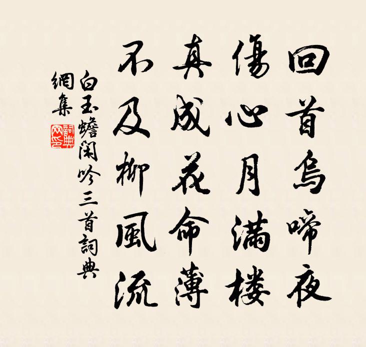 詩詞名句歷史字典書法欣賞書法字典國語詞典說文解字康熙字典古漢語字典標 題 作 者 詩 句 閒吟三首作者:白玉蟾 朝代:宋代閒吟三首原文回首烏啼夜,傷心月滿樓。真成花命薄,不及柳風流。詩詞問答問:閒吟三首的作者是誰?答:白玉蟾問:閒吟三首寫於哪個朝代?答:宋代問:閒吟三首是什麼體裁?答:五絕白玉蟾閒吟三首書法欣賞閒吟三首書法作品詩詞推薦再和楊公濟梅花十絕蘇軾〔宋代〕天教桃李作輿台,故遣寒梅第一開。憑仗幽人收艾納,國香和雨入青苔。垂虹亭觀打魚斫鱠四首楊萬里〔宋代〕鱸魚小底最為佳,一白雙腮是當家。旋看水盤堆白雪,急風吹去片銀花。題浣川戴栩〔宋代〕五十知非雪鬢鮮,尚將疏褊謫塵緣。近來萬境心如洗,笑改斜川作浣川。次德和韻寄談李二丈二首王阮〔宋代〕心在淮山下,身行湘水中。喜拋餘子去,恨不故人同。舊隱勞征夢,浮名任化工。衡陽春漸暖,終欲伴歸鴻。予鄧峒□巽齋歐陽先生為淦鄧峒賦詩以孝子慈文天祥〔宋代〕乃翁猶旅殯,霜露幾焄蒿。日與清江游,雲連桂嶺高。時無郭元振,夢有令狐綯。目斷方田墓,招魂我欲騷。太廟樂章皇帝閣六首周麟之〔宋代〕鳳蓋龍車玉作輪,茲臨紫畦謁三神。已將福酒添眉壽,更祝椒觴一萬春。題無訟堂屏上袁安臥雪圖楊萬里〔宋代〕雲窗避三伏,竹床橫一丈。退食急祖跣,病身聊偃仰。有夢元無夢,似想亦非想。滿堂變冥晦,寒陰起森爽。門外壬子九日登山小酌陸游〔宋代〕老懷多感驚佳節,病骨宜寒喜薄霜。玉膾齏中橙尚綠,彩貓糕上菊初黃。幾年虛負登高興,何許重尋落帽狂?淺酌太令人趙氏輓詞樓鑰〔宋代〕姻婭托三槐,同朝得往來。迎春煩設席,舉壽荷攜杯。京尹俄遭難,都人亦助哀。琅琅垂絕語,烈婦信高哉。送七兄監廟赴南宮兼吾大兄知縣二首周必大〔宋代〕俊兄才學眾人知,富貴功名自有時。海運今看鵬怒擊,韶成始是鳳來儀。狀頭謾詫文階峻,榜眼常多紫綬垂。家有詠毛女陳摶〔宋代〕曾折松枝為寶櫛,又編栗葉作羅襦。有時問著秦宮事,笑撚仙花望太虛。即事口占趙與無〔宋代〕生平夢不到浯溪,此日欣從使者來。天放一晴舒眼界,大江橫上八樽罍。題招提院靜照堂張芻〔宋代〕槜李舊禪扉,叢林自翠微。寺居天外靜,僧向日邊歸。野水涵齊幾,閒雲宿釣磯。庭前祖來意,誰為相依依。示法泉侍者釋宗杲〔宋代〕言前超佛祖,日輪正當午。豁開三要關,一擊塗毒鼓。既發上頭機,莫問千鈞弩。放去絕遮攔,捏聚非回互。咄哉又和郭印〔宋代〕披風擎露曉光寒,玉立霜階照碧鮮。誰遣翩翩離海底,寶釵交映萃群仙。隱居陳羽〔唐代〕稚子新能編筍笠,山妻舊解補荷衣。秋山隔岸清猿叫,湖水當門白鳥飛。緣識宋太宗〔宋代〕年年柳與韶光契,春風便作開花便。黃鶯到處不絕聲,嫩葉芽新生翡翠。【越調】天淨沙商衟〔元代〕寒梅清秀誰知?霜禽翠羽同期,瀟灑寒塘月淡。暗香幽意,一枝雪裡偏宜。剡溪媚壓群芳,玉容偏稱宮妝,暗惹詩借樓王諶〔宋代〕借得小樓聊寄跡,夜深猶自未扃扉。鼠搖暗壁驚人夢,螢度破窗粘客衣。舊隱圖書從水汎,後園松菊與心違。思量楠樹為風雨所拔嘆杜甫〔唐代〕倚江楠樹草堂前,故老相傳二百年。誅茅卜居總為此,五月仿佛聞寒蟬。東南飄風動地至,江翻石走流雲氣。乾排名句推薦芰荷迭映蔚,蒲稗相因依。謝靈運《石壁精舍還湖中作》 問君何能爾?心遠地自偏。陶淵明《飲酒·其五》 知道自家是何等身份,則不敢虛驕矣王永彬《圍爐夜話·第三六則》 紛紛暮雪下轅門,風掣紅旗凍不翻。岑參《白雪歌送武判官歸京》 薄衾小枕涼天氣,乍覺別離滋味。柳永《憶帝京·薄衾小枕涼天氣》 強整繡衾,獨掩朱扉,枕簟為誰鋪設。阮逸女《花心動·春詞》 將軍角弓不得控,都護鐵衣冷難著。岑參《白雪歌送武判官歸京》 以陽求陰,苞以德也;以陰結陽,施以力也。王詡《鬼谷子·捭闔》 丈夫不能再辱。班固《漢書·傳·李廣蘇建傳》 悵恨不逢如意酒。尋思難值有情人。晏幾道《浣溪沙·閒弄箏弦懶系裙》