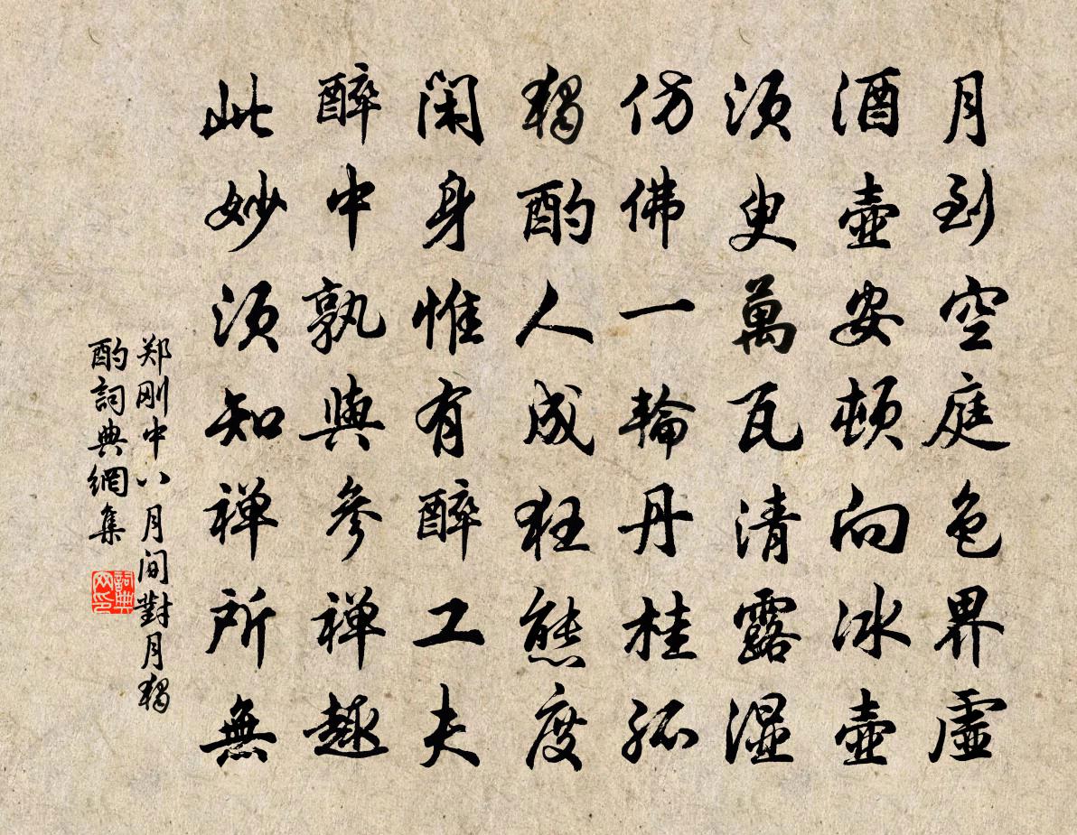 詩詞名句歷史字典書法欣賞書法字典國語詞典說文解字康熙字典古漢語字典標 題 作 者 詩 句 八月間對月獨酌作者:鄭剛中 朝代:宋代八月間對月獨酌原文月到空庭色1~1界虛,酒壺安頓向冰壺。須臾萬瓦清露濕,仿佛一輪丹桂孤。獨酌人成狂態度,閒身惟有醉工夫。醉中孰與參禪趣,此妙須知禪所無。詩詞問答問:八月間對月獨酌的作者是誰?答:鄭剛中問:八月間對月獨酌寫於哪個朝代?答:宋代鄭剛中八月間對月獨酌書法欣賞八月間對月獨酌書法作品詩詞推薦點絳唇方千里〔宋代〕閒蕩蘭舟,翠娥仙袂風中舉。鴛鴦深浦。綠暗曾來路。留戀荷香,薄晚慵歸去。還相顧。練波澄素。月上潮生處。南歌子歐陽炯〔唐代〕錦帳銀燈影,紗窗玉漏聲。迢迢永夜夢難成,愁對小庭秋色,月空明。早起陳紀〔宋代〕星斗淡欲落,銀河白向斜。人間獨夢蟻,樹杪已聞鴉。池水偷山影,朝陽禪月華。升沈無限事,秋草滿天涯。下第歸後李伯輝李景魏索近詩樂雷發〔宋代〕吟遍吳頭楚尾春,多漸詞客問征塵。振衣天目尋黃獨,濯足湘江詠白苹。宋五已慚稱進士,陳三何用作詩人。錦囊四皓范祖禹〔宋代〕南山石壁陵蒼蒼,中有四老眉如霜。中原龍虛困格門,九霄鸞鳳高飄翔。赤精斬蛇入鹹陽,南極老人轉遁藏。一朝答京西提刑張司封次韻宋祁〔宋代〕乞得二千石,終非循吏才。霜蓬根易動,籠鳥翅難開。夢寤慚封邑,陶埏仰鉉台。報言殊麗藻,虛附驛筩回。草蟲圖仇遠〔宋代〕昨夜南山雷雨霽,蟄室初開百蟲起。草夭菜秀蒲柳長,生意森然隨氣使。陰陽變態足纖巧,分得余妍歸畫史。野蜂頌證道歌證道歌釋印肅〔宋代〕萬兩黃金也消得,道人有甚相交涉。家中祖代沒分文,廣度河沙三界客。偈頌八十七首釋慧開〔宋代〕不是護身符,亦非斷貫索。直饒鼻孔遼天,也被這個穿卻。無門老漢還免得麽,卻請維那下個註腳雁汊東守風四首陳造〔宋代〕枉渚八日留,池口百里近。東風翻白波,寸步不容進。如許天吳怒,頗訝地軸震。崩騰雪山飛,膽掉老眼暉。豈似二月十五日遊興教寺劉黻〔宋代〕一僧癯似竹,結坐對觀音。但見夕陽過,不知春事深。茗芳留野客,樹老集巢禽。卓錫泉千古,冷然照此心。和高子文秋興宇文虛中〔金代〕搖落山城暮,棲遲客館幽。葵衰前日雨,菊老異鄉秋。自信浮沉數,仍懷顧望愁。蜀江歸棹在,浩蕩逐春鷗。高冠獨步王鎡〔宋代〕棲桀棲塒歲月深,咿咿喔喔放豪音。九苞彩色丹山鳳,春暖還須報上林。想得韓翃〔唐代〕兩重門裡玉堂前,寒食花枝月午天。想得那人垂手立,嬌羞不肯上鞦韆。郊行小憩陳杰〔宋代〕嵐氣深籠屋,機聲細出林。落花流水逕,芳草短牆陰。啼鳥招人處,斜陽過客心。明朝坐曹去,拄頰盼遙岑。偈頌二十二首釋道生〔宋代〕時節循環四月一,大道何曾有得失。夜來針眼魚兒,吞卻新昌石佛。阿呵呵,識不識,明眼衲僧跳不出。雨中惜海棠花四首廖行之〔宋代〕東君何事妒花妍,不遣春風一笑嫣。邀動芳心愁萬縷,盈盈含恨雨中天。潤州聽暮角(一作晚泊潤州聞角)李涉〔唐代〕江城吹角水茫茫,曲引邊聲怨思長。驚起暮天沙上雁,海門斜去兩三行。山中楚辭江淹〔南北朝〕予將禮於太一。乃雄劍兮玉鉤。日華粲於芳閣。月金披於翠樓。舞燕趙之上色。激河淇之名謳。薦西海之異品。傾三絕句賦和靖梅曹彥約〔宋代〕人如和靖清難比,花似寒梅秀可餐。卻問荔支何所似,江瑤初雪水日盤。名句推薦理無常是,事無常非。列子及其弟子《列子·說符》 百年歌自苦,未見有知音。杜甫《南征》 花枝出建章,鳳管發昭陽。皇甫冉《婕妤怨》 聚斂者,召寇、肥敵、亡國、危身之道也荀子《荀子·王制》 宣父猶能畏後生,丈夫未可輕年少。李白《上李邕》 制在己曰重,不離位曰靜。重則能使輕,靜則能使躁。韓非及後人《韓非子·喻老》 丈夫志,當景盛,恥疏閒。蘇舜欽《水調歌頭·滄浪亭》 君家何處住,妾住在橫塘。崔顥《長干行·君家何處住》 捲地風來忽吹散,望湖樓下水如天。蘇軾《六月二十七日望湖樓醉書》 紫菊宜新壽,丹萸辟舊邪。趙彥昭《奉和九日幸臨渭亭登高應制》