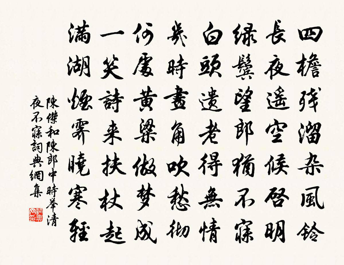 詩詞名句歷史字典書法欣賞書法字典國語詞典說文解字康熙字典古漢語字典標 題 作 者 詩 句 和陳郎中時舉清夜不寐作者:陳杰 朝代:宋代和陳郎中時舉清夜不寐原文四檐殘溜雜風鈴,長夜遙空候啟明。綠鬢望郎猶不寐,白頭遺老得無情。幾時畫角吹愁徹,何處黃粱做夢成。一笑詩來扶杖起,滿湖煙霽曉寒輕。詩詞問答問:和陳郎中時舉清夜不寐的作者是誰?答:陳杰問:和陳郎中時舉清夜不寐寫於哪個朝代?答:宋代陳杰和陳郎中時舉清夜不寐書法欣賞和陳郎中時舉清夜不寐書法作品詩詞推薦送唐述之赴廷對魏了翁〔宋代〕快著青冥輭玉鞭,穩騎騄耳踏雲煙。便持全蜀無雙譽,去聽賓臚第一傳。眾所望君皆爾耳,人之好我豈云然。古來登蒲澗寺後二岩三首李群玉〔唐代〕五仙騎五羊,何代降茲鄉。澗有堯年韭,山余禹日糧。樓台籠海色,草樹發天香。浩嘯波光里,浮溟興甚長。行盡偈頌一百二十三首釋崇岳〔宋代〕藉手行拳,驚群動眾。龍門上客,未舉先知。若不然者,靈隱失利。秦樓月 以上六首見中州樂府趙秉文〔金代〕簫聲苦。簫聲吹斷夷山雨。夷山雨。人空不見,吹台歌舞。危亭目極傷平楚。斷霞落日懷千古。懷千古。一杯還酹書懷陸游〔宋代〕萬里馳驅坐一飢,自憐無計脫塵鞿。身留幕府還家少,眼亂文書把酒稀。客路更逢秋色晚,故山空有夢魂歸。芋羹漁歌子 題松澤西亭佚名〔宋代〕一葉虛舟一副竿。瞭然無事坐煙灘。忘得喪,任悲歡。卻教人喚有多和武三思於天中寺尋復禮上人之作蘇味道〔唐代〕藩戚三雍暇,禪居二室隈。忽聞從桂苑,移步踐花台。敏學推多藝,高談屬辯才。是非寧滯著,空有掠嫌猜。五行送奔醫時亭往攸縣省覲楊萬里〔宋代〕雪恰來時子恰行,白雲飛邊雙眼明。阿母幾年不相見,阿兄喚渠來作伴。探囊半粒黃金丹,湘南小兒開病顏。江西雲溪雜詠郭印〔宋代〕寒潭深百尺,潛物晦其真。雨施時為潤,淵居每自珍。飛騰應有道,變化豈無神。直待功成日,驅雲上紫宸。蕭尚書縱目樓章潁〔宋代〕深居無事即神仙,況閱丹經第幾篇。桂樹花開臨舊國,榴皮書字徹新磚。瓊書玉篆行將見,鐵畫銀鉤粲可鐫。他日失調名佚名〔宋代〕便是監商孟客兒。續八詠千年增舊觀唐仲友〔宋代〕增舊觀,舊觀已雲美。棟宇未翬飛,賢侯為興起。昔時兮清賞,昔日兮清文。揮弦兮歸雁,隱几兮浮雲。八篇合綺和答斯遠因梅見屬三首趙蕃〔宋代〕梅時寄我詩,梅月方能至。迢迢隔三湘,莽莽非一水。褰裳欲何之,浩蕩正如此。景福東廂詩同景仁寄修書諸同舍司馬光〔宋代〕烈火非不猛,不耗豐鍊金。寒霜非不嚴,不雕竹柏林。小人勢利合,傾覆無常心。君子道德親,白道猶視今。諸君題宿松薤山寺王之道〔宋代〕小驛隳頹不見容,著鞭東走梵王宮。怪禽落日休相恐,五里松篁一徑通。送王少府歸杭州韓翃〔唐代〕歸舟一路轉青蘋,更欲隨潮向富春。吳郡陸機稱地主,錢塘蘇小是鄉親。葛花滿把能消酒,梔子同心好贈人。早晚塞上曲周朴〔唐代〕一陣風來一陣砂,有人行處沒人家。黃河九曲冰先合,紫塞三春不見花。失調名佚名〔宋代〕自有松篁為伴侶。題採石渡胡璞〔宋代〕抗議金鑾反見讎,一杯蟬蛻此江頭。當時醉弄波間月,今作寒光萬里流。新年自唱自和戴復古〔宋代〕聖朝開寶曆,淳佑四年春。生自前丁亥,今逢兩甲辰。黃粲一夢覺,青鏡二毛新。七十八歲叟,乾坤有幾人。名句推薦寒笛對京口,故人在襄陽。劉昚虛《暮秋揚子江寄孟浩然》 直道相思了無益,未妨惆悵是清狂。李商隱《無題·重幃深下莫愁堂》 蓋鍾子期死,伯牙終身不復鼓琴。班固《漢書·傳·司馬遷傳》 落梅庭榭香,芳草池塘綠。晏幾道《生查子·落梅庭榭香》 野者上,園者次。陸羽《茶經·一之源》 其身正,不令而行;其身不正,雖令不從。孔子弟子《論語·子路篇》 砧面瑩,杵聲齊。搗就征衣淚墨題。賀鑄《杵聲齊·砧面瑩》 雁啼紅葉天,人醉黃花地,芭蕉雨聲秋夢裡。張可久《清江引·秋懷》 巧偽不如拙誠顏之推《顏氏家訓·名實篇》 英雄一去豪華盡,惟有青山似洛中。許渾《金陵懷古》