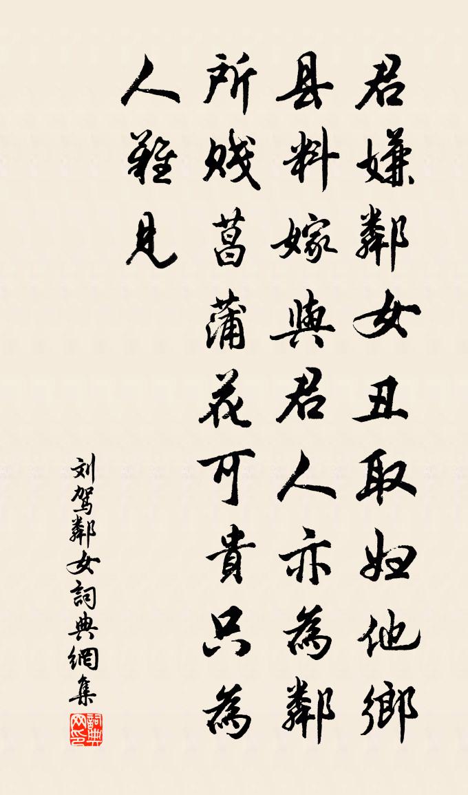 詩詞名句歷史字典書法欣賞書法字典國語詞典說文解字康熙字典古漢語字典標 題 作 者 詩 句 鄰女作者:劉駕 朝代:唐代鄰女原文君嫌鄰女丑,取婦他鄉縣。料嫁與君人,亦為鄰所賤。菖蒲花可貴,只為人難見。詩詞問答問:鄰女的作者是誰?答:劉駕問:鄰女寫於哪個朝代?答:唐代問:鄰女是什麼體裁?答:五古劉駕鄰女書法欣賞鄰女書法作品注釋全唐詩:卷585-26詩詞推薦句蕭德藻〔宋代〕疾走建德國,乃為淵明先。晨炊光口砦楊萬里〔宋代〕泊船光口薦晨炊,野飯匆匆不整齊。新摘柚花熏熟水,旋撈萵苣浥生虀。盡教坡老食無肉,未害山公醉似泥。過了毛國鎮生日二絕蘇轍〔宋代〕聞公歸橐尚空虛,近送楞嚴十卷書。心地本無生滅處,定逢生日亦如如。睡起晏坐白居易〔唐代〕後亭晝眠足,起坐春景暮。新覺眼猶昏,無思心正住。淡寂歸一性,虛閒遺萬慮。瞭然此時心,無物可譬喻。本是偈頌三十八首釋如淨〔宋代〕解地祥和布袋頭,虛空豁達逞風流。去赤得,住亦得,大用現前無軌則。題越王樓寄獻中丞使君劉暌〔唐代〕朱軒迥壓碧煙州,昔歲賢王是勝游。山簇劍峰朝闕遠,水如巴字繞城流。人間物象分千里,天上笙歌醉五侯。今日題上饒半月岩四絕胡寅〔宋代〕瓊樓玉宇匝天開,織女天孫靜往來。月姊故應羞老退,譴除私館墮岩隈。魯望以躬掇野蔬兼示雅什,用以酬謝皮日休〔唐代〕杖擿春煙暖向陽,煩君為我致盈筐。深挑乍見牛唇液,細掐徐聞鼠耳香。紫甲采從泉脈畔,翠牙搜自石根傍。雕胡偈頌二十三首釋雲岫〔宋代〕西風凋木葉,蟋蟀啼壞牆。明月照破屋,露冷黃金床。藏經一卷,儒書一章。讀不成句,書不成行,天空地闊誰商被旨暫攝四明已具舟而雪作王誠之有詩相餞次虞儔〔宋代〕剡溪風雪正紛紛,暗想清游已目存。頗怪扁舟遽乘興,應緣坐席不容溫。海圻聊爾夸千騎,帳底何如具一尊。回首送張山甫秘校歸緱氏梅堯臣〔宋代〕去年來折桂,今年來娶婦。得意春風前,還家寒食後。蓬巷鬧雞犬,藤花蔭井臼。緱山白醪醇,重酌高堂壽。謝公輓詞三首歐陽修〔宋代〕始見行春◇,俄聞引葬簫。笑言猶在耳,魂魄遂難招。天象奎星暗,辭林玉樹凋。朔風吹霰雪,銘旐共飄飄。自長寧阡過靈泉兄墓勢黃經從隈支以歸魏了翁〔宋代〕晨策犯層巔,危如峭壁緣。溪明人在地,路絕馬行天。松倚露雲立,稻依霜雨眠。不知歲年晚,撫事亦悠然。滌愫鄭樵〔宋代〕潛天以不策,潛心以不手。天人既和同,飛潛均不朽。吾生既病勞,未敢輕俯首。久幽不改操,旦夕謀杯酒。岷峨琉璃砲燈中魚葉茵〔宋代〕頭角未崢嶸,潛宮號水晶。游時雖逼窄,樂處在圓明。有火疑燒尾,無波可動情。一朝開混沌,變化趁雷轟。讀楞嚴經郭印〔宋代〕學道證聲聞,習氣猶未斷。百生恩愛情,會遇終惱亂。阿難佛寵弟,亦遭 * 難。神咒攝來歸,宿業堅冰泮。快演謝季左司筆墨晁說之〔宋代〕韓揚州,蕭劍州,相忘終日夢悠悠。何如微季掾三府,國譽鄉評坐以收。不忘筆墨高人興,為道明珠無昧不。花驢兒王冕〔元代〕花驢兒,渡江踏遍江南土。正值江南無馬時,驢兒得志雄威武,況是能解花門語。江南淫雨二百日,洪濤巨浪掀天和會之二絕杜范〔宋代〕飣虀{左竹下芻}釀挹仙霞,味到詩情分外佳。應把梅花應彭澤,不辭漉酒污巾紗。去婦詞 ( 一作顧況詩 )李白〔唐代〕古來有棄婦,棄婦有歸處。今日妾辭君,辭君遣何去。本家零落盡,慟哭來時路。憶昔未嫁君,聞君卻周旋。綺羅名句推薦馬上牆頭,縱教瞥見,也難相認晁端禮《水龍吟·詠月》 志之難也,不在勝人,在自勝。韓非及後人《韓非子·喻老》 木蘭舟上,何處吳娃越艷:藕花紅照臉。孫光憲《河傳·風颭》 秋來相顧尚飄蓬,未就丹砂愧葛洪。杜甫《贈李白》 曉戰隨金鼓,宵眠抱玉鞍。李白《塞下曲六首·其一》 權者,人莫離也。來俊臣《羅織經·控權卷第四》 黃河九天上,人鬼瞰重關。元好問《水調歌頭·賦三門津》 芳樹籠秦棧,春流繞蜀城。李白《送友人入蜀》 見侮而不鬥,辱也!公孫龍《公孫龍子·跡府》 林壑斂暝色,雲霞收夕霏。謝靈運《石壁精舍還湖中作》
